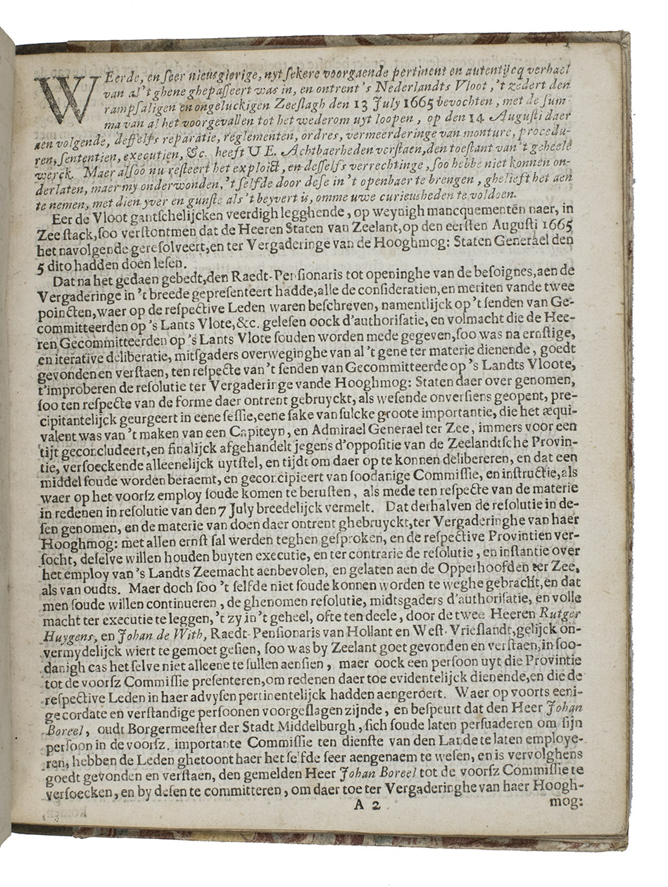 Rare pamphlet written by an anonymous author, discussing the fascinating Battle of Vågen, the main port area of neutral Bergen in Norway, in August 1665 during the Second Anglo-Dutch War (1665-1667), including its background and aftermath. The Second Anglo-Dutch war was a war at sea, caused by conflicts in colonial territories of the Dutch Republic and England. This naval war consisted mainly of protecting their own merchant ships, capturing enemy ships and trying to sink mutual warships. The Battle of Vågen was an important naval battle between a rich treasure fleet of the Dutch East India Company (VOC) and an English flotilla of warships.