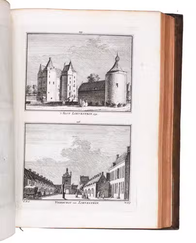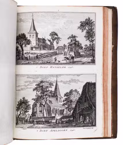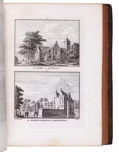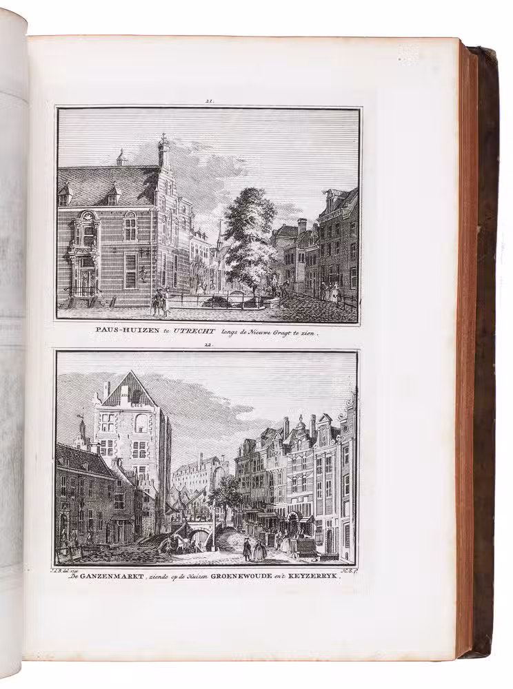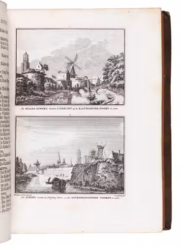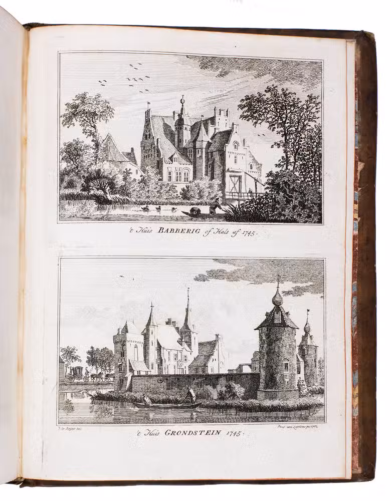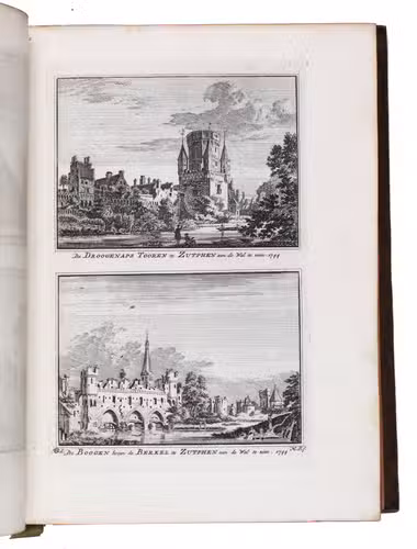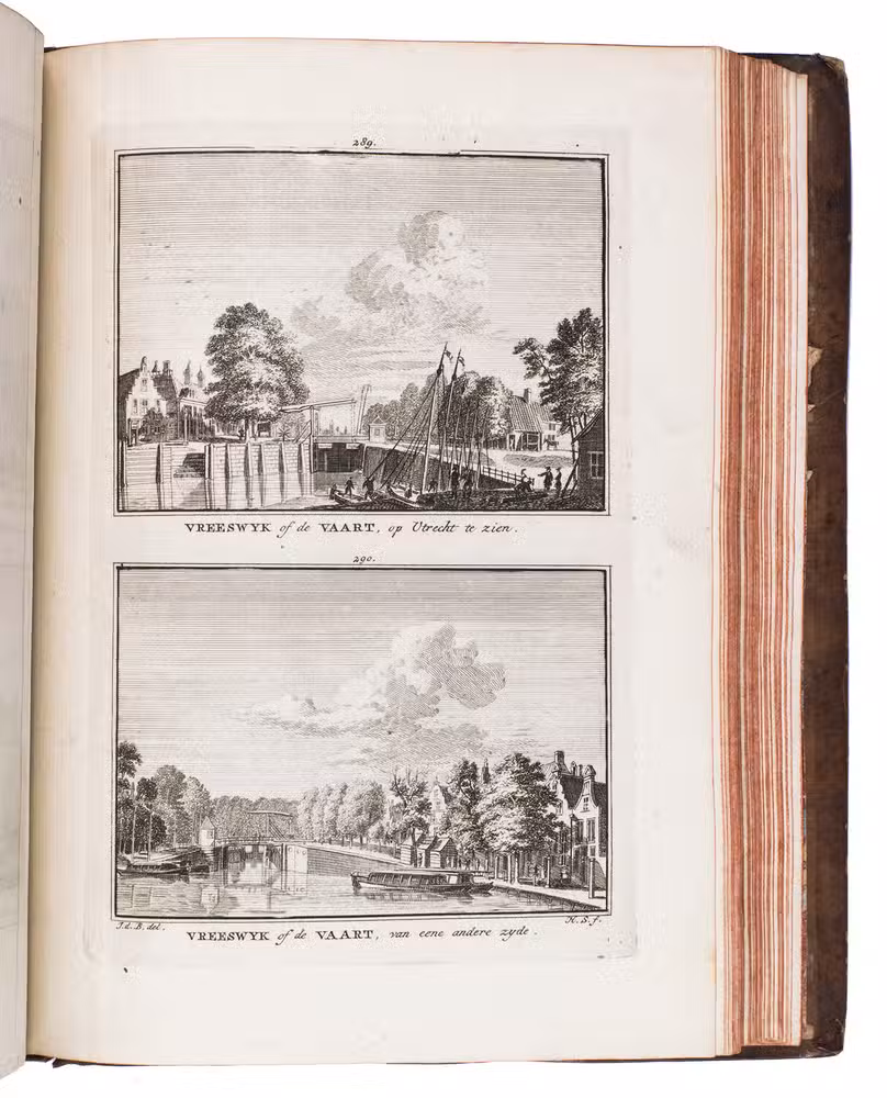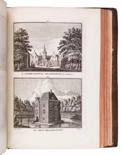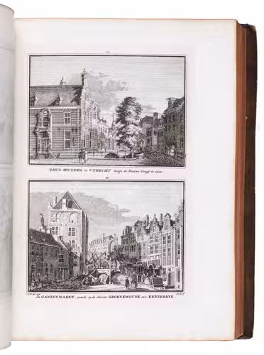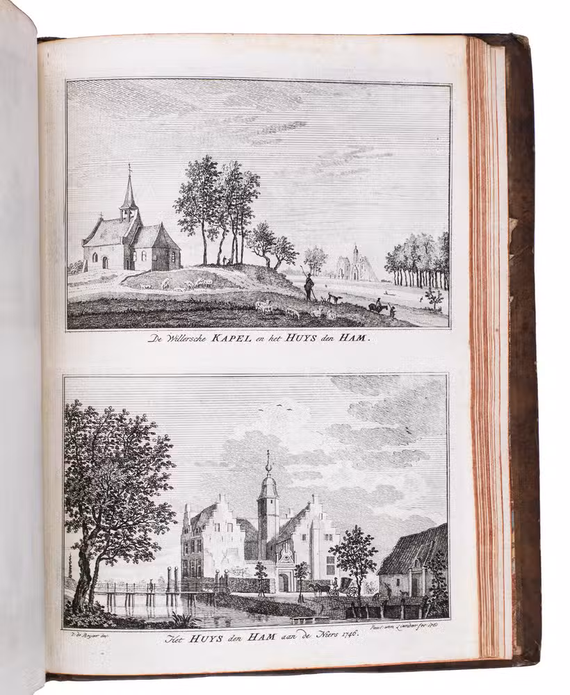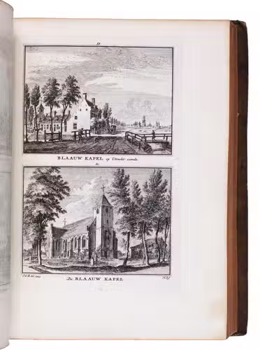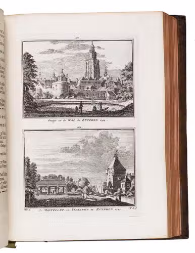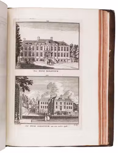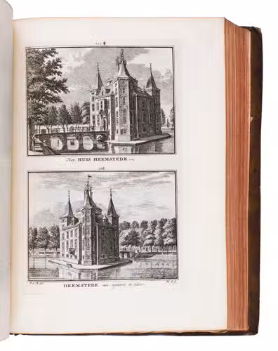 Each volume is dedicated to an individual province or region, but three are dedicated to Utrecht only. After Tirion's death, the original plan to depict every region individually was changed. The work contains plates and views of buildings and scenery in the provinces of Noord-Holland, Gelderland, Rijnland, Delfland, Zuid-Holland, Zeeland, and Utrecht. The 843 beautiful views were made by some of the most famous Dutch artists of the time: Hendrik Spilman, Hendrik de Winter, A. van Swyndrecht, A. van Broekhuizen, Cornelis Pronk, Abraham de Haan, and Jan de Beijer.With a brown paper shelf mark label mounted at the head of the spine of the first volume ("58"). The edges and corners of the boards are somewhat scuffed, the boards are slightly rubbed, lacking a small chip of leather at the foot of the spine of the second volume. Some of the title-pages are browned, but otherwise internally very clean, with only an occasional stain. Overall in very good condition. Ad 1: STCN 204508606 (24 copies, of which 15 incomplete); Tiele 1034; ad 2: STCN 316060445 (2 copies).