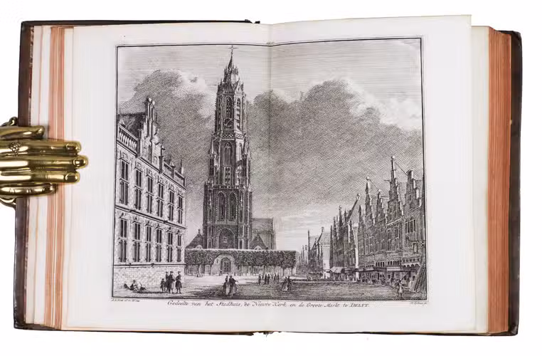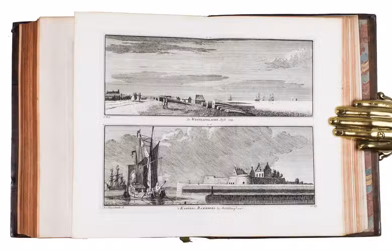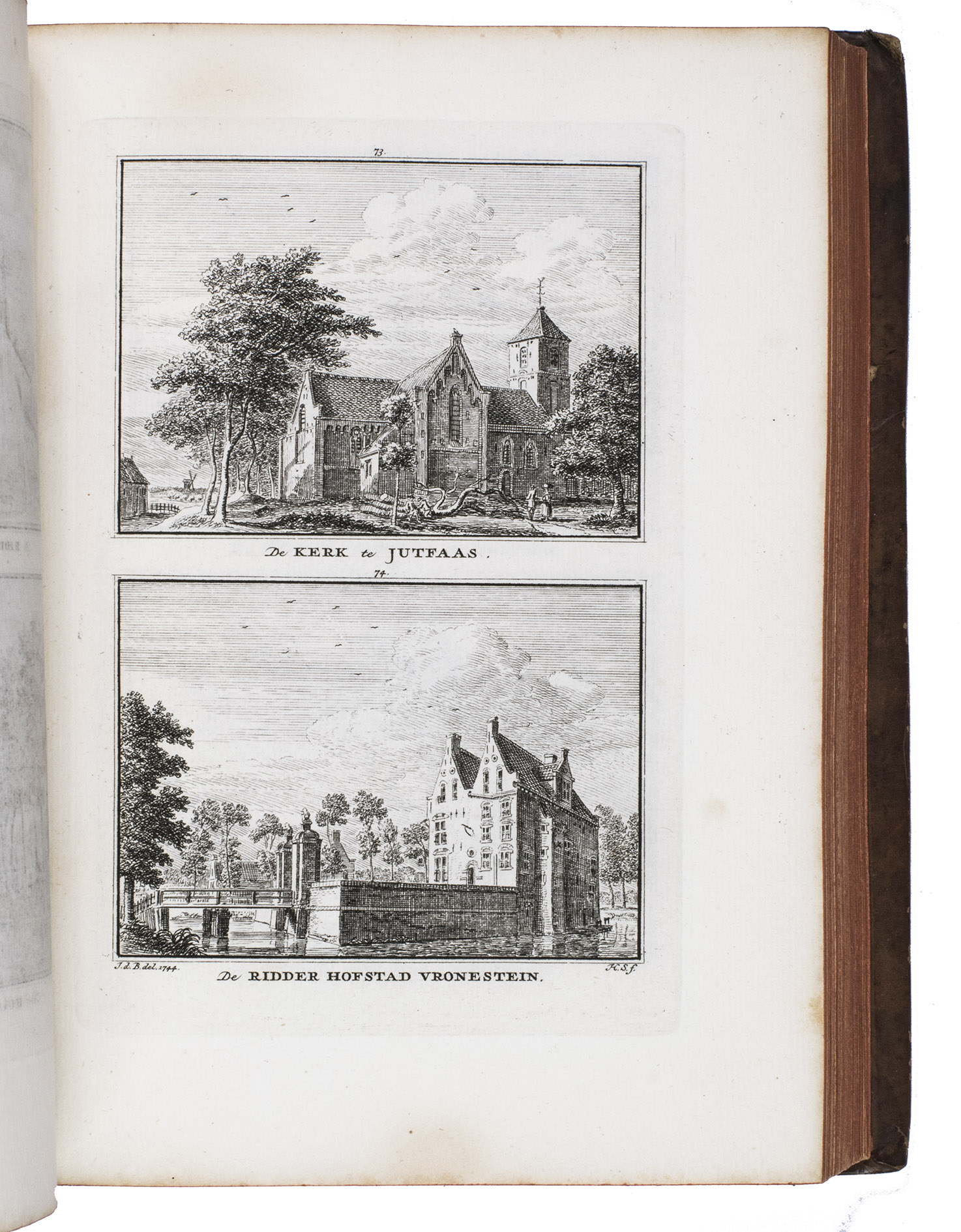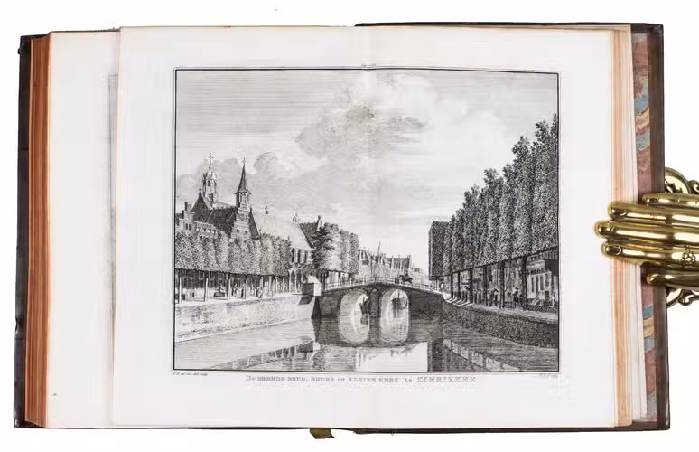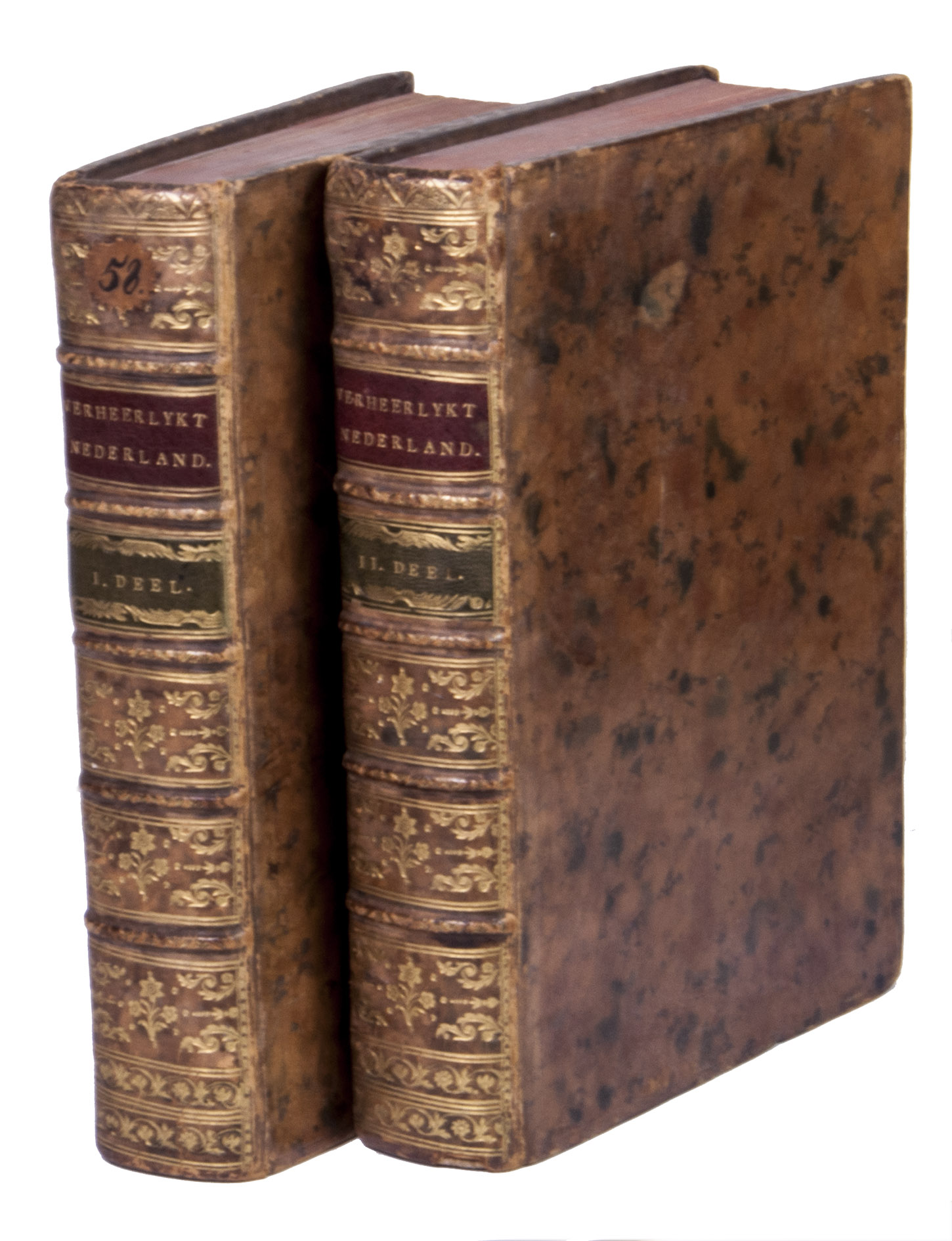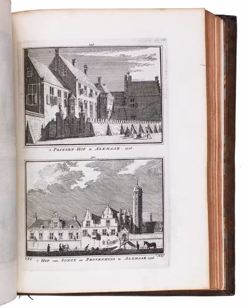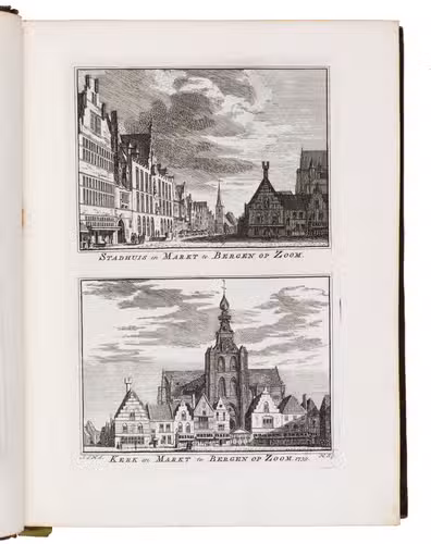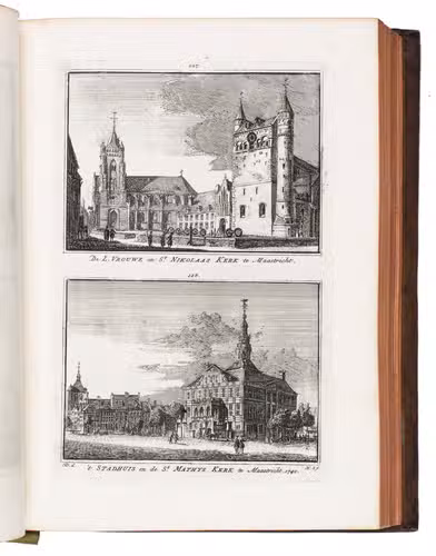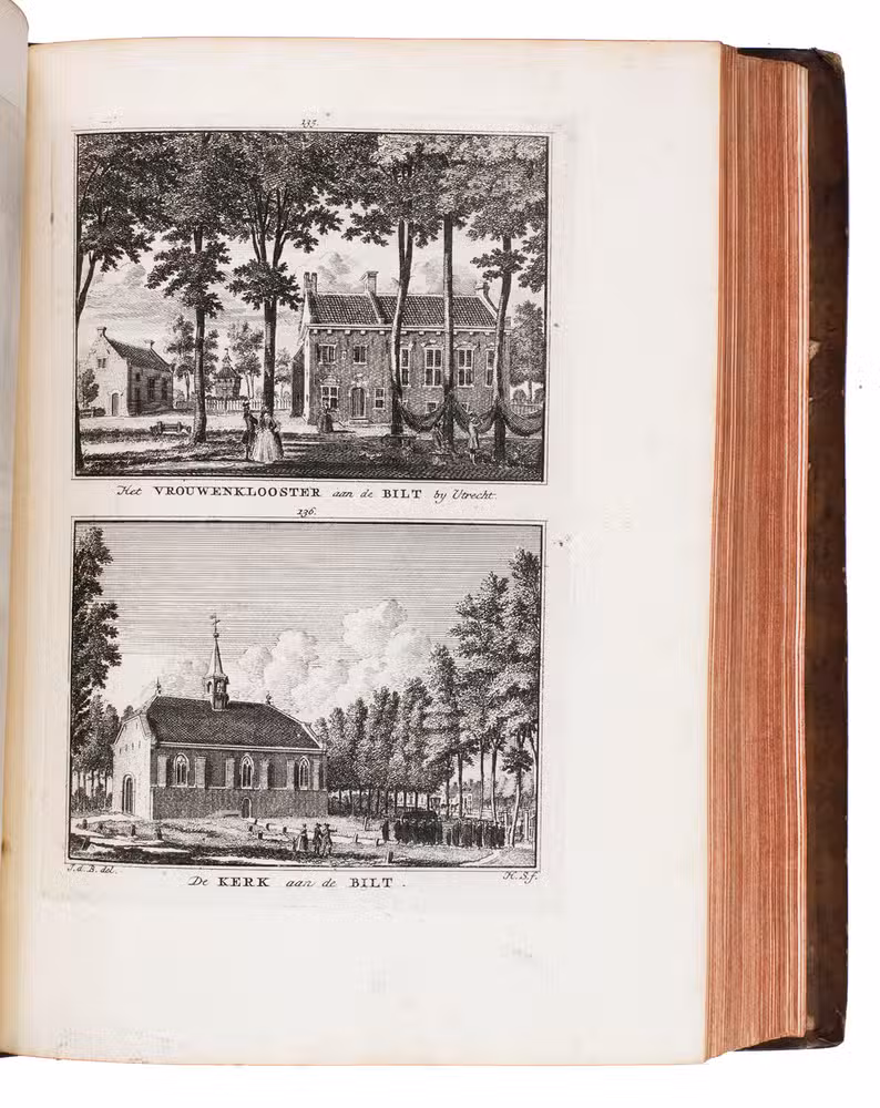 Each volume is dedicated to an individual province or region, but three are dedicated to Utrecht only. After Tirion's death, the original plan to depict every region individually was changed. The work contains plates and views of buildings and scenery in the provinces of Noord-Holland, Gelderland, Rijnland, Delfland, Zuid-Holland, Zeeland, and Utrecht. The 843 beautiful views were made by some of the most famous Dutch artists of the time: Hendrik Spilman, Hendrik de Winter, A. van Swyndrecht, A. van Broekhuizen, Cornelis Pronk, Abraham de Haan, and Jan de Beijer.With a brown paper shelf mark label mounted at the head of the spine of the first volume ("58"). The edges and corners of the boards are somewhat scuffed, the boards are slightly rubbed, lacking a small chip of leather at the foot of the spine of the second volume. Some of the title-pages are browned, but otherwise internally very clean, with only an occasional stain. Overall in very good condition. Ad 1: STCN 204508606 (24 copies, of which 15 incomplete); Tiele 1034; ad 2: STCN 316060445 (2 copies).