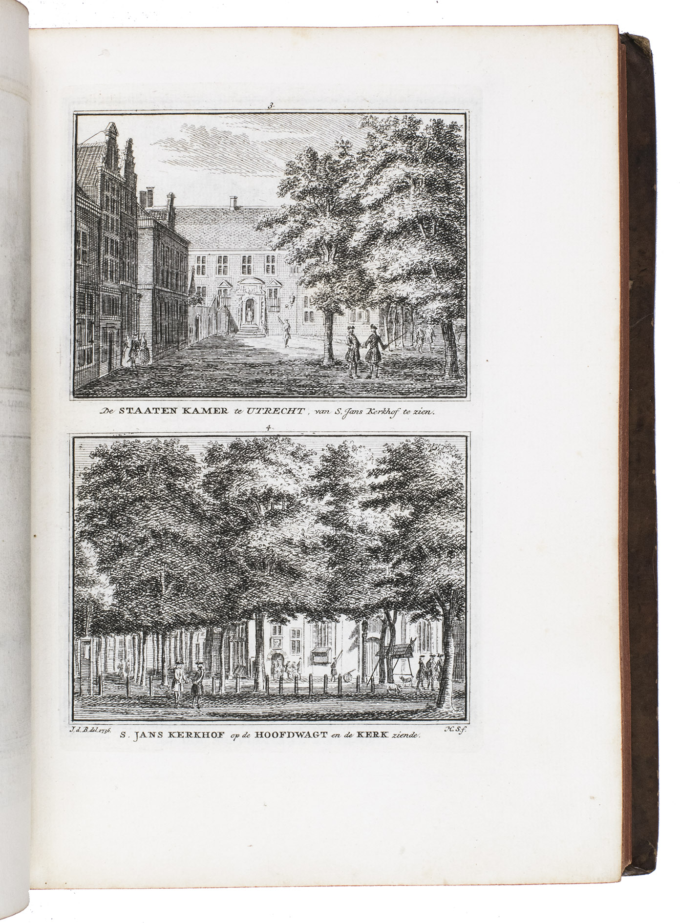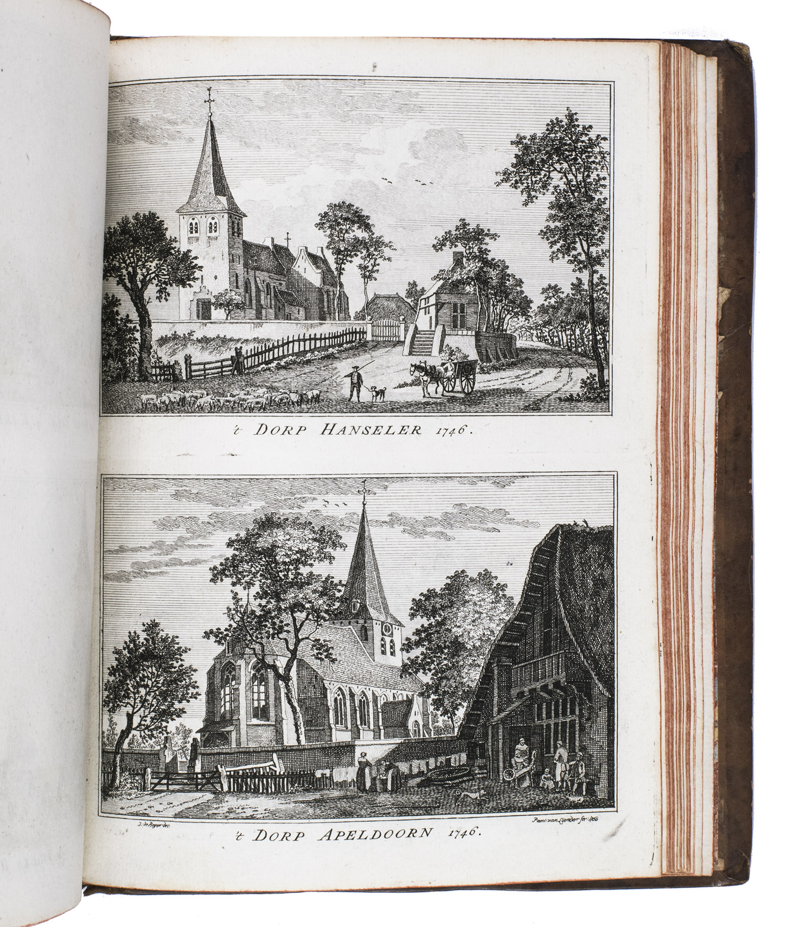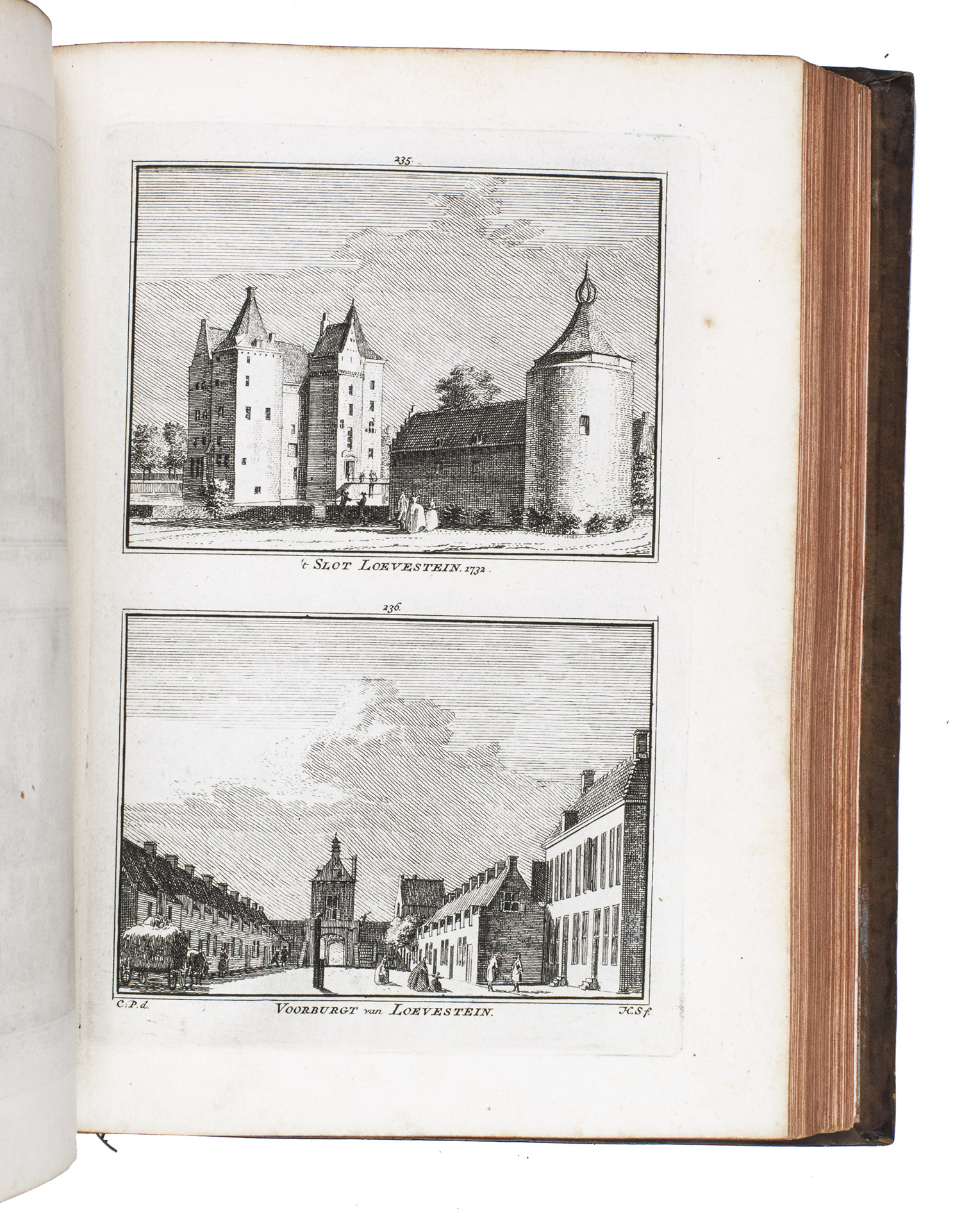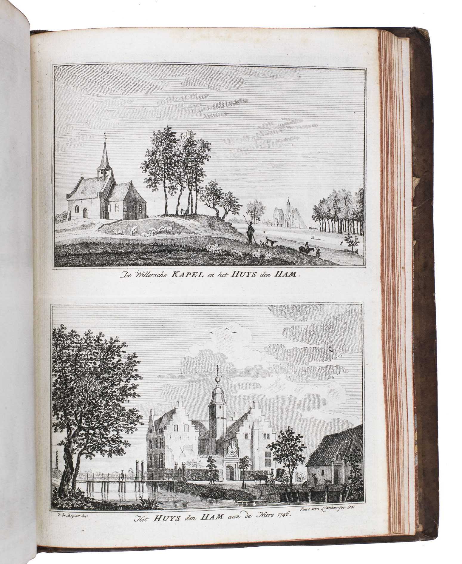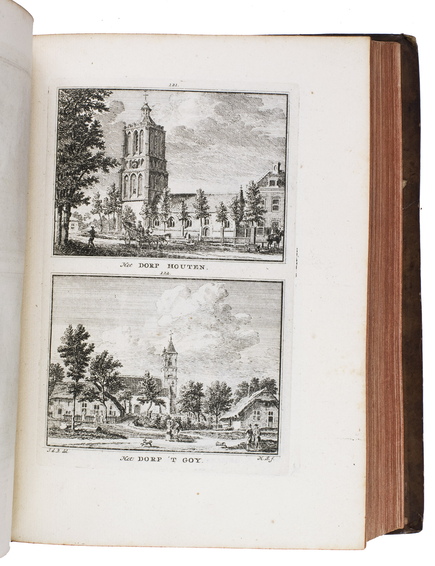 Each volume is dedicated to an individual province or region, but three are dedicated to Utrecht only. After Tirion's death, the original plan to depict every region individually was changed. The work contains plates and views of buildings and scenery in the provinces of Noord-Holland, Gelderland, Rijnland, Delfland, Zuid-Holland, Zeeland, and Utrecht. The 843 beautiful views were made by some of the most famous Dutch artists of the time: Hendrik Spilman, Hendrik de Winter, A. van Swyndrecht, A. van Broekhuizen, Cornelis Pronk, Abraham de Haan, and Jan de Beijer.With a brown paper shelf mark label mounted at the head of the spine of the first volume ("58"). The edges and corners of the boards are somewhat scuffed, the boards are slightly rubbed, lacking a small chip of leather at the foot of the spine of the second volume. Some of the title-pages are browned, but otherwise internally very clean, with only an occasional stain. Overall in very good condition. Ad 1: STCN 204508606 (24 copies, of which 15 incomplete); Tiele 1034; ad 2: STCN 316060445 (2 copies).