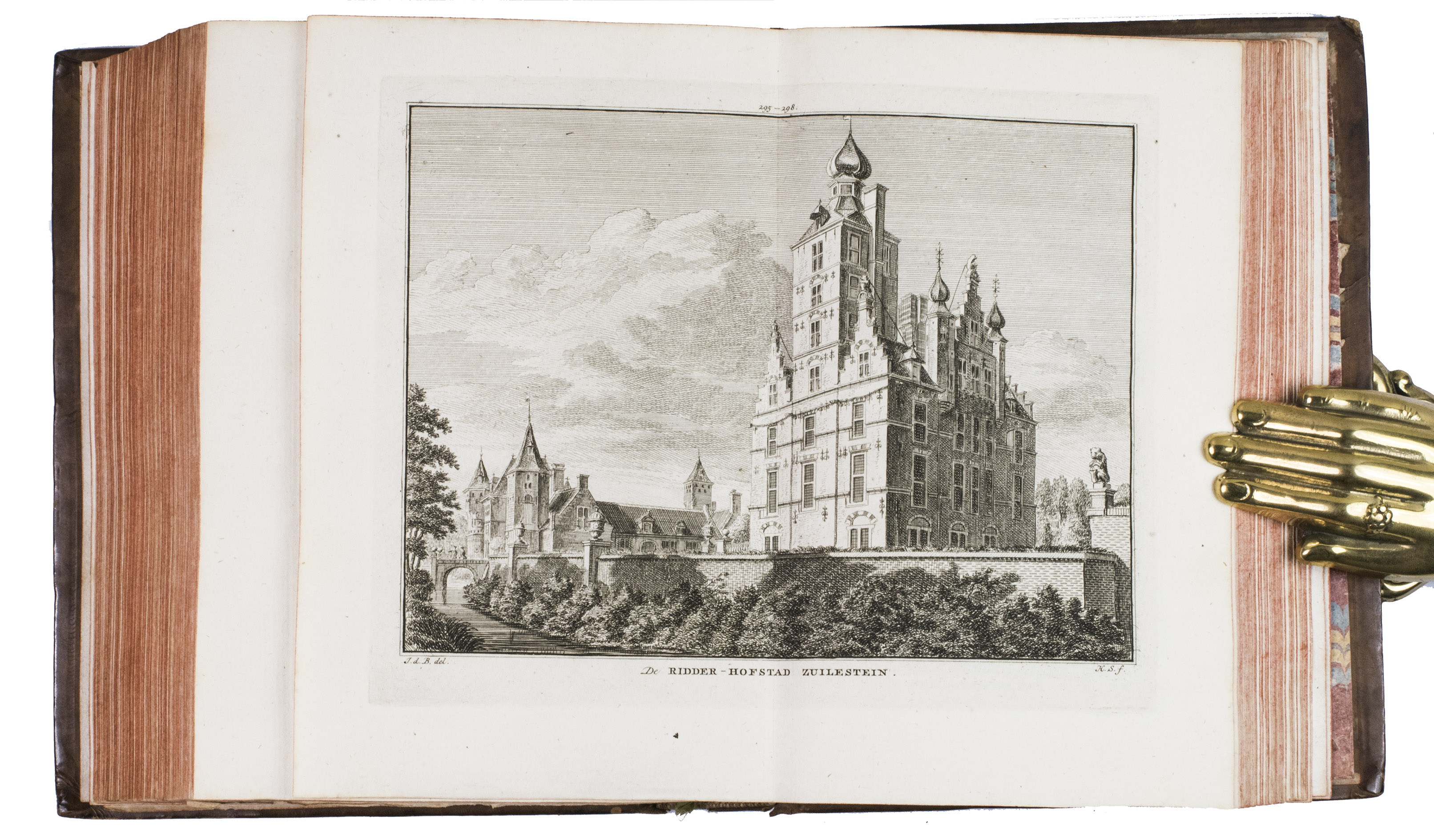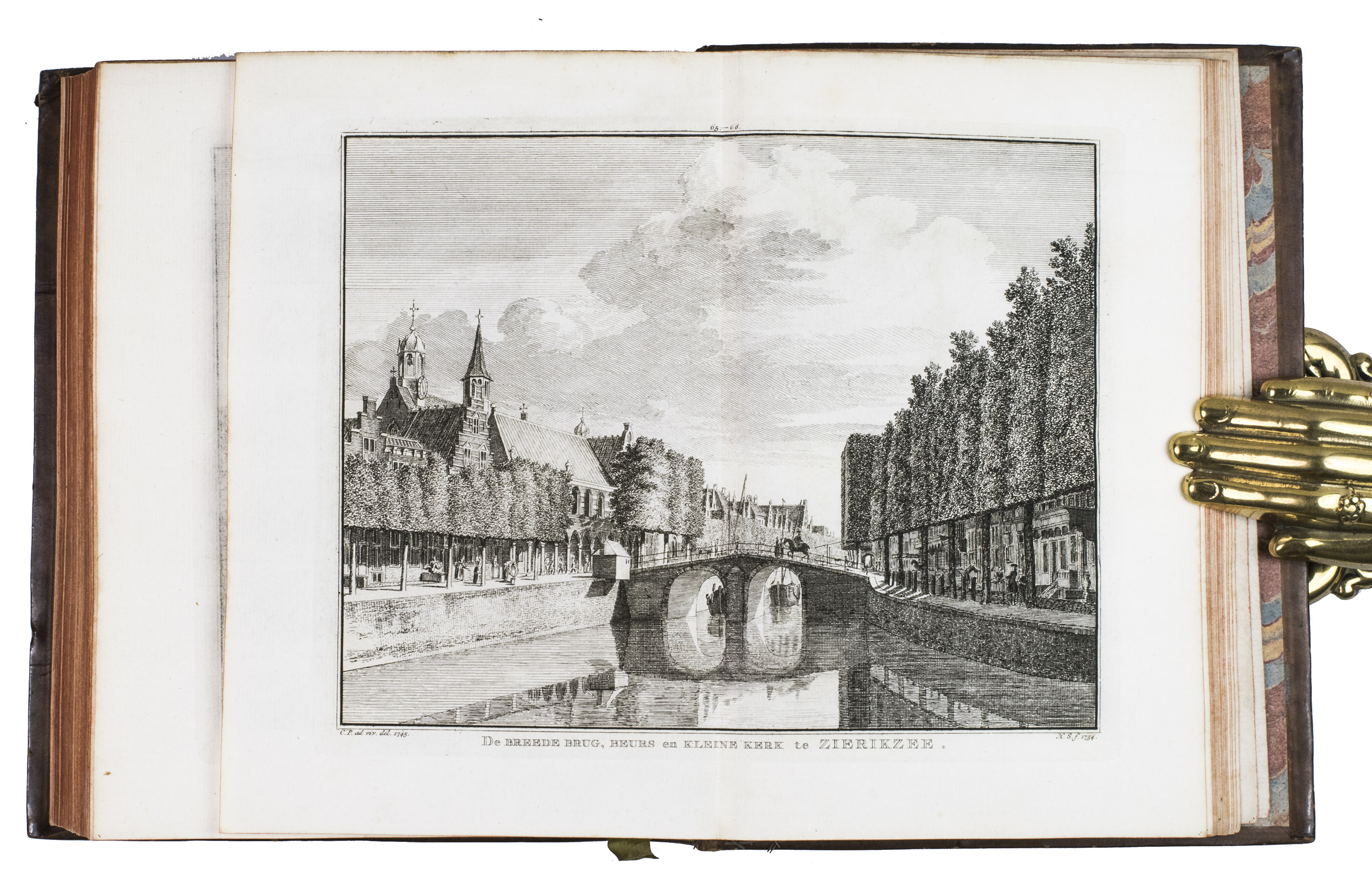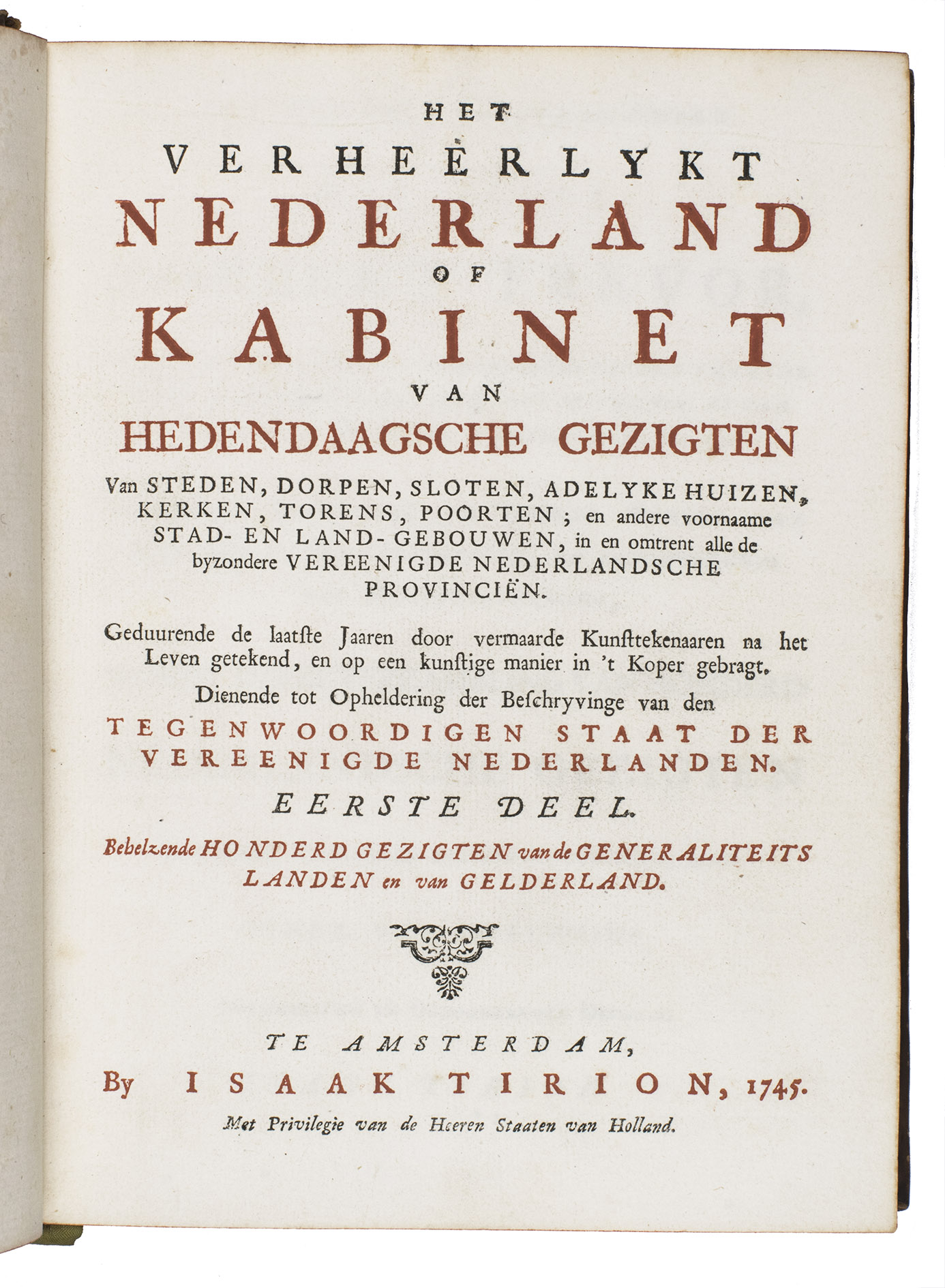 Amsterdam, Isaak Tirion and widow of Isaak Tirion, 1745-1774. 10 parts in 2 volumes. 4to. With 843 engraved views, mostly 2 views per plate, some double page, the title-page of the first part is printed in red and black. With: (2) [IDEM]. Het verheerlykt Kleefschland of kabinet van Kleefsche oudheden en gezichten van steden, dorpen, sloten, adelyke huizen, kerken, torens, poorten; en andere stad- en land-gebouwen in Kleefschland (...) dienende tot een aanhangzel van het verheerlykt Nederland, by I. Tirion uitgegeeven.