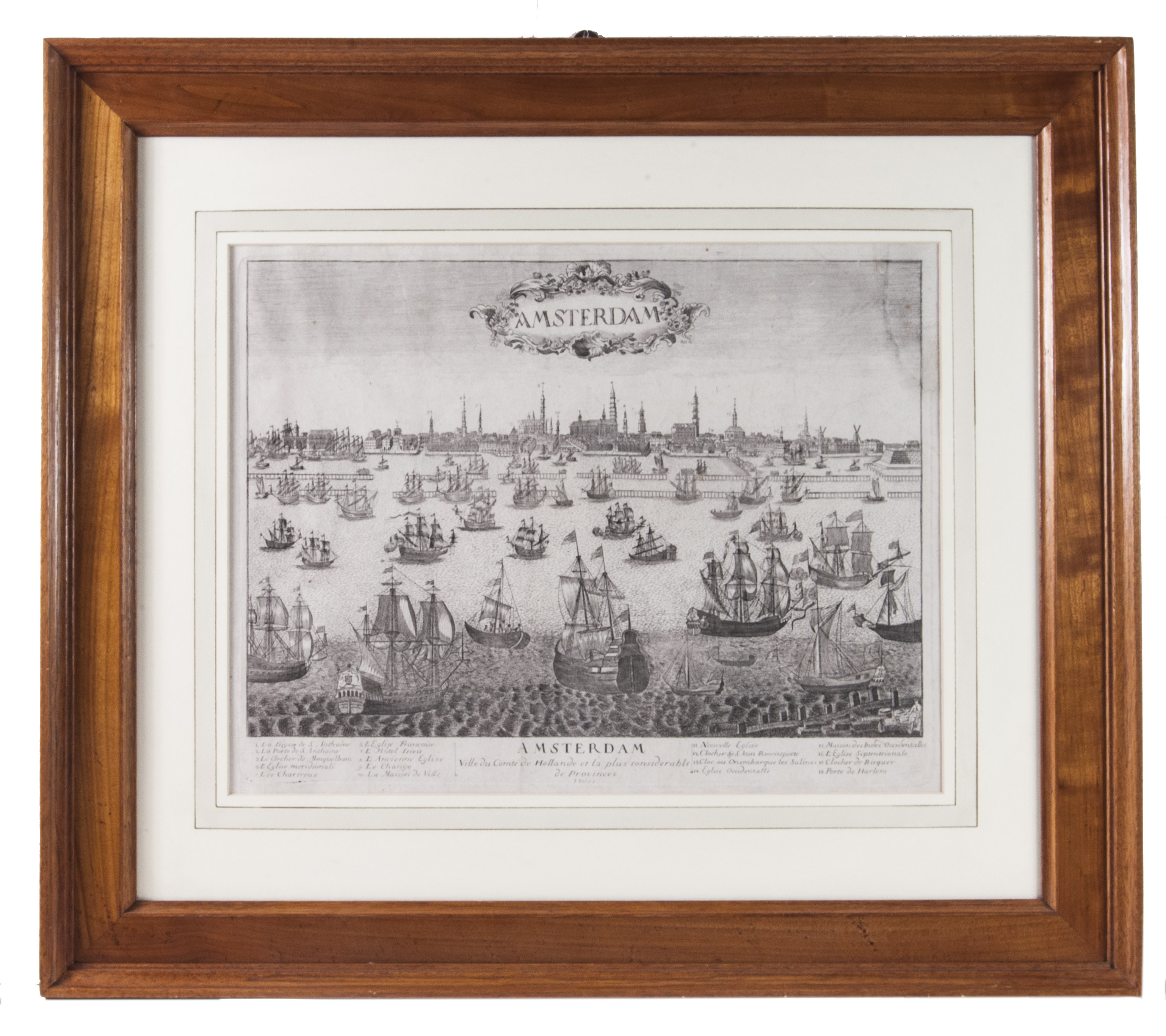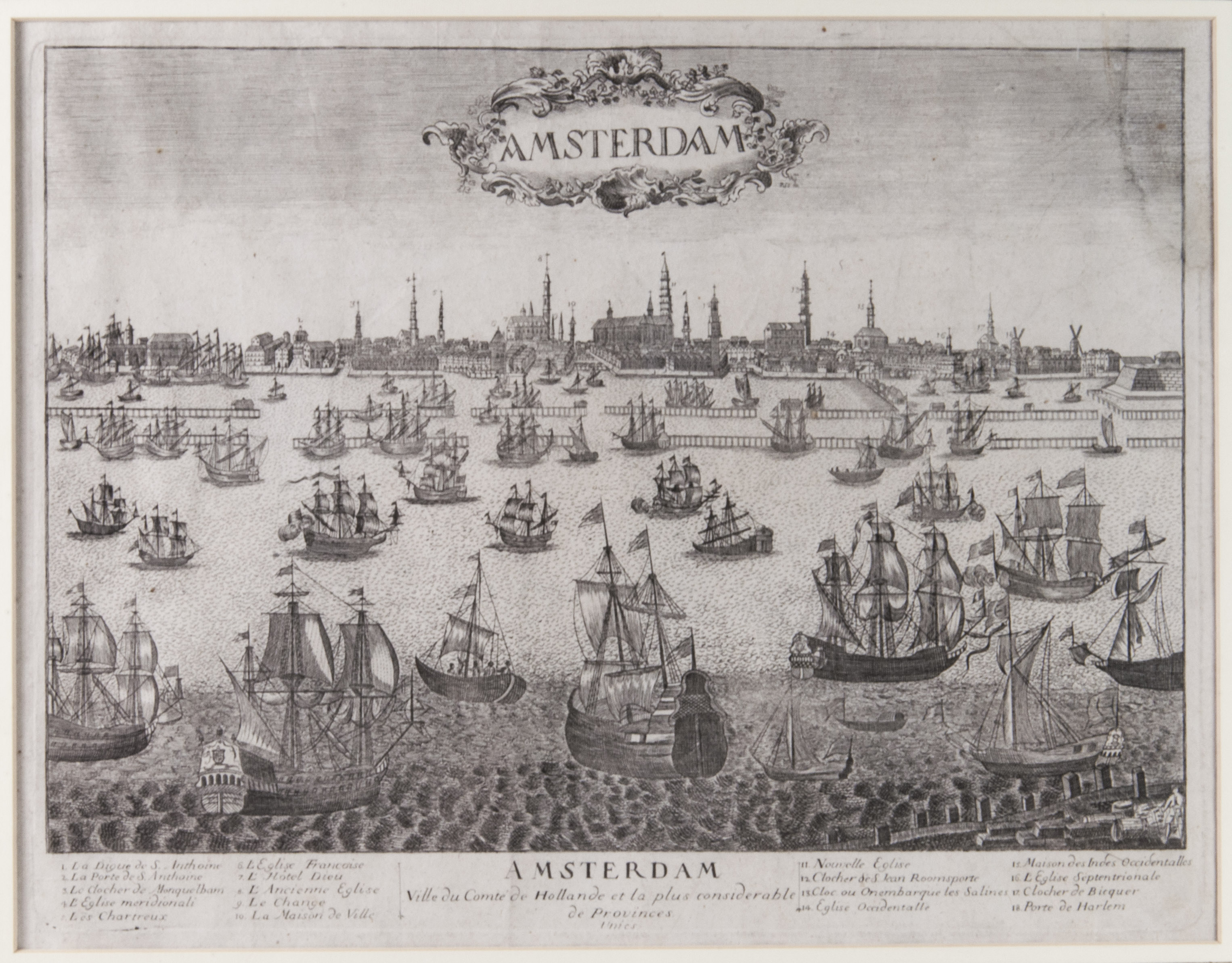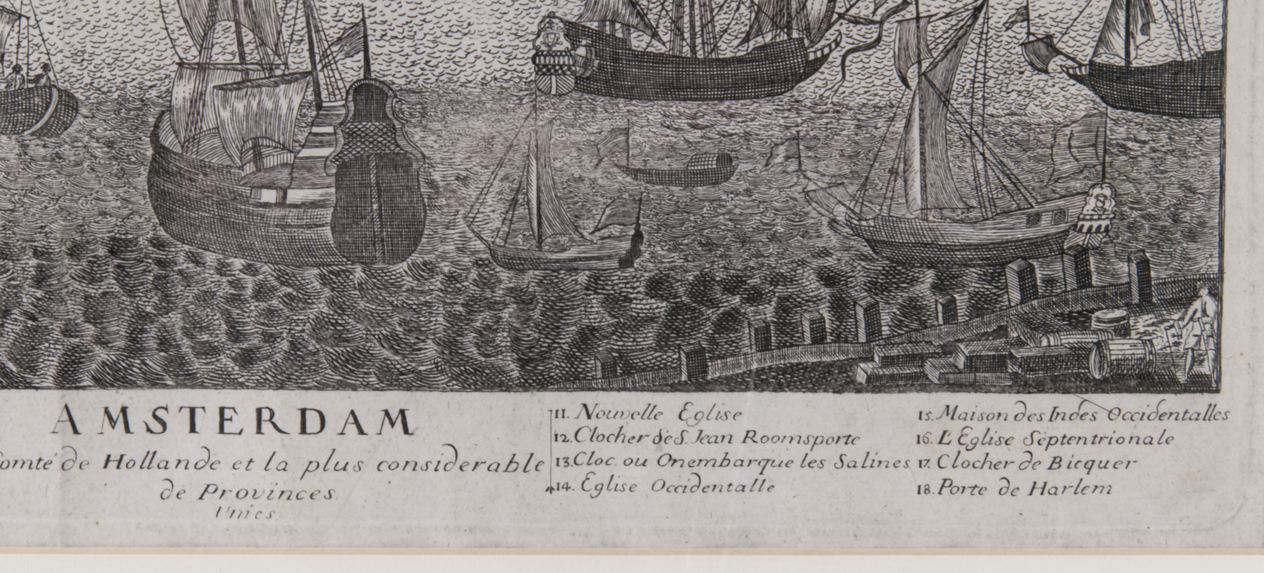 Rare, large, engraved view of Amsterdam, as seen from the inlet known as the IJ. The work is captioned in French and includes a numbered legend for the buildings in the background. According to d'Ailly, it must have been engraved between 1660 and 1668, as it shows the Oost-Indisch Zeemagazijn, a large warehouse built by the Dutch East India Company between 1660-1663, but not the Lutheran Church, which was built in 1668. The present engraving is not signed, but is very similar to a slightly later view of Amsterdam by French engraver Pierre-Alexandre Aveline (1656-1722). It bears the same caption and legend, and has a nearly identical background, but differs in the typography, cartouche, and the amount of ships in the foreground. The present state is exceptionally rare, as we have not been able to trace any other copies of it in sales records, and only three in literature.