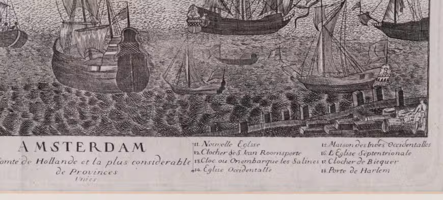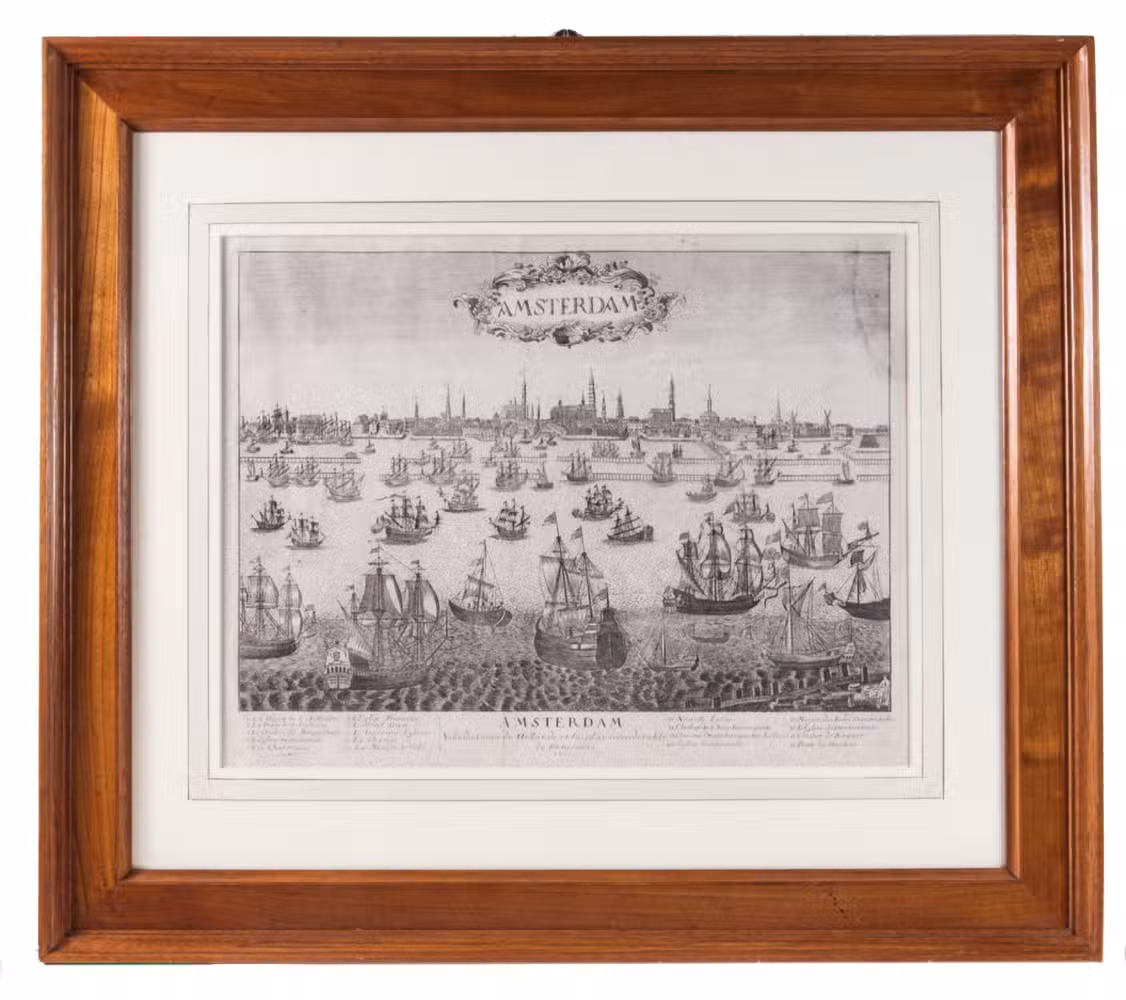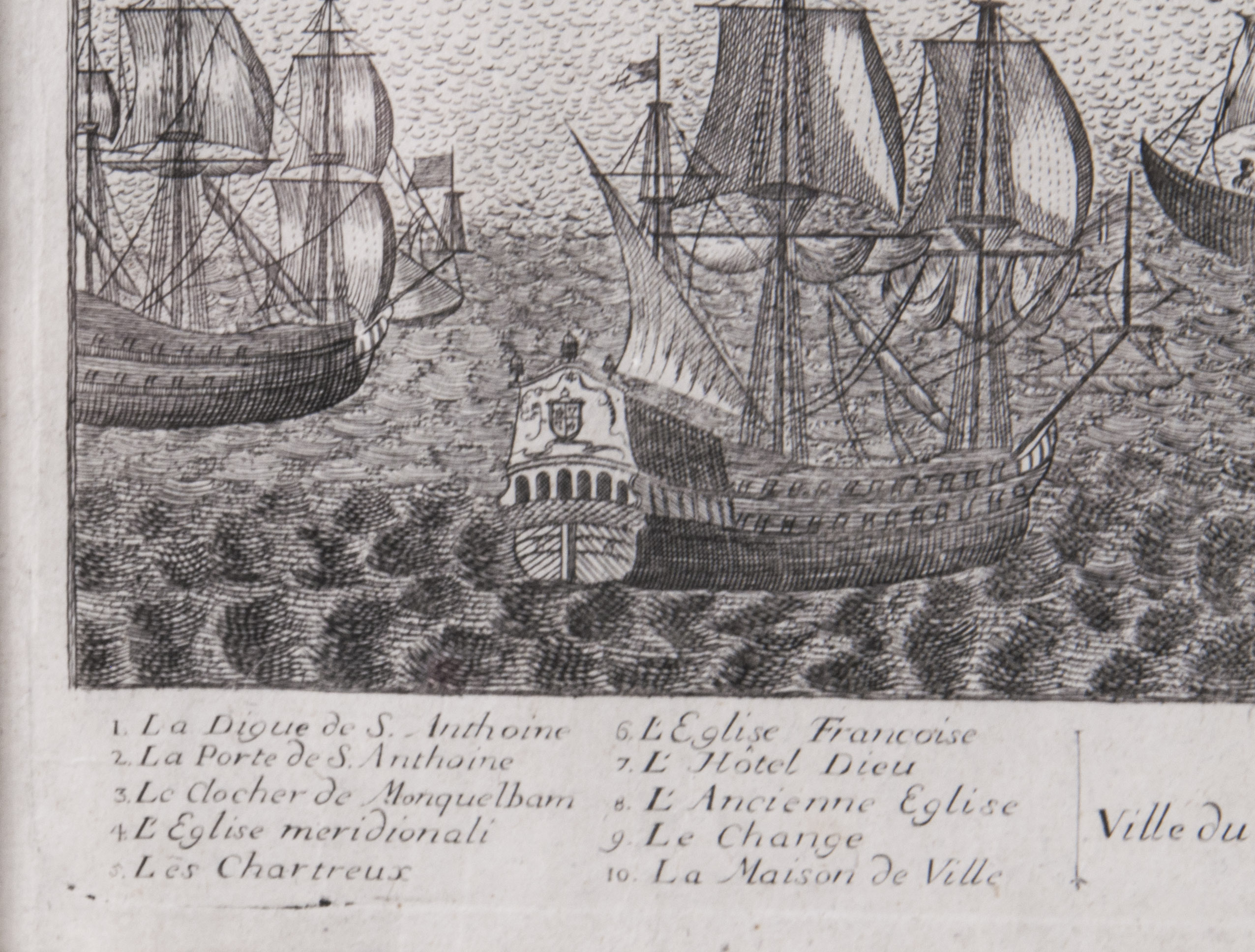 Rare, large, engraved view of Amsterdam, as seen from the inlet known as the IJ. The work is captioned in French and includes a numbered legend for the buildings in the background. According to d'Ailly, it must have been engraved between 1660 and 1668, as it shows the Oost-Indisch Zeemagazijn, a large warehouse built by the Dutch East India Company between 1660-1663, but not the Lutheran Church, which was built in 1668. The present engraving is not signed, but is very similar to a slightly later view of Amsterdam by French engraver Pierre-Alexandre Aveline (1656-1722). It bears the same caption and legend, and has a nearly identical background, but differs in the typography, cartouche, and the amount of ships in the foreground. The present state is exceptionally rare, as we have not been able to trace any other copies of it in sales records, and only three in literature.