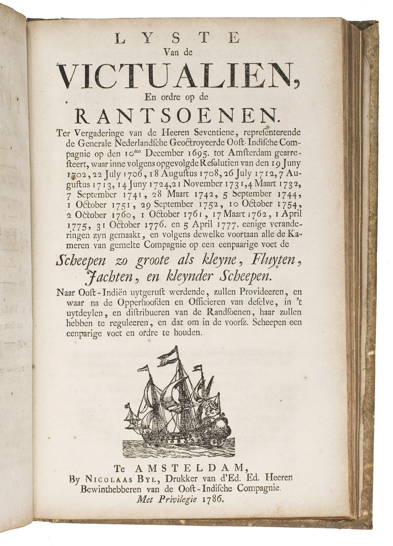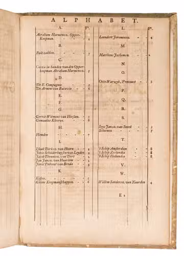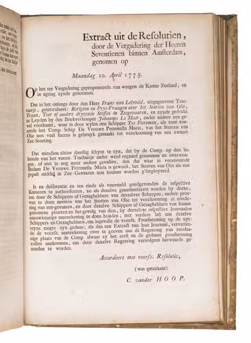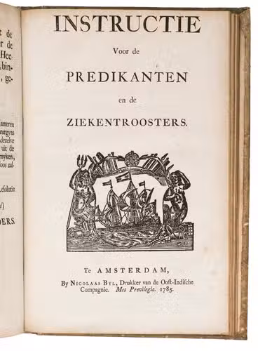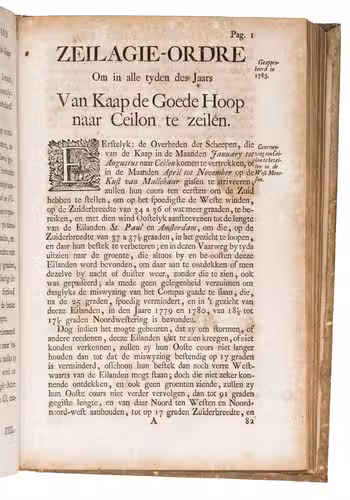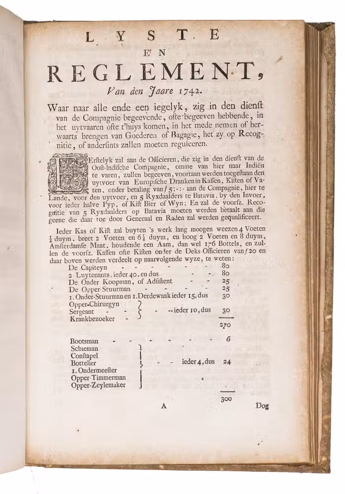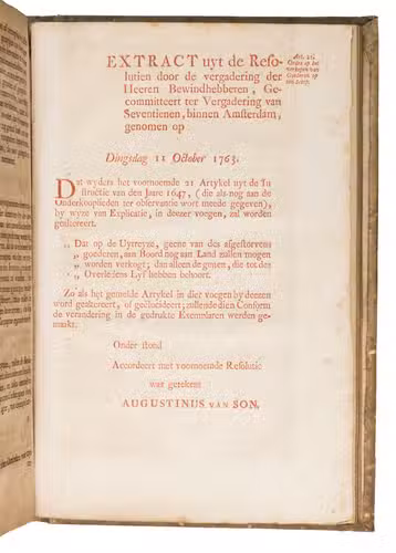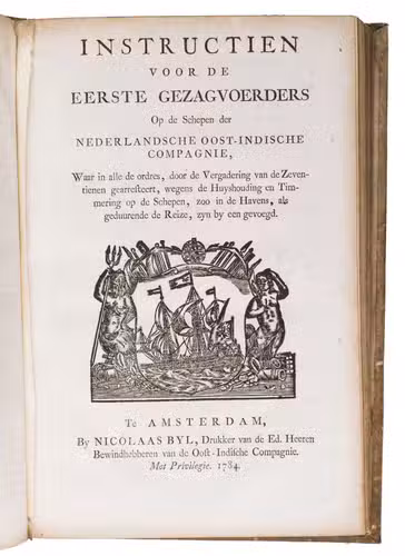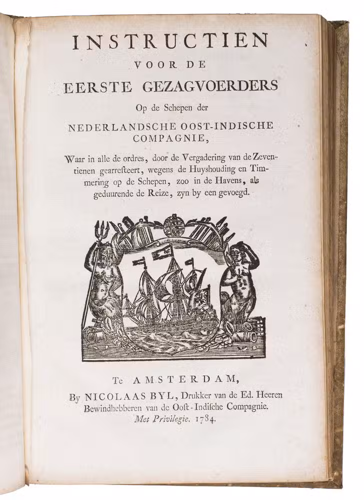 A collection of 23 rare printed works published by the Dutch East India Company (VOC), including orders, resolutions, instructions (including sailing instructions). lists of provisions and other official documents concerning the VOC's shipping and trade in the East Indies, Ceylon (Sri Lanka), India, the Cape and elsewhere. It includes an account of the use of a so-called sea anchor (to stabilize a ship when it cannot anchor to the sea bed), discussions of the problems of dumping oils, tar or other floating materials and an account of nautical firefighting equipment with two woodcut illustrations. The collection gives a very detailed picture of regulations and expectations not only for a ship's crew and officers, but also for its chaplains, physicians, carpenters and others.