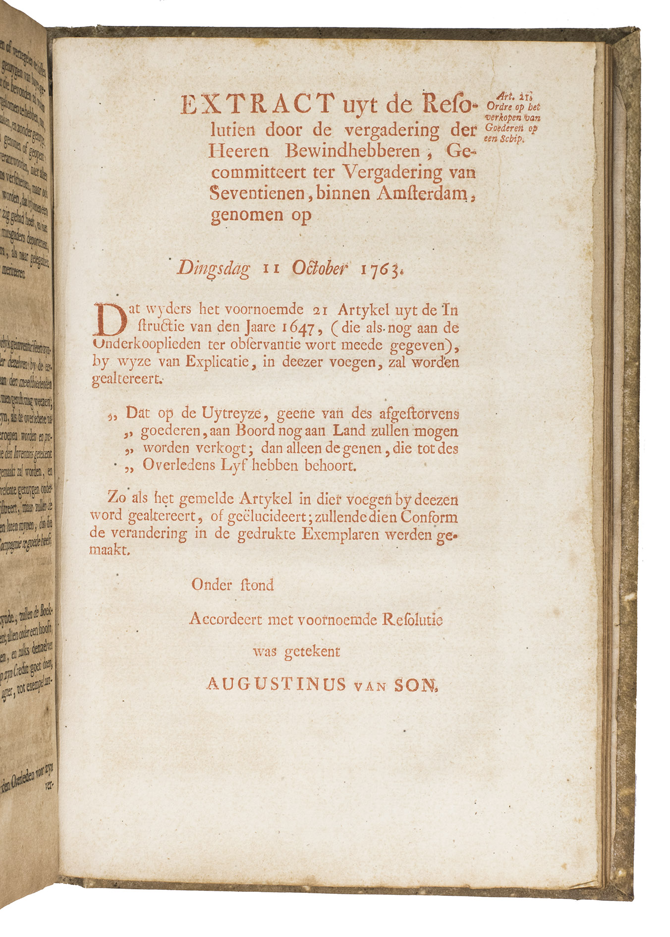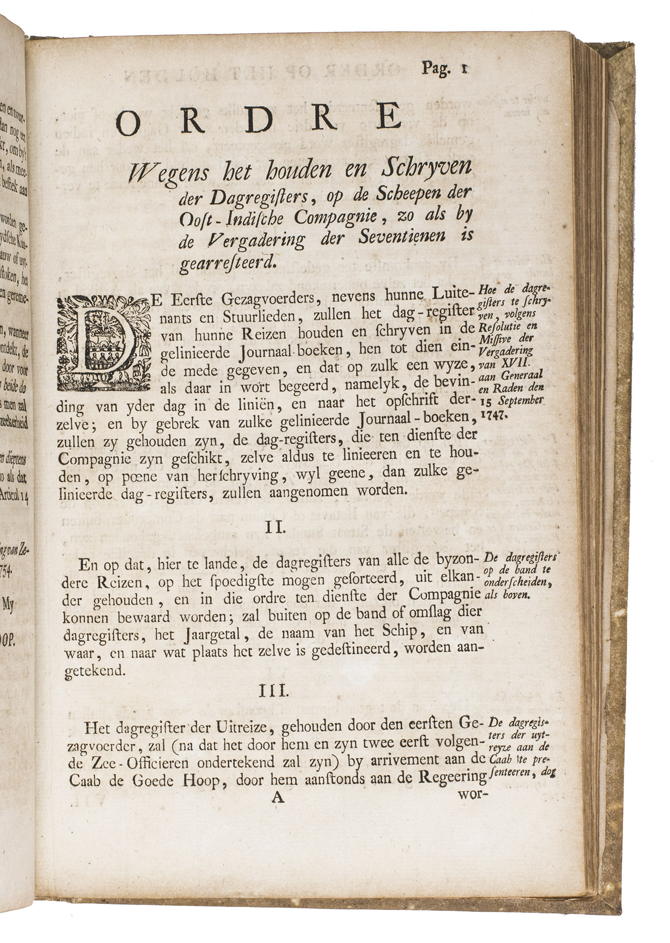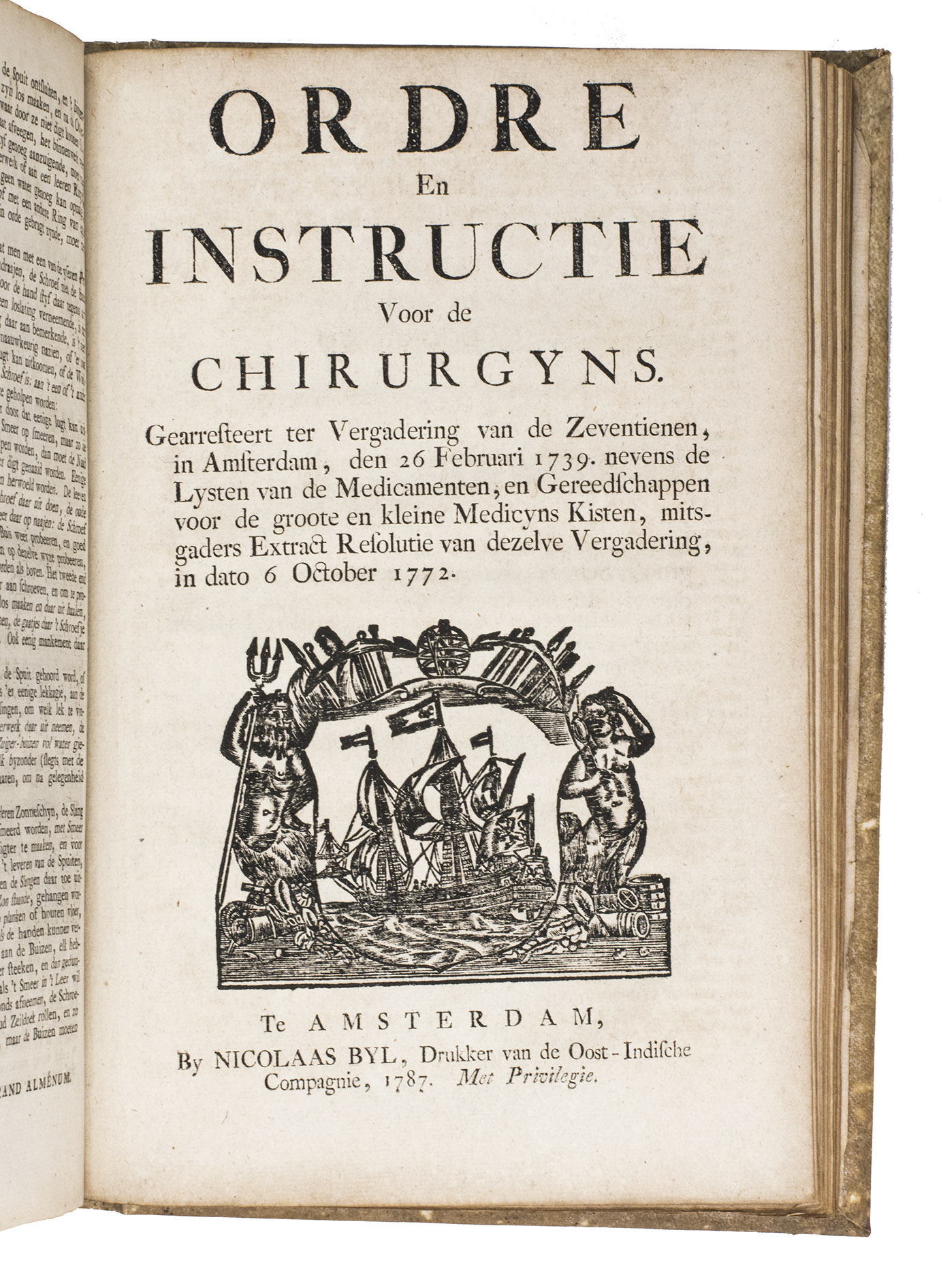 A collection of 23 rare printed works published by the Dutch East India Company (VOC), including orders, resolutions, instructions (including sailing instructions). lists of provisions and other official documents concerning the VOC's shipping and trade in the East Indies, Ceylon (Sri Lanka), India, the Cape and elsewhere. It includes an account of the use of a so-called sea anchor (to stabilize a ship when it cannot anchor to the sea bed), discussions of the problems of dumping oils, tar or other floating materials and an account of nautical firefighting equipment with two woodcut illustrations. The collection gives a very detailed picture of regulations and expectations not only for a ship's crew and officers, but also for its chaplains, physicians, carpenters and others.