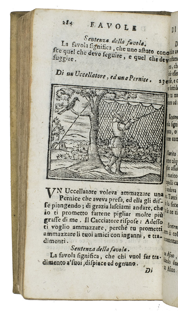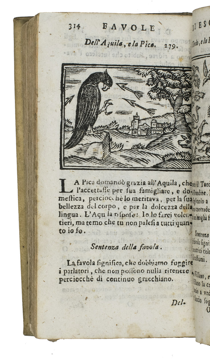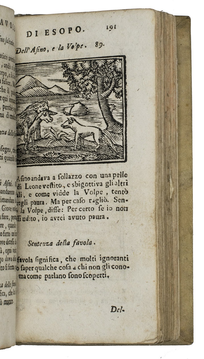 Florence, Giovanni Gaetano Tartini, 1718. 12mo. With 90 (incl. repeats) woodcuts (ca. 4.5 x 6 cm). Plain vellum. 384, [12] pp.