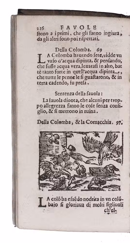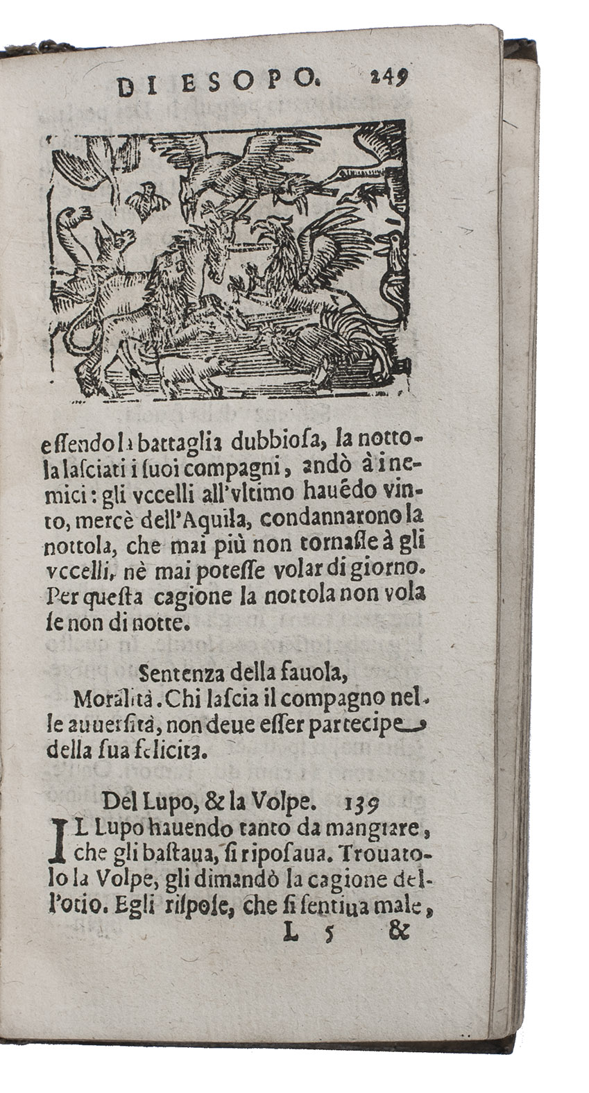 Trevigi, Girolamo Righettini, 1643. 2 parts in 1 volume. 12mo. With 137 small woodcuts in text illustrating the fables, including some repeats. Contemporary sheepskin parchment. 413, [19], [5 blank] pp.
