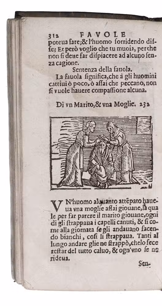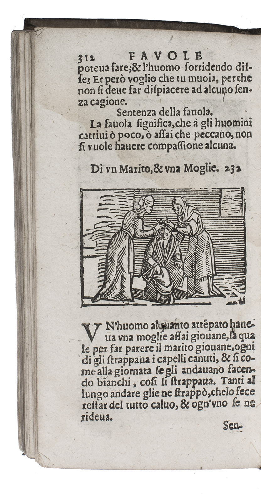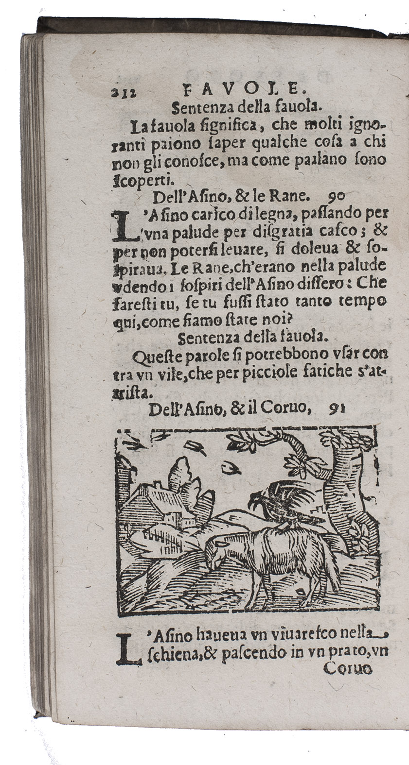Rare edition of the Italian translation by the philosopher Giulio Landi (1498-1579) of Aesop's fables and the Life of Aesop, including no less than 400 animal fables, some collected from other sources. The fables are illustrated with numerous small anonymous woodcuts that appeared for the first time in 1569 in the fables collected by Cesare Pavesi and became very popular through Landis translations of Aesop, beginning in 1580. They have been attributed to Johann Krieger, a German working in Italy, where he was known as Giovanni Chrieger. Several woodcuts are repeated, especially at the end, for the fables taken from other sources. All fables close with a moral, here called "Sentenza", intended for the instruction and amusement of the youth.