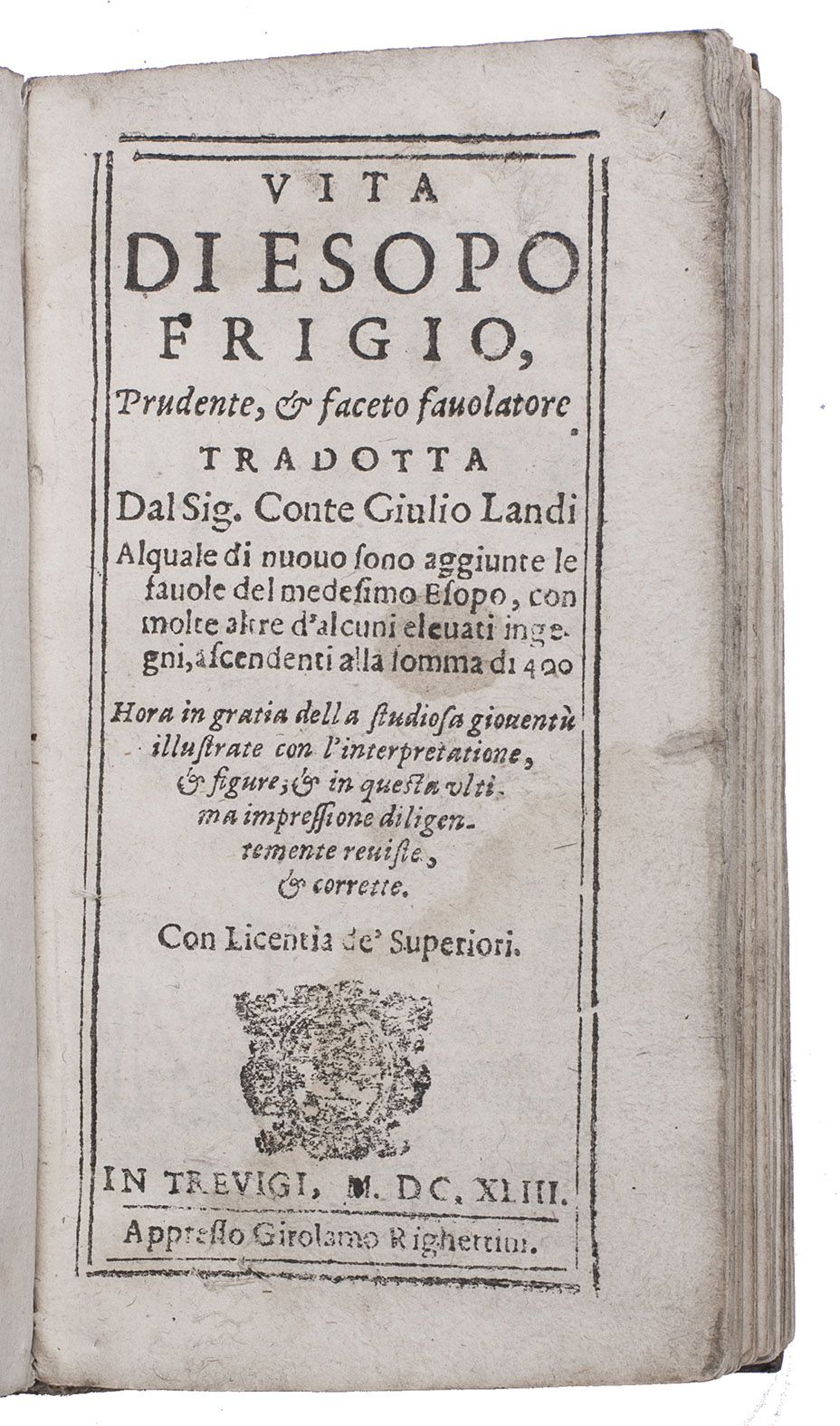 Vita di Esopo Frigio ... Alquale di nuovo sono aggiunti le favole del medesimo Esopo, con molte altre d'alcuni elevati ingegni, ascendentia all somma di 400.