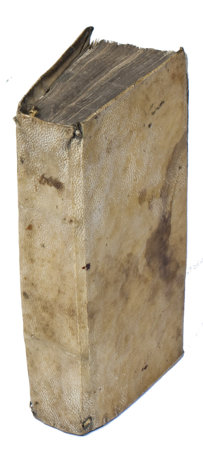 With 2 holes in the last few pages, some water stains throughout, and some restorations with now discoloured tape. With the binding slightly stained, partly detached from the bookblock, and with 2 holes in the back board. WorldCat (2 copies); cf. Fabula docet 14.