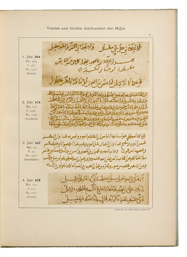 A complete set of the scarce original edition, published as volumes 7-9 and 16-22 of the giant general catalogue of the Berlin manuscript collections ("Die Handschriften-Verzeichnisse der Königlichen Bibliothek zu Berlin"). Ahlwardt (1828-1909) was engaged in 1863 as cataloguer of the Arabian manuscripts. Until 1887 he classified, collated, described and excerpted some 12,000 works in ca 6000 volumes, including current accessions. The important collection was based on the precious library bequeathed by Heinrich Friedrich von Diez. It was gradually enlarged by the manuscript treasures purchased from leading German scholars such as Glaser, Landberg, Minutoli and Brugsch, Petermann, Sachau, Sprenger and Wetzstein. Ahlwardt's monumental catalogue is renowned for an unprecedented wealth of details both in physical and textual respect. It formed a pattern for a complete history of Arabic literature - theological, juridical, philosophical, scientific, linguistic, historical and poetical. Ahlwardt expanded on the customary manuscript catalogue entries by providing an exact outline of contents for each work catalogued. "When all ten volumes had been printed in 1899, Ahlwardt had created a work which by virtue of its scope and precision would remain of lasting value of the history of Arabic literature" (cf. Fück, Die Arabischen Studien in Europa, 1955, p. 192).