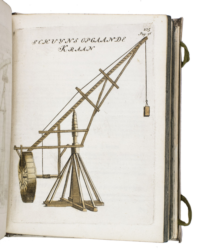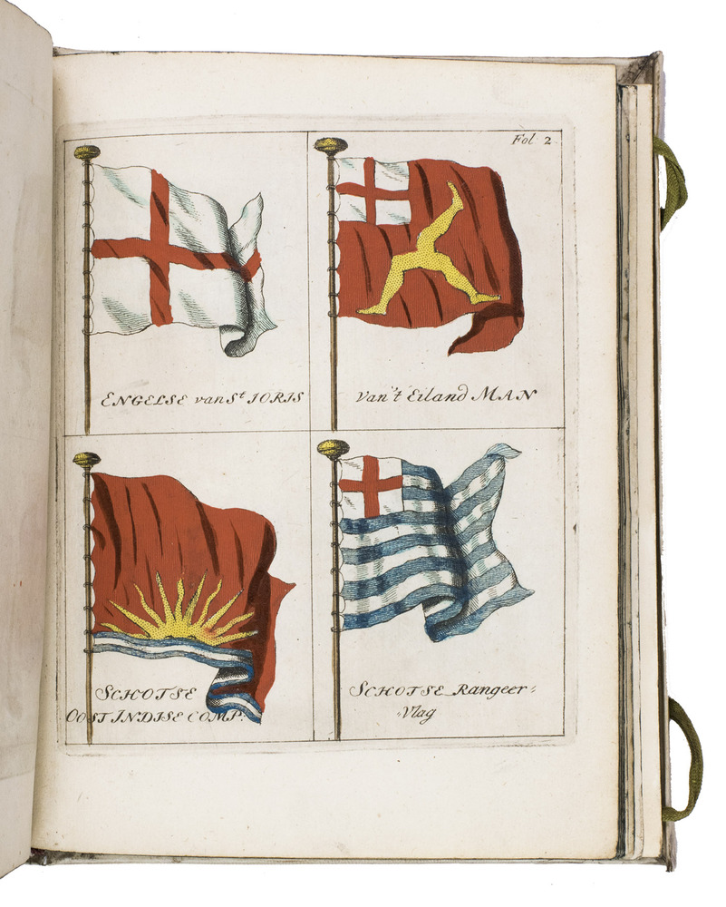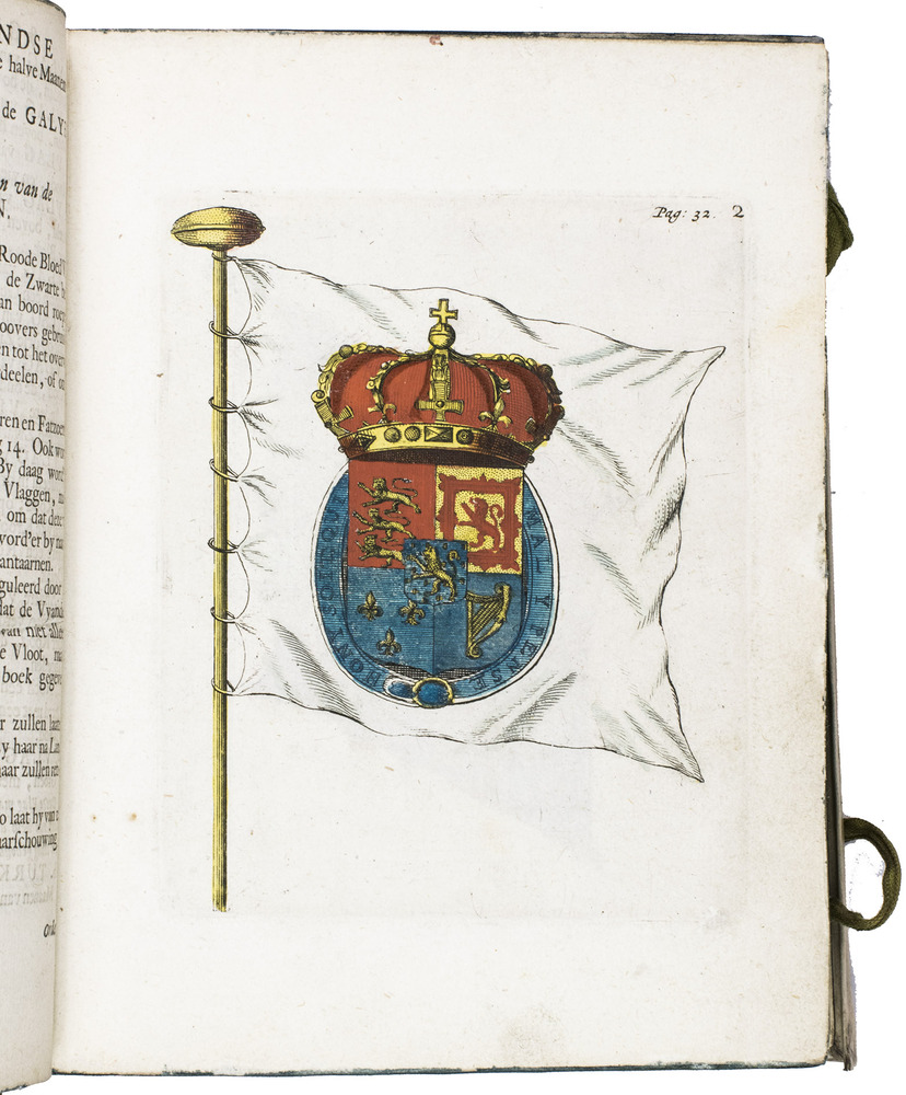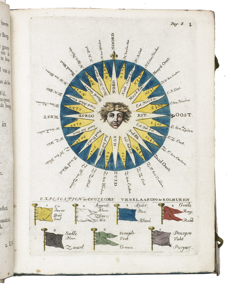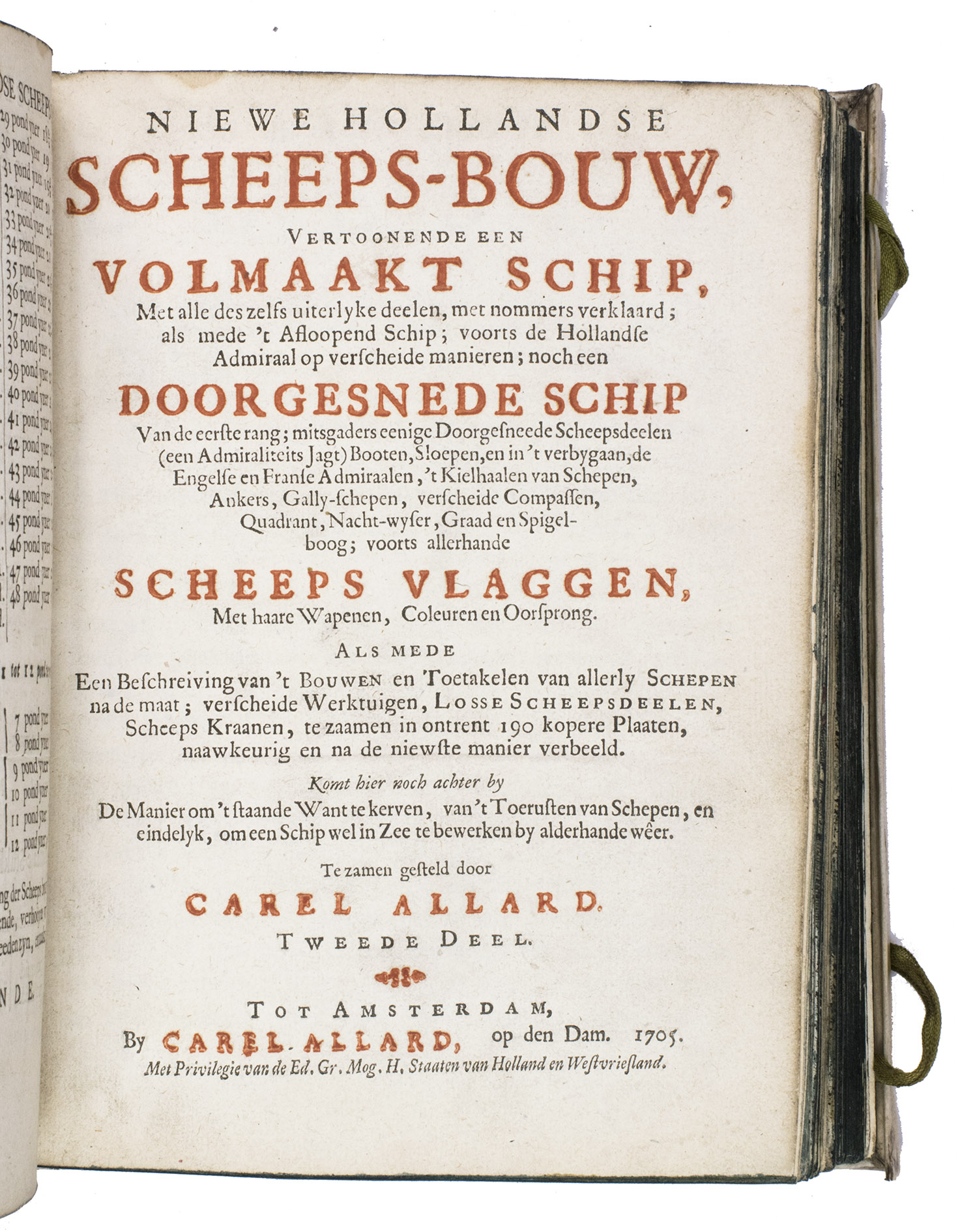 Niewe Hollandse scheeps-bouw is an essential primary source for the terminology and practice of shipbuilding in the Dutch Golden Age. It details everything one would need to know about ships, shipbuilding, rigging and maritime flags. The first plate gives a very detailed image of a three-masted ship (including the parts under water) and its rigging, with more than 150 elements keyed with letters or numbers to the list on pages 4 to 8. The second volume contains multiple double-page plates with cross sections of various parts of a ship, as well as plates depicting the tools of the trade, which helps one understand the ship-building process. It also contains a short section on compasses and navigation. The majority of the plates, however, show maritime flags. In fact, both the second and third volume were added because the first was missing a number of flags. The section of flags, spread out across all three volumes, is very extensive. It includes the flags of numerous cities and countries across the world, as well as signal flags.