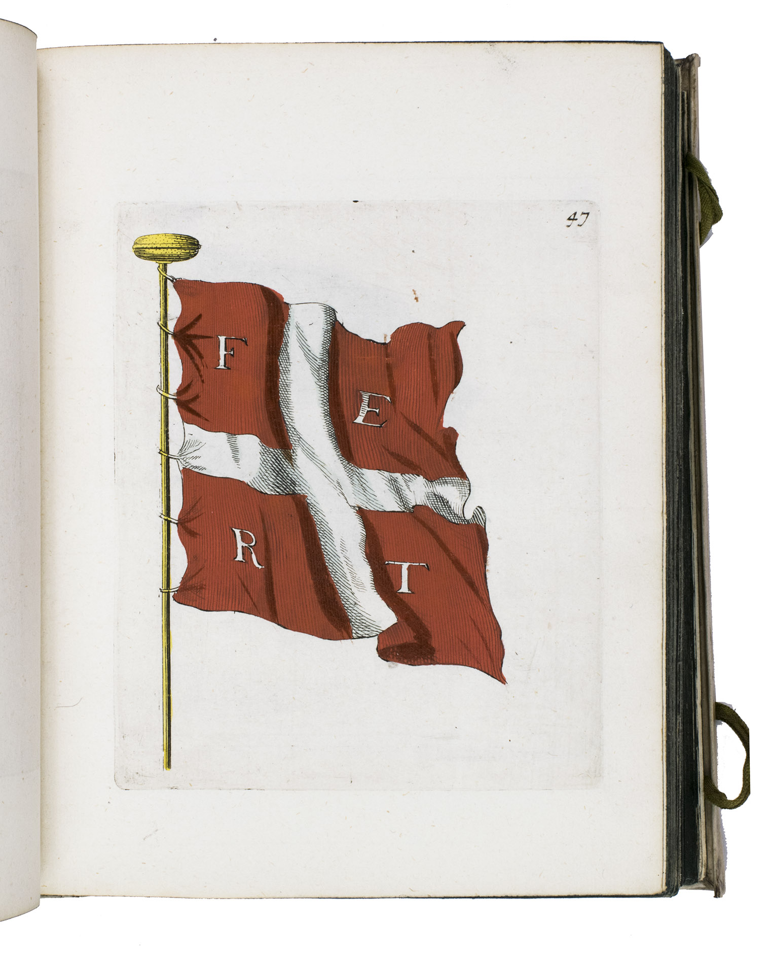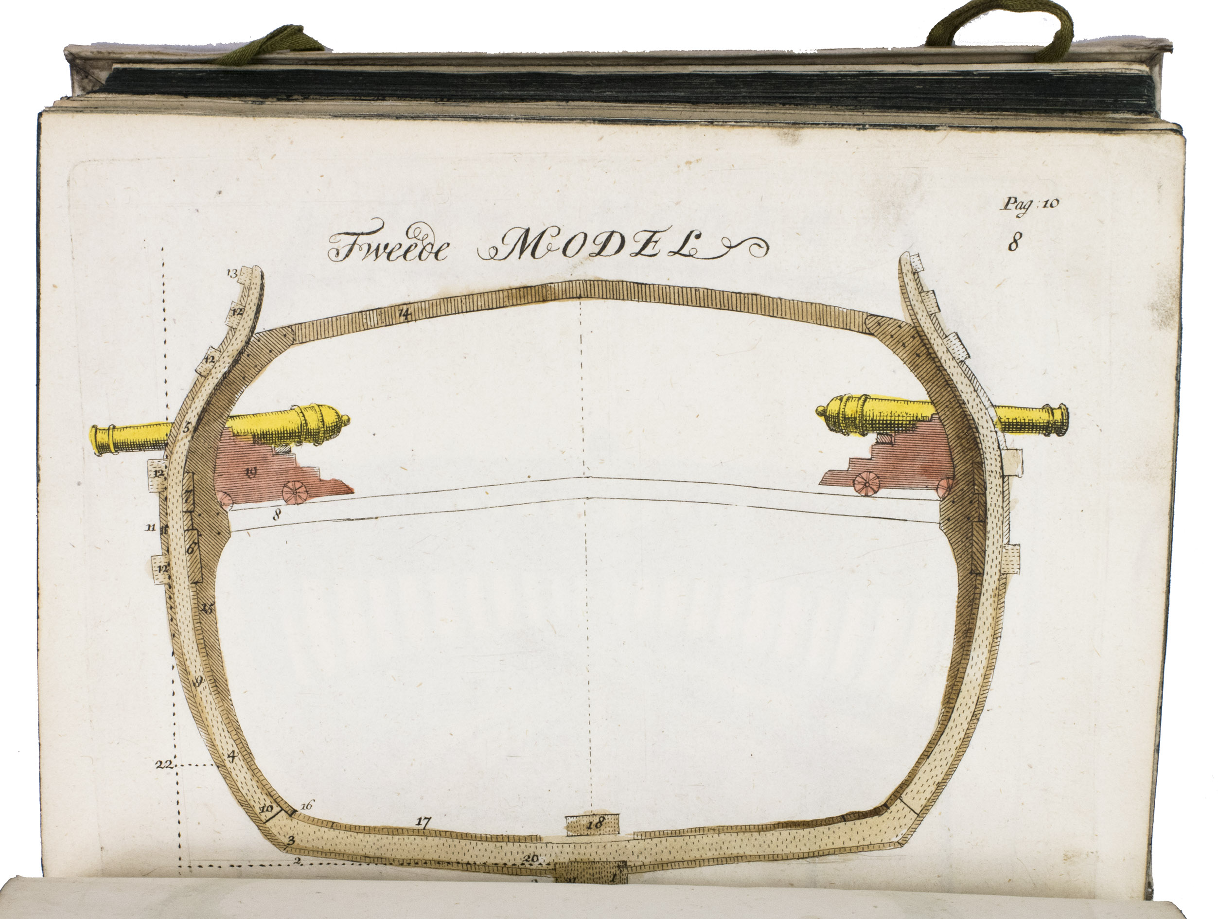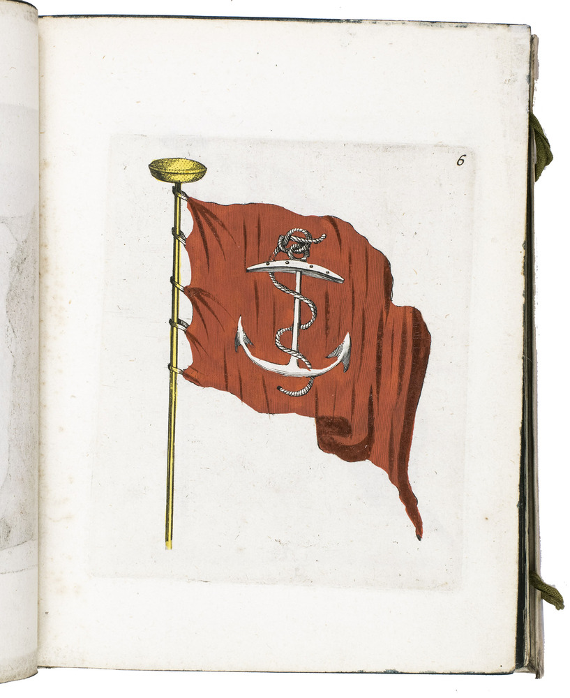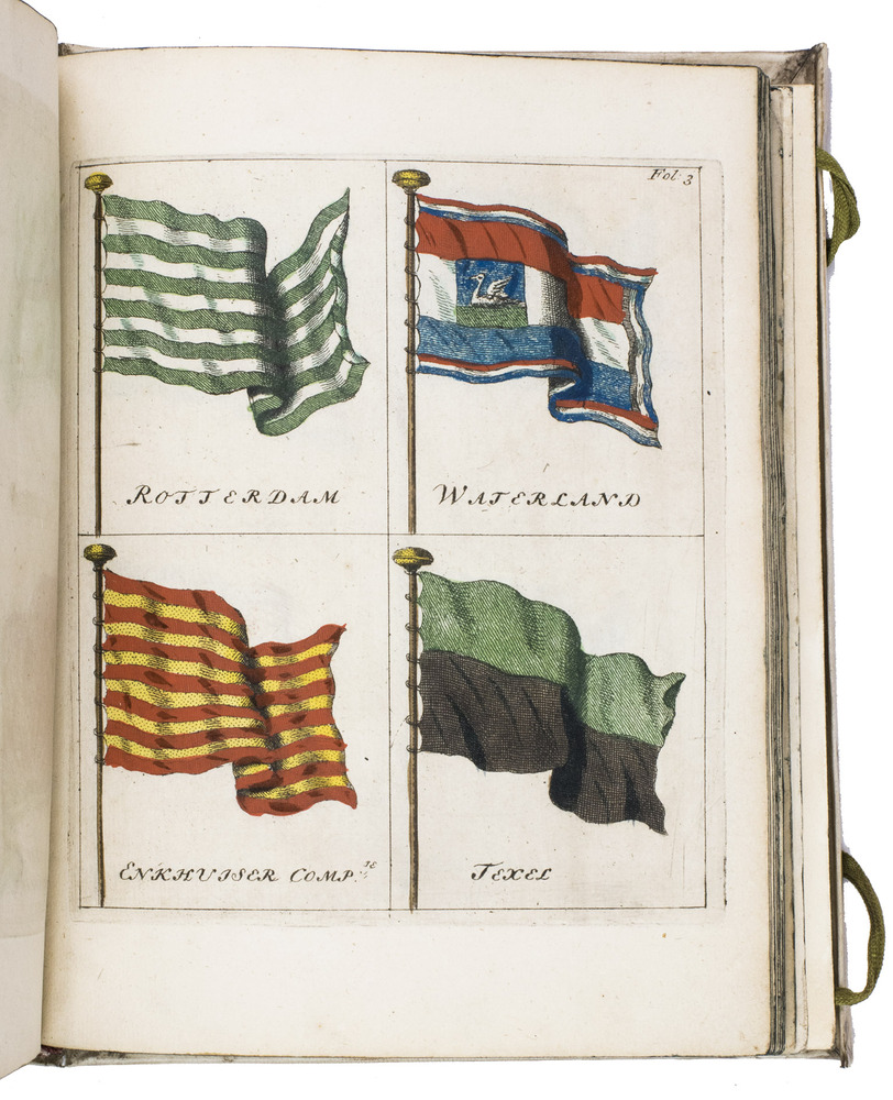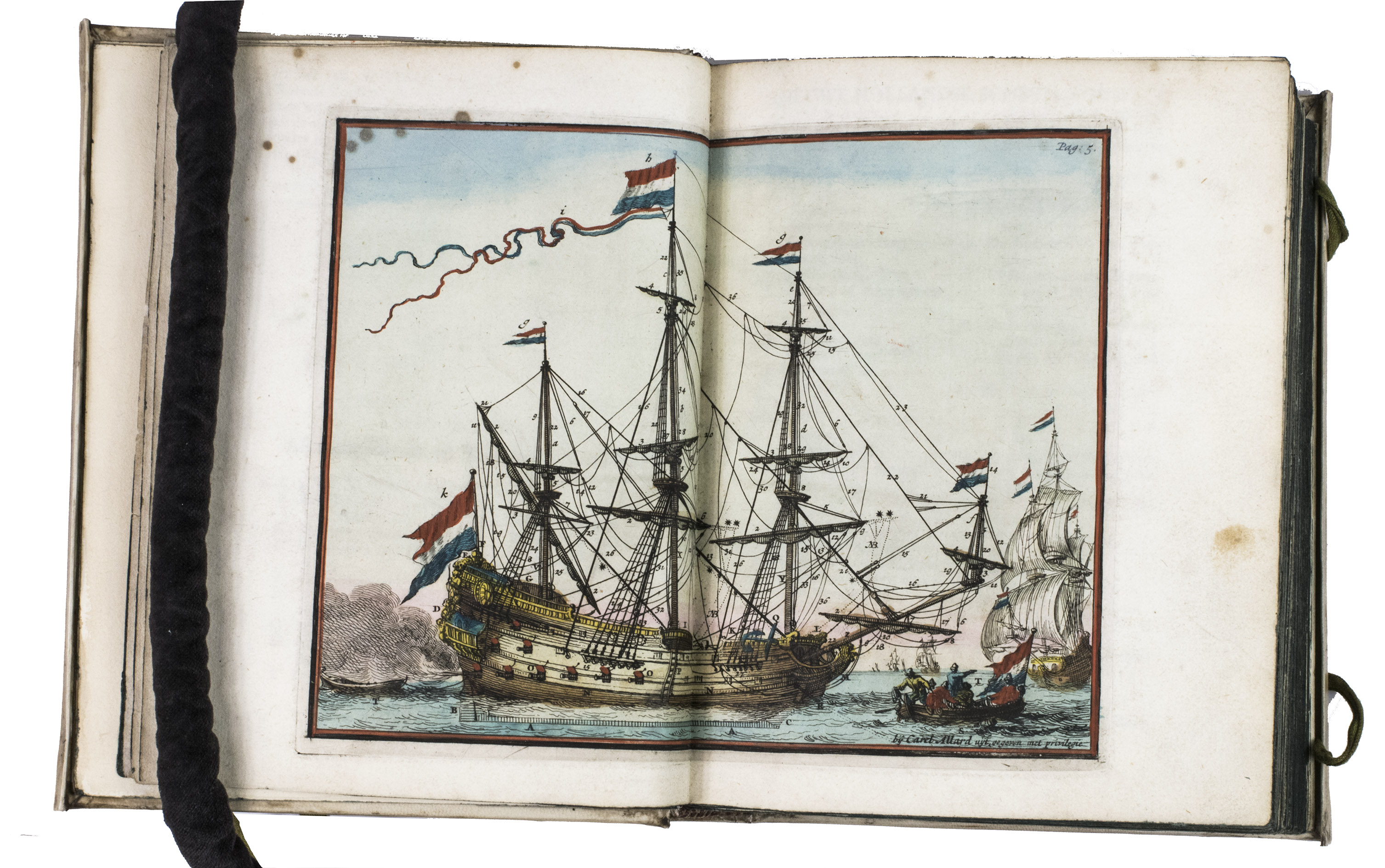 Highly important work on shipbuilding showing all facets of this trade, with 208 beautifully contemporary hand coloured plates. It is also one of the first extensive flag books. The treatise was one of the most used sea manuals at the time, but today is very rare, especially in such fine contemporary colouring. Although there are very few copies of it left as is (we have only been able to trace three other copies in sales records and five in libraries), most of them lack the third volume. The present copy, however, is complete.
