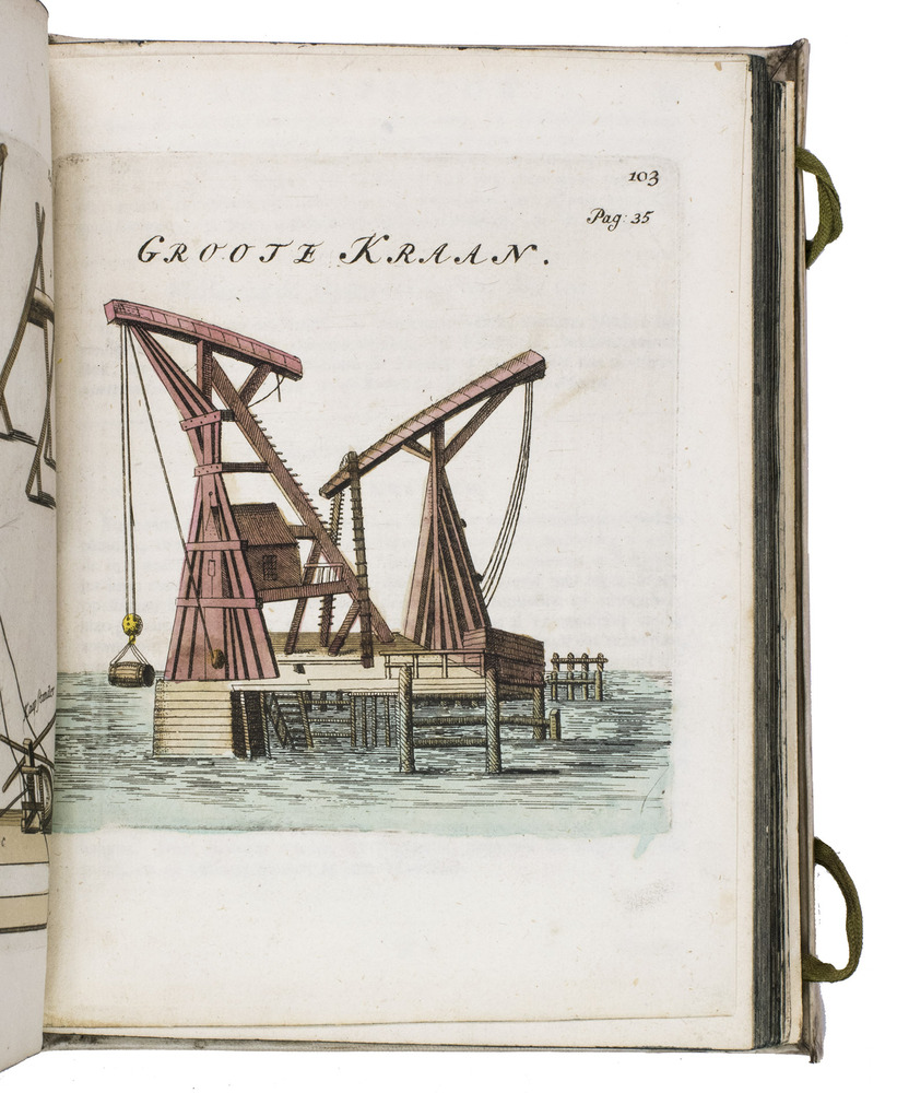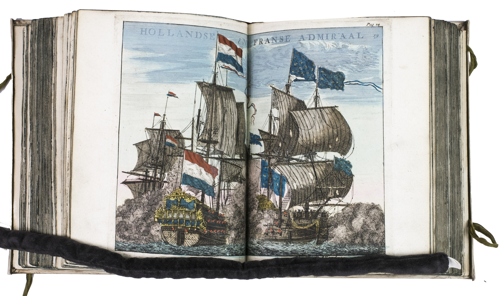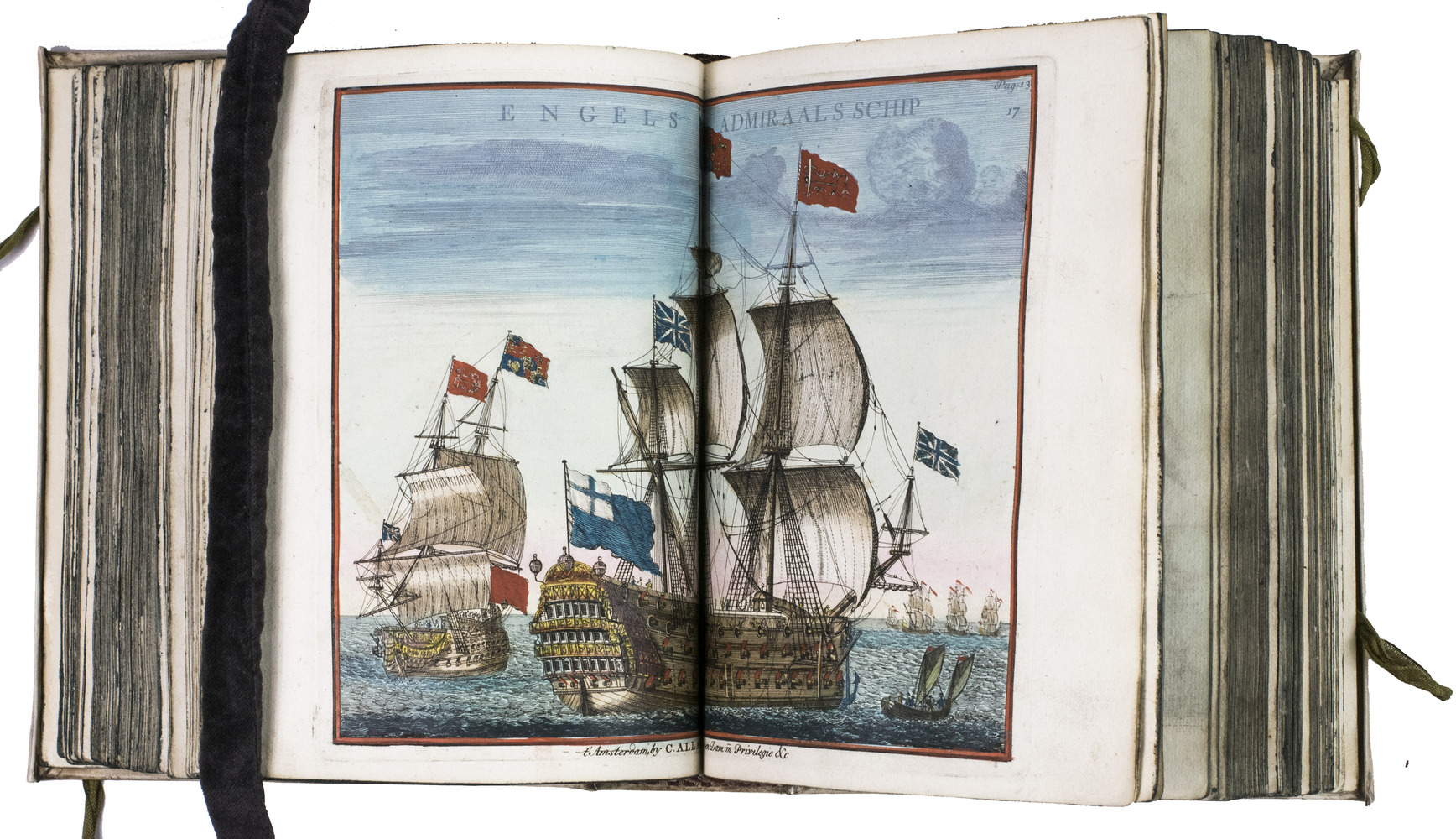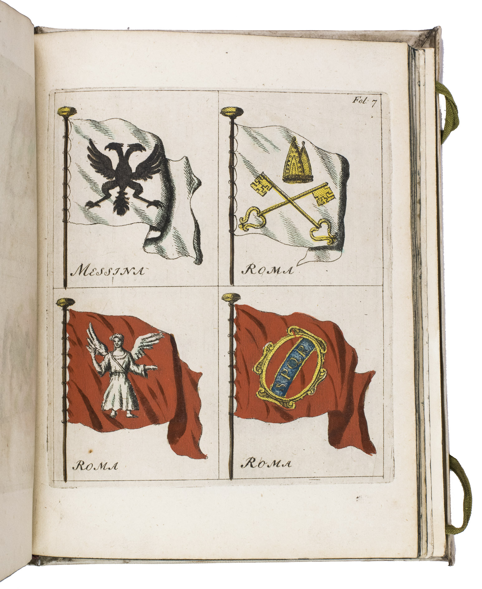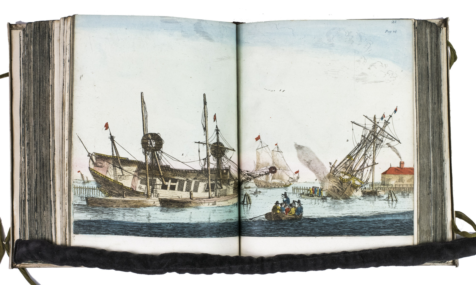 Highly important work on shipbuilding showing all facets of this trade, with 208 beautifully contemporary hand coloured plates. It is also one of the first extensive flag books. The treatise was one of the most used sea manuals at the time, but today is very rare, especially in such fine contemporary colouring. Although there are very few copies of it left as is (we have only been able to trace three other copies in sales records and five in libraries), most of them lack the third volume. The present copy, however, is complete.