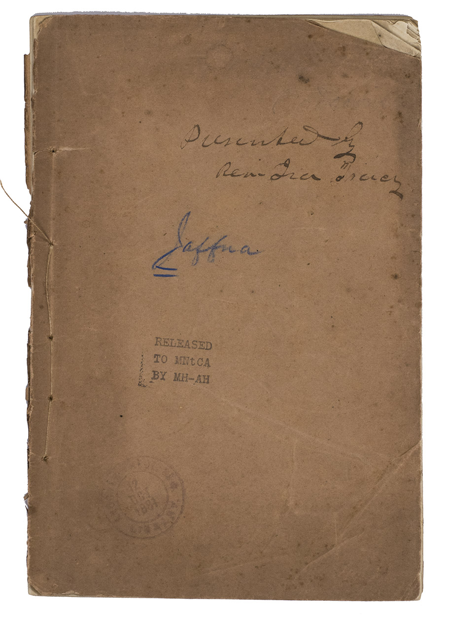 With an inscription in ink: "Purchased by Rev. Ira Pierce", and with an old collection and deaccession stamp of the Andover Theological Library, and "Jaffna" in blue pencil, all on the front wrapper. With another Andover Theological Library deaccession stamp on the verso of the title-page. The wrappers are somewhat darkened and lightly foxed, the spine is slightly damaged, the top corners of the first few leaves are somewhat frayed, very slightly browned throughout. Overall in very good condition. WorldCat 884815728 (1 copy).