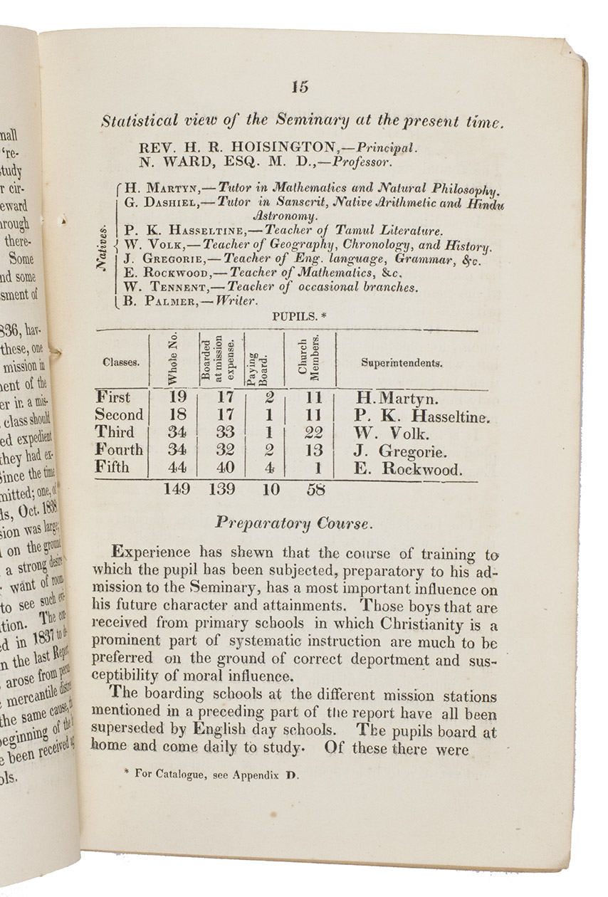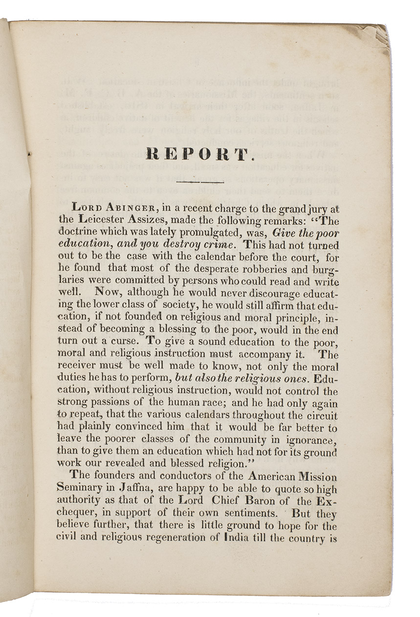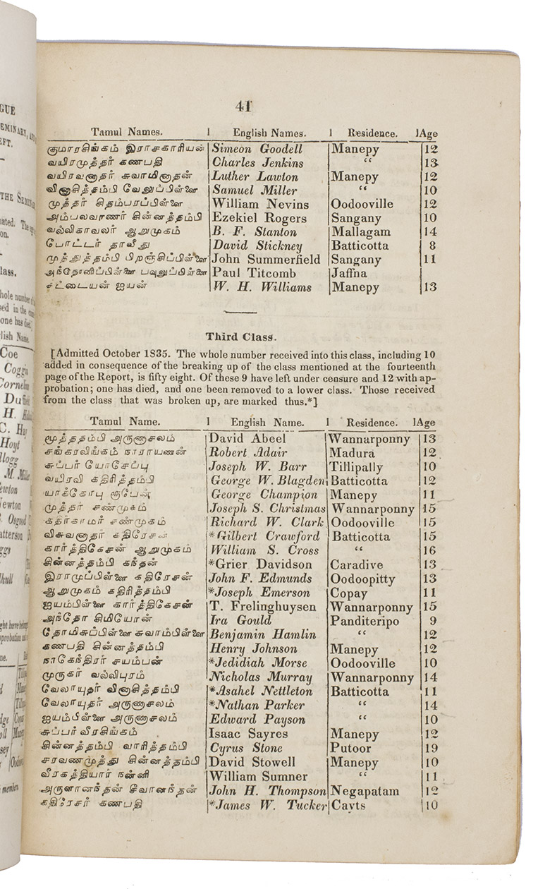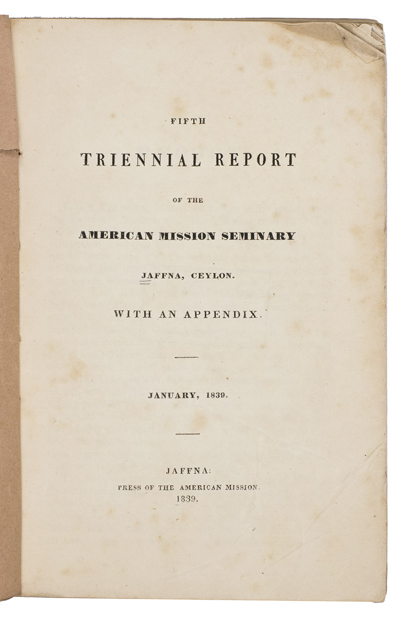 Rare report by the American Mission Seminary, active in Jaffna, Ceylon (now Sri Lanka), containing considerable information on the mission's activities, expenditure, curriculum, and an extensive list of names in both Tamil and English of all the instructors and students who have attended this Presbyterian Seminary, along with the years in which they entered and left the Seminary and their current place of residence in Ceylon. The only institutional copy we can trace is held in the William Smith Morton Library at the Union Presbyterian Seminary (Richmond, VA).