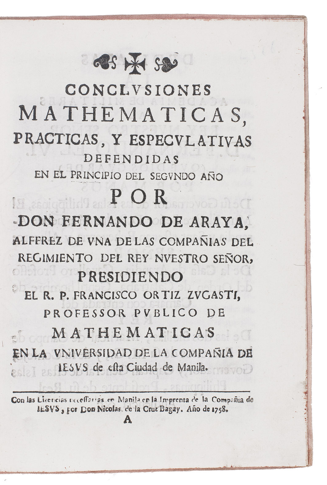 First and only edition of a brief dissertation on the practical use of mathematics in the military by the Spanish soldier Fernando de Araya, "alferez de una de las compañias del regimiento del rey nuestro señor", who studied at Manila's Jesuit University. With the Jesuit mathematician Francisco Ortiz Zugasti (1727-1772) as praeses. Although the letterpress presswork leaves much to be desired, the frontispiece is nicely executed and well printed, and the Italian laid paper is excellent and very white.