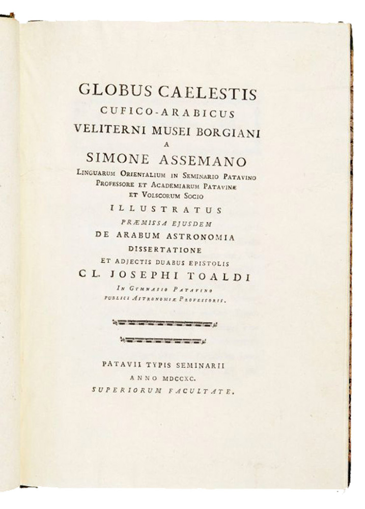 Globus caelestis Cufico-Arabicus Veliterni Musei Borgiani ... illustratus. Praemissa ejusdem De Arabum astronomia dissertatione et adjectis duabus epistolis Cl. Josephi Toaldi.