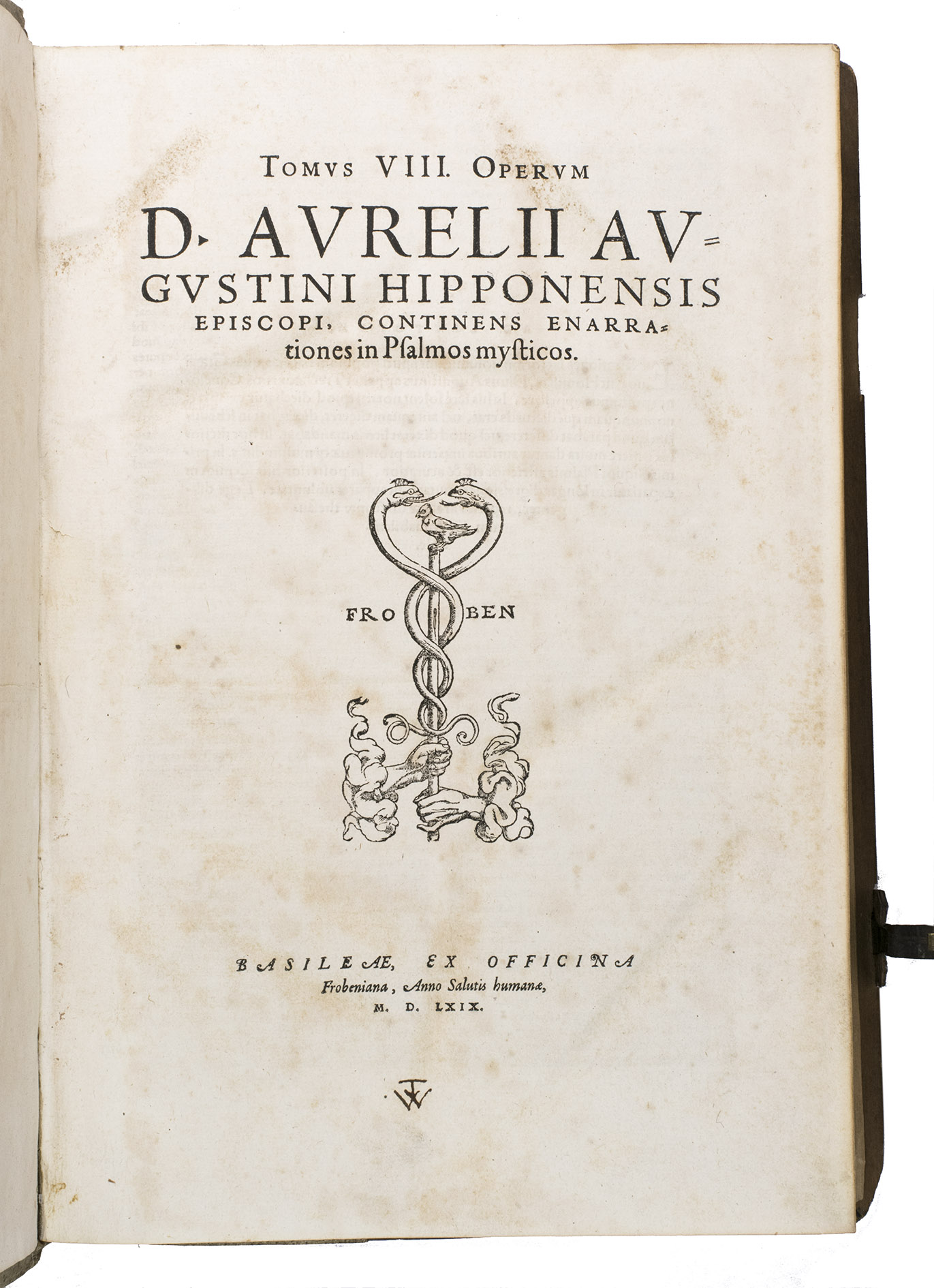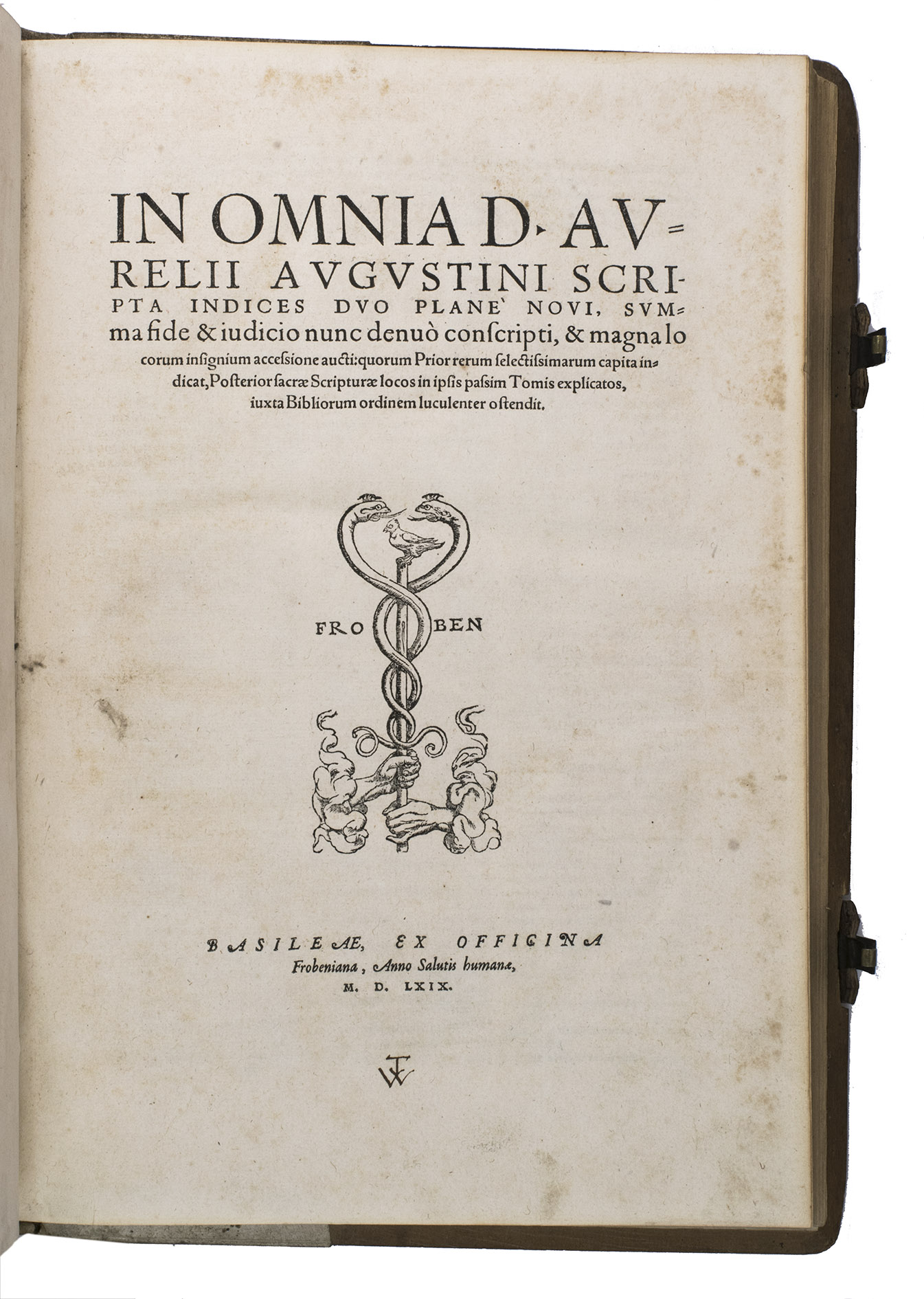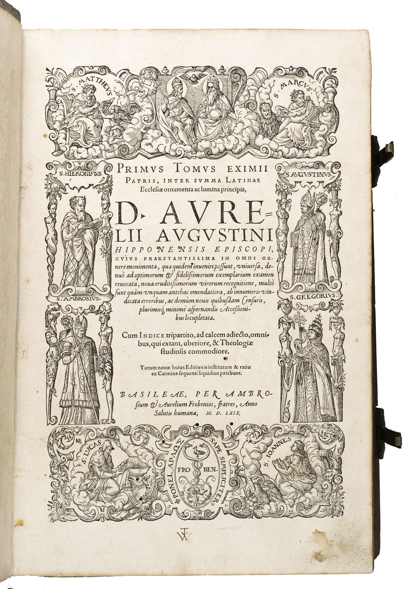 Basel, Ambrosius & Aurelius Froben, 1569. 11 parts in 10 volumes. Folio (38 x 25.5 cm). With the general title page in volume 1 set within an elaborate woodcut frame, all other title pages show the large woodcut Froben printer's device, repeated on all but one verso of the final page in each part. Further with woodcut decorated initials. Contemporary half elaborately blind-tooled pigskin over wooden boards, sewn on 5 supports (volume 1 on 4), with two brass clasps on the fore edge (leather anchor plate, brass clasp and catch plate). With the manuscript titles on the spines and the contents of each volume in manuscript on the bottom edge of all but one volume. Probably bound by Michael Hermann in Stuttgart before 1580.