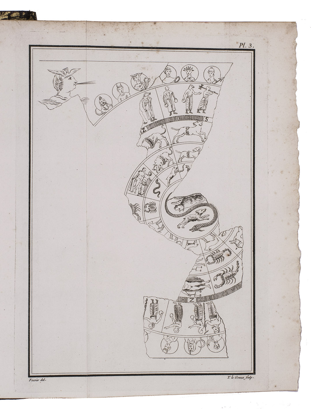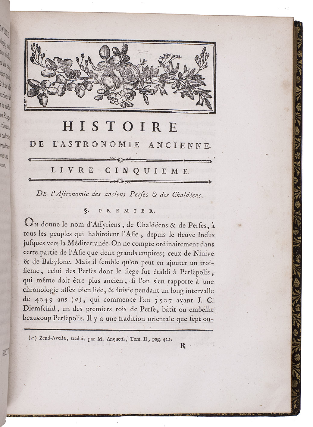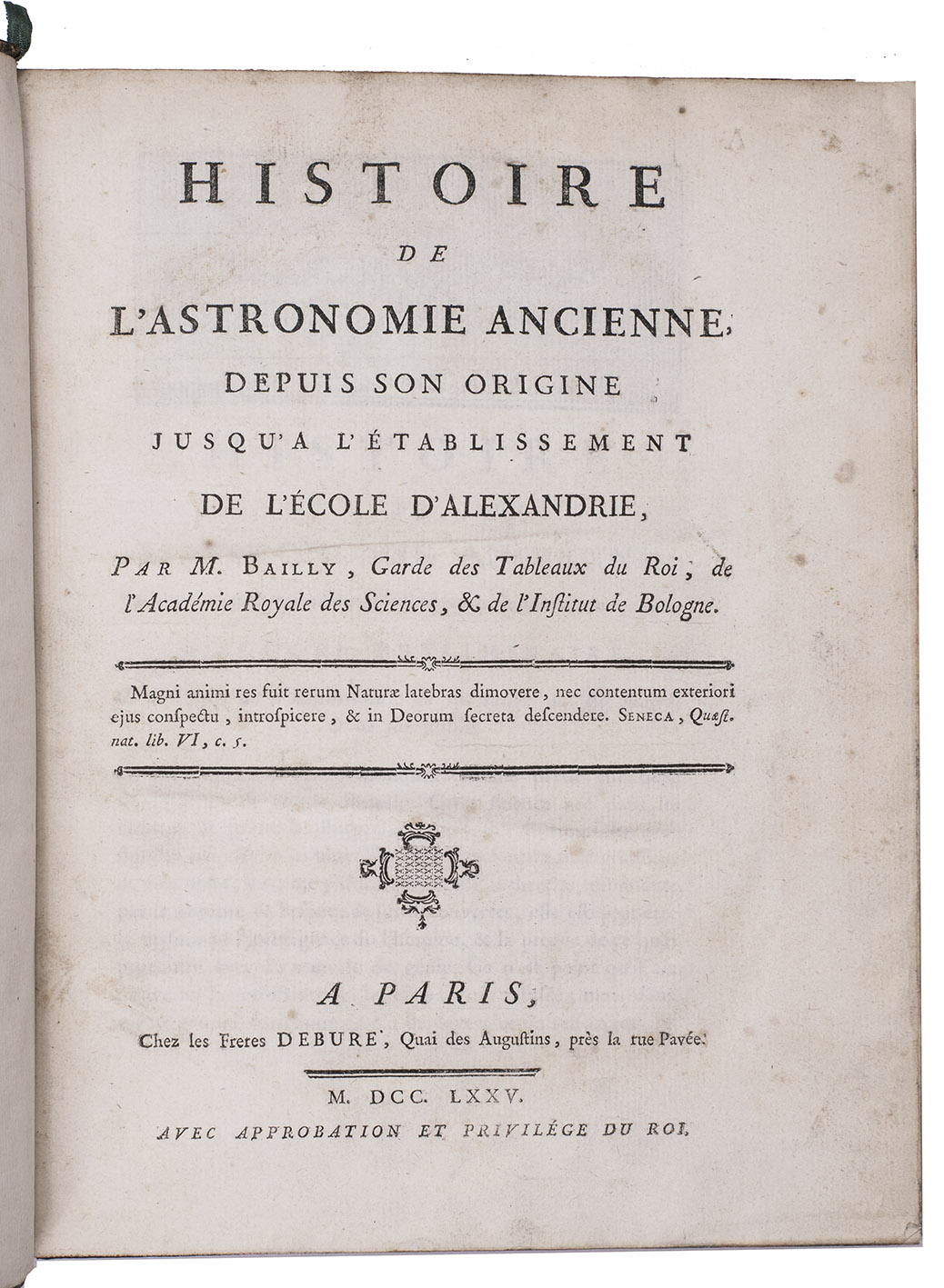 First edition of a history of astronomy from prehistoric times to the Alexandrian school in the third century BC, by Jean-Sylvain Bailly. It covers not only European and biblical sources but also the cosmographical concepts of Chinese, Egyptian, Persian and Chaldean astronomers. Some of the surviving artefacts that provided a basis for his studies are illustrated in the plates, which are designed to fold out so that one can view them while paging through the text.