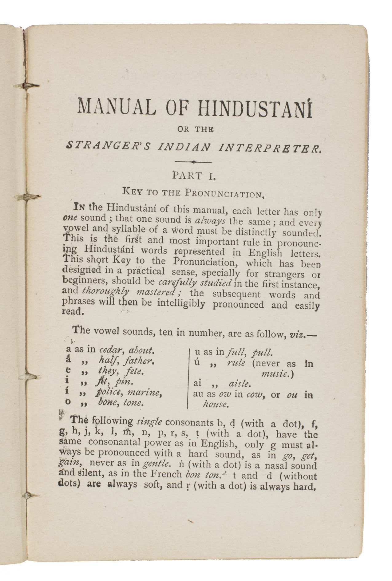 With a large drawing on the front endpapers of flowers, an owner's inscription on the front pastedown, and an inscription on the first flyleaf, which appears to be a packing list in English. The binding shows some signs of wear, with a water stain on the upper part of the back board, the cloth has somewhat frayed along the edges of the boards, and the spine has discoloured. The leaves have somewhat browned. Otherwise in good condition. This edition not in WorldCat; cf. BM, General catalogue, vol 2, p. 281-1073 (other ed.); Safadi, A., The colonial construction of Hindustani 1800-1947, 2012, pp. 1 and 38.