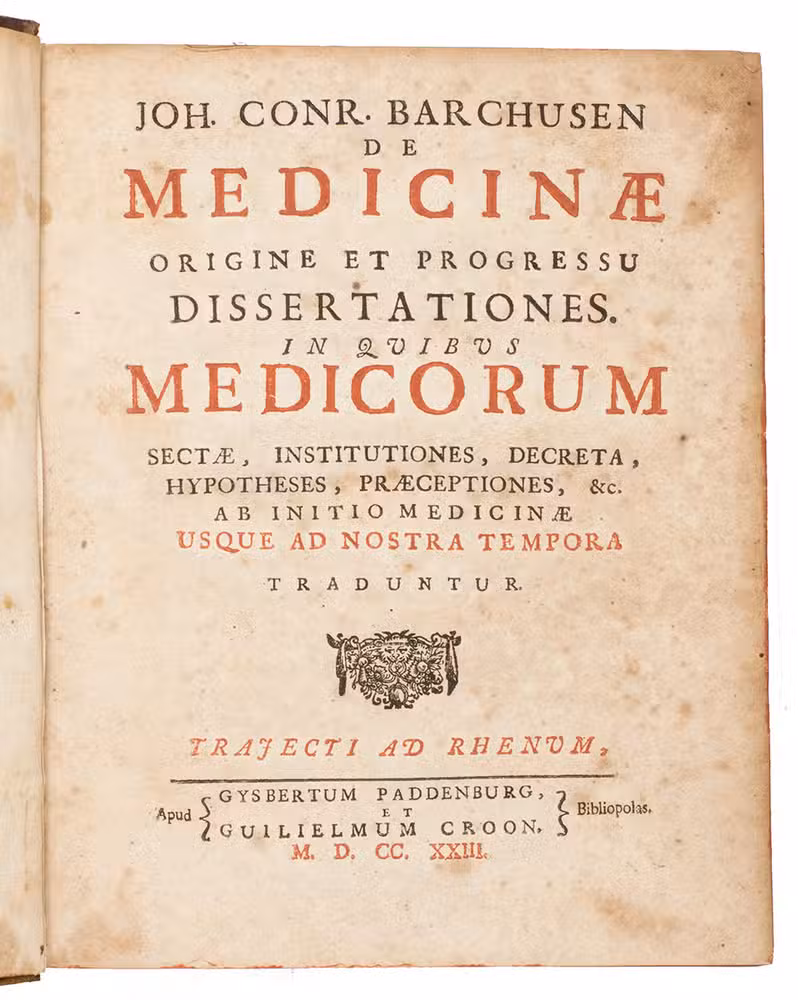 Completely revised edition of a collection of 26 texts on the history of medical and chemical theories by an expert on medicine and chemistry, Johann Conrad Barchusen (1666-1723). Among the examined authors are Paracelsus, Crollius, Van Helmont, Fludd, Campanella, and many more. The work includes sections dedicated to Greek, Arabic, Latin, Egyptian, and Asian medical theories and practices, including Chinese acupuncture, both ancient and contemporary.