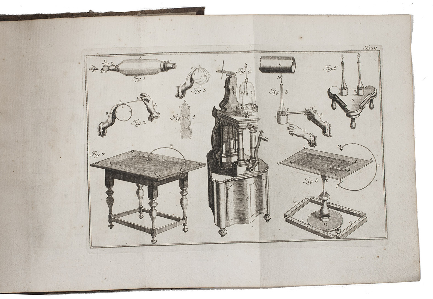 Ad 2: First edition, in the original Latin, of a collection of experiments and observations explaining the nature and properties of residual static electricity. Beccaria's interest in electricity "was reawakened by the work of a former student, G.F. Cigna, who in 1765 published an account of experiments that developed Nollet's elaboration of Symmer's famous manipulations with electrified silk stockings. Beccaria pursued these experiments with all his skill, inventiveness, and energy, largely because they seemed to favour the anti-Franklinian double-fluid theory. ... Beccaria, who would not admit action-at-a-distance, supplied this deficiency with a complicated scheme of electrical atmospheres and "vindicating," or regenerating, electricity. These ideas ... subsequently led Volta, while seeking alternatives to them, to the invention of the electrophorus" (DSB).
