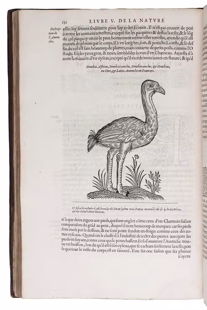 With an early owners inscription on the title page: "Jure haeriditatis sum Vincislai Hogenillars(?) à Davenssville(?)" and the library stamp of the art collector Candidus Ritter von Engelshofen (1803-66) with his inventory number 2275. Further with on pastedowns the bookplates of Franz, count of Thun-Hohenstein-Tetschen and that of Wynne Rice Hugh Jeudwine (1920-1984), author of the 1979 book, Art and style in printed books: six centuries of typography, design and illustration. Some faint thumbing on the title page, a minor water stain in the gutter/foot margin (not touching the text) and some pages slightly foxed, otherwise still in very good condition. The binding rebacked and restored. Anker 9; Brunet I, 762; Mengel, Ellis Collection 221; Mortimer (French) 50; Nissen, IVB 86; Ronsil 189; Wood, p. 230; Zimmer, p. 52; cf. Facs. ed. with introd. and notes by Philippe Glardon (Geneva, Droz, 1997); Glardon, "Les comparaisons et les monstres: Figures structurales de la description zoologique dans 'L'histoire de la nature des oyseaux' de Pierre Belon du Mans" in: Anthropozoologica XXXIII (1990), pp. 27-43.