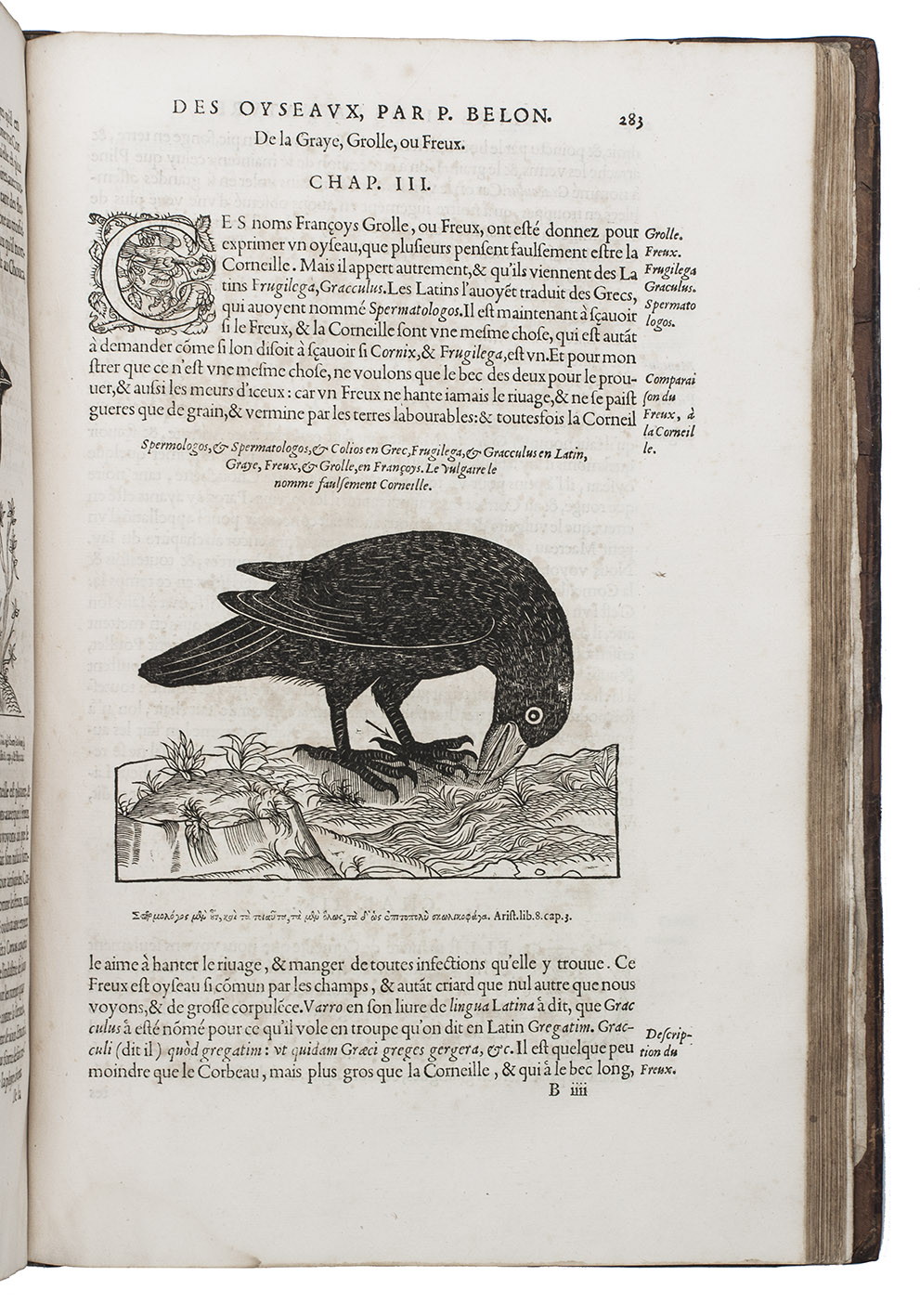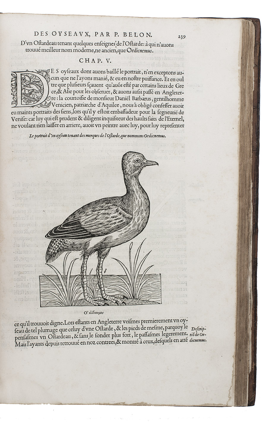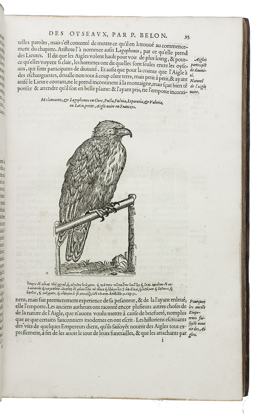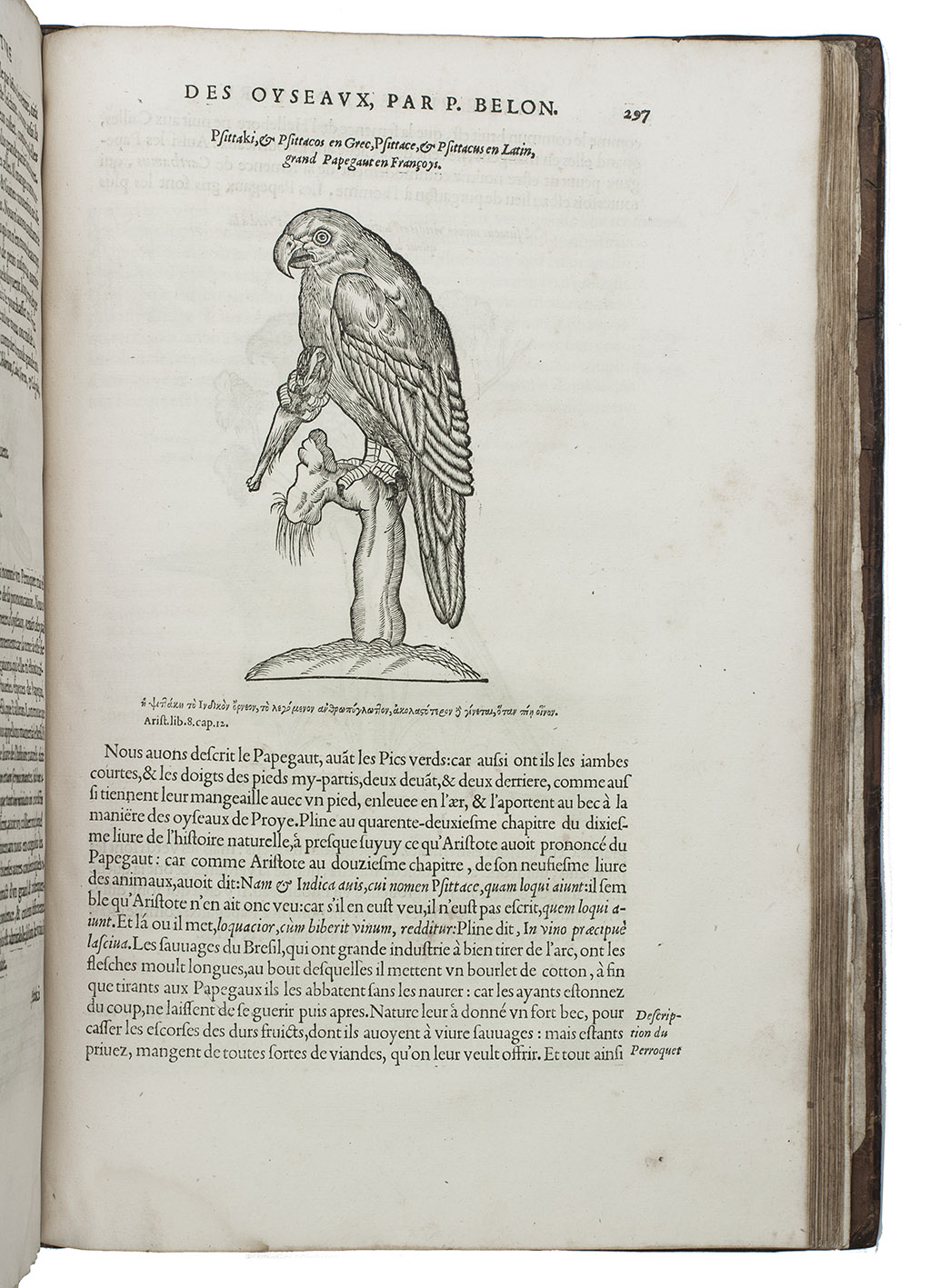 First and only early edition of an extremely important ornithological work in which Belon attempted to match birds named by Aristotle and Pliny with those then current in France. It is one of the first ornithological compendiums to be based, at least in part, on field observations, and "one of the earliest books dealing entirely with birds" (Zimmer). The work is divided into 7 parts, each with its own title-page: the first on the anatomy and physiology of birds; the second on birds of prey; the third on swimming birds; the fourth on shore birds; the fifth on galliformes (fowl); the sixth on crows and similar species; and the seventh on songbirds. The second part also includes an chapter on falconry.