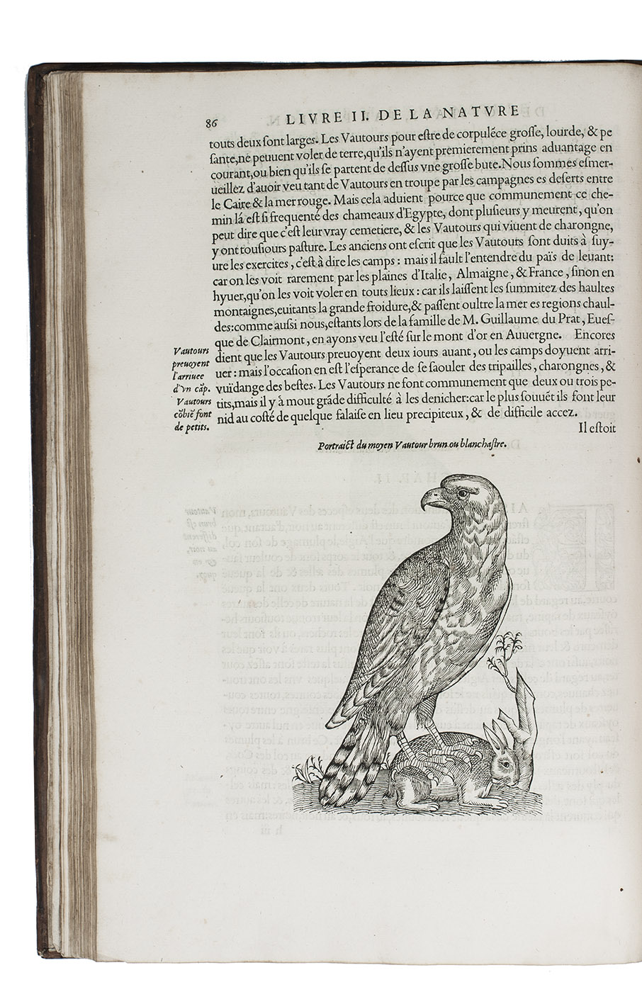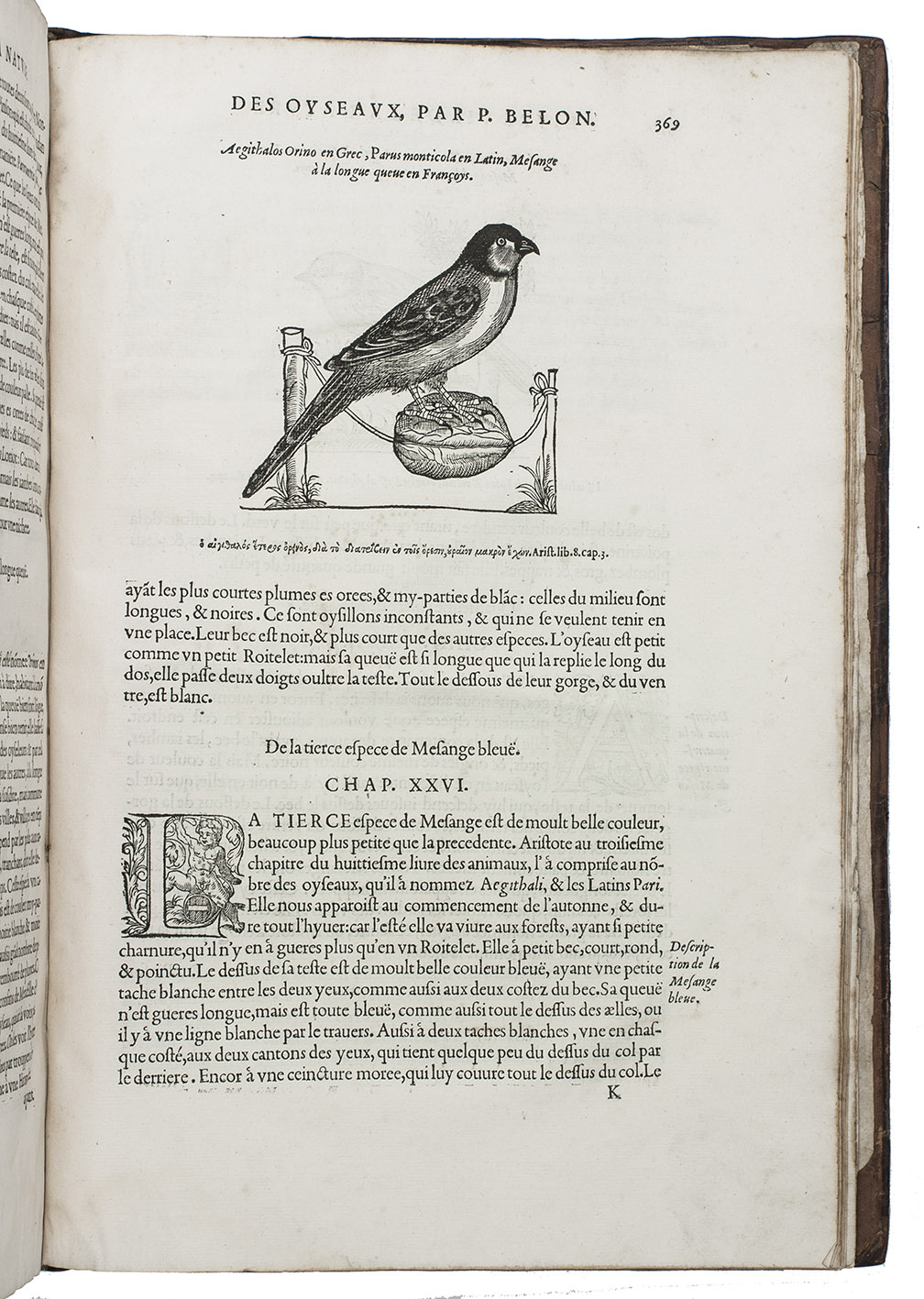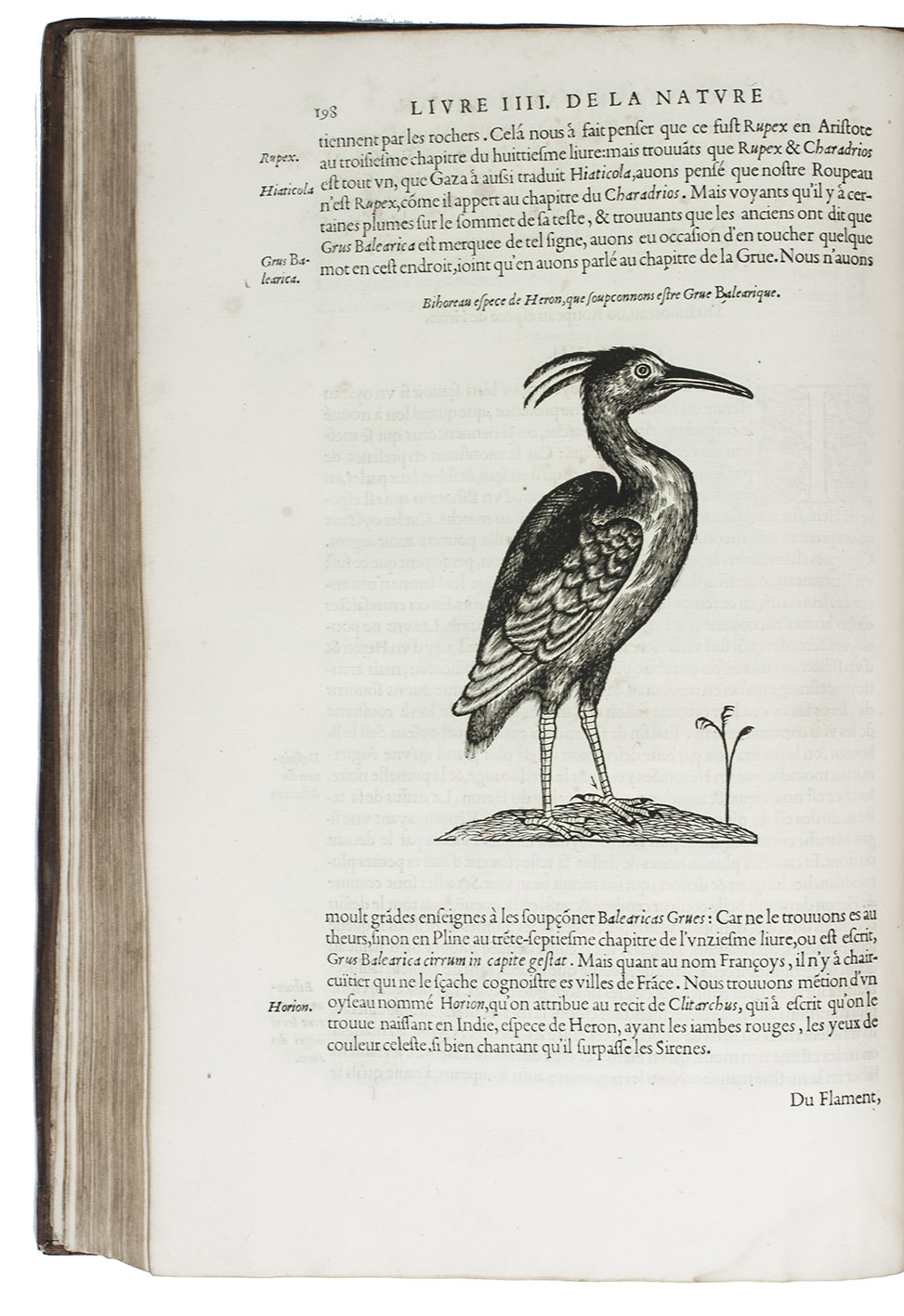 First and only early edition of an extremely important ornithological work in which Belon attempted to match birds named by Aristotle and Pliny with those then current in France. It is one of the first ornithological compendiums to be based, at least in part, on field observations, and "one of the earliest books dealing entirely with birds" (Zimmer). The work is divided into 7 parts, each with its own title-page: the first on the anatomy and physiology of birds; the second on birds of prey; the third on swimming birds; the fourth on shore birds; the fifth on galliformes (fowl); the sixth on crows and similar species; and the seventh on songbirds. The second part also includes an chapter on falconry.