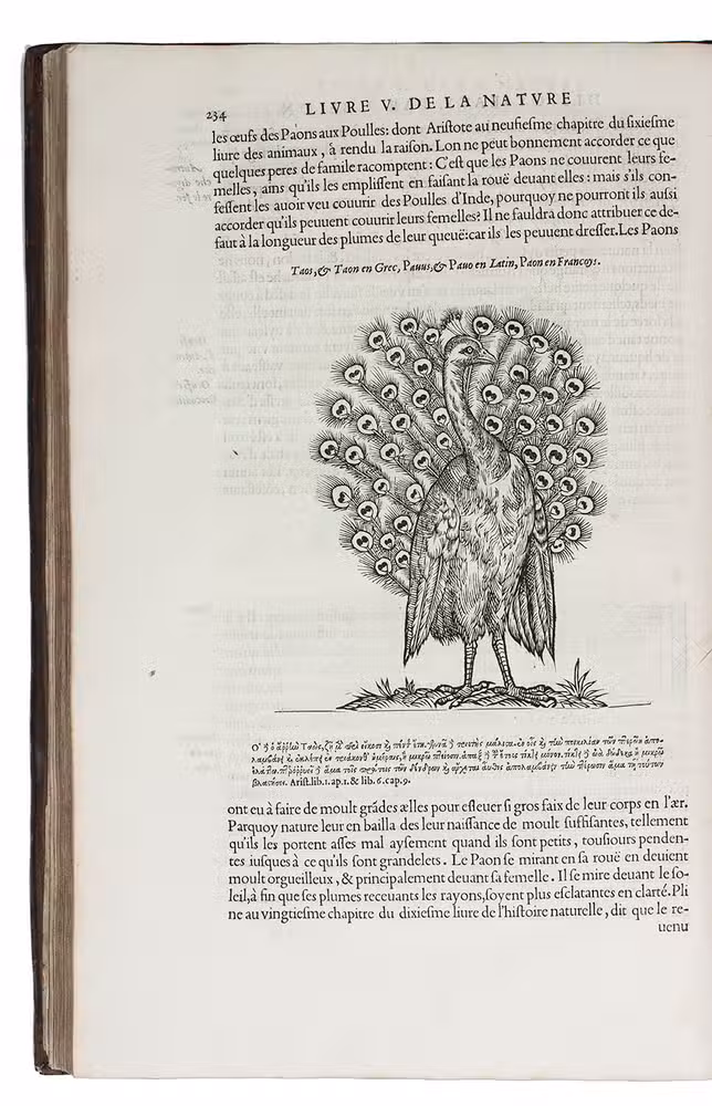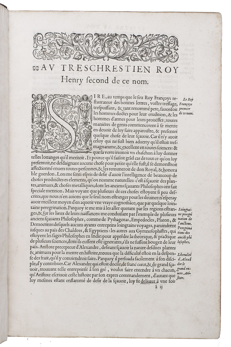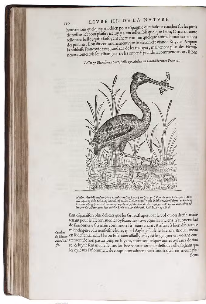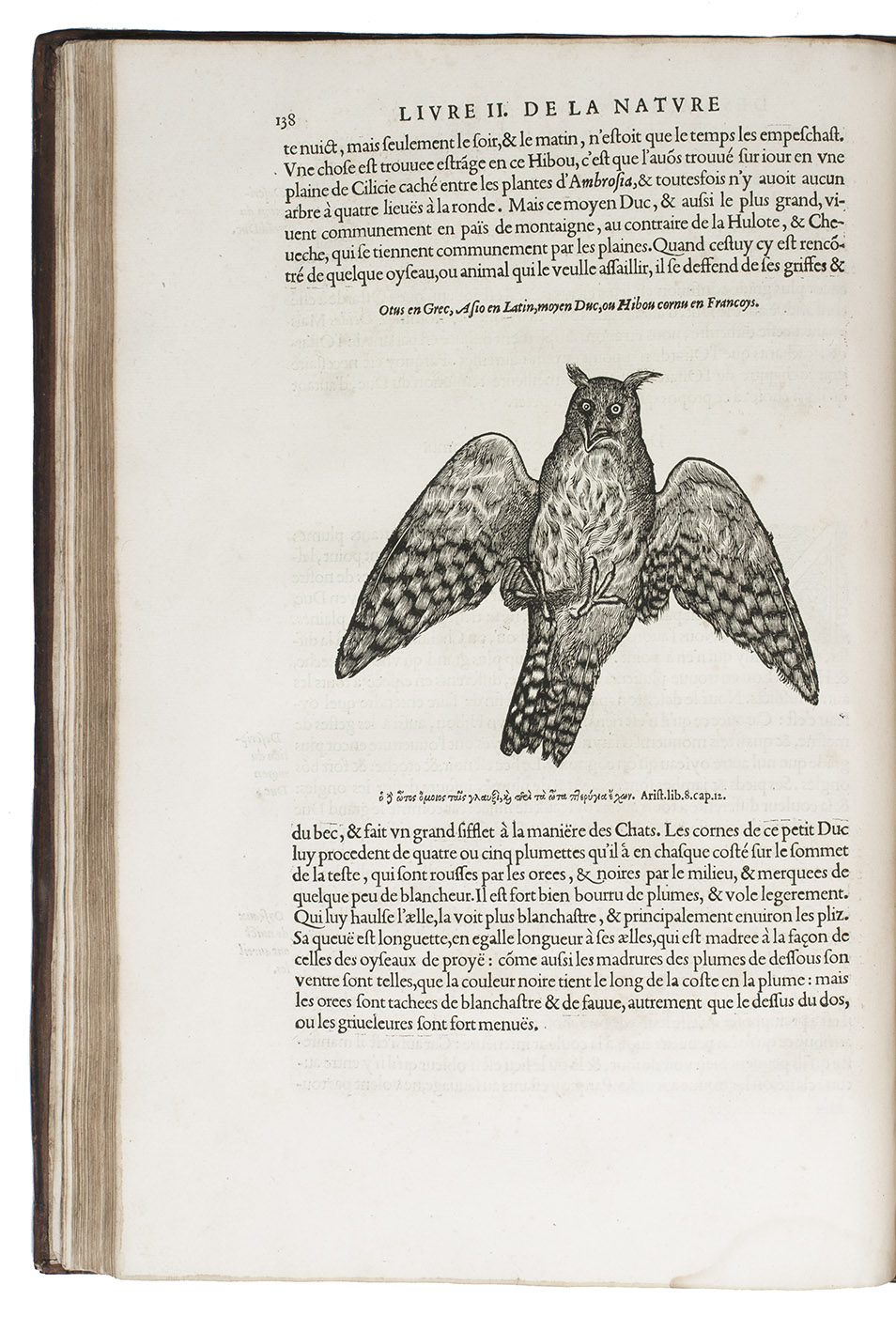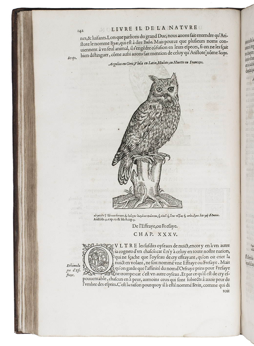 First and only early edition of an extremely important ornithological work in which Belon attempted to match birds named by Aristotle and Pliny with those then current in France. It is one of the first ornithological compendiums to be based, at least in part, on field observations, and "one of the earliest books dealing entirely with birds" (Zimmer). The work is divided into 7 parts, each with its own title-page: the first on the anatomy and physiology of birds; the second on birds of prey; the third on swimming birds; the fourth on shore birds; the fifth on galliformes (fowl); the sixth on crows and similar species; and the seventh on songbirds. The second part also includes an chapter on falconry.
