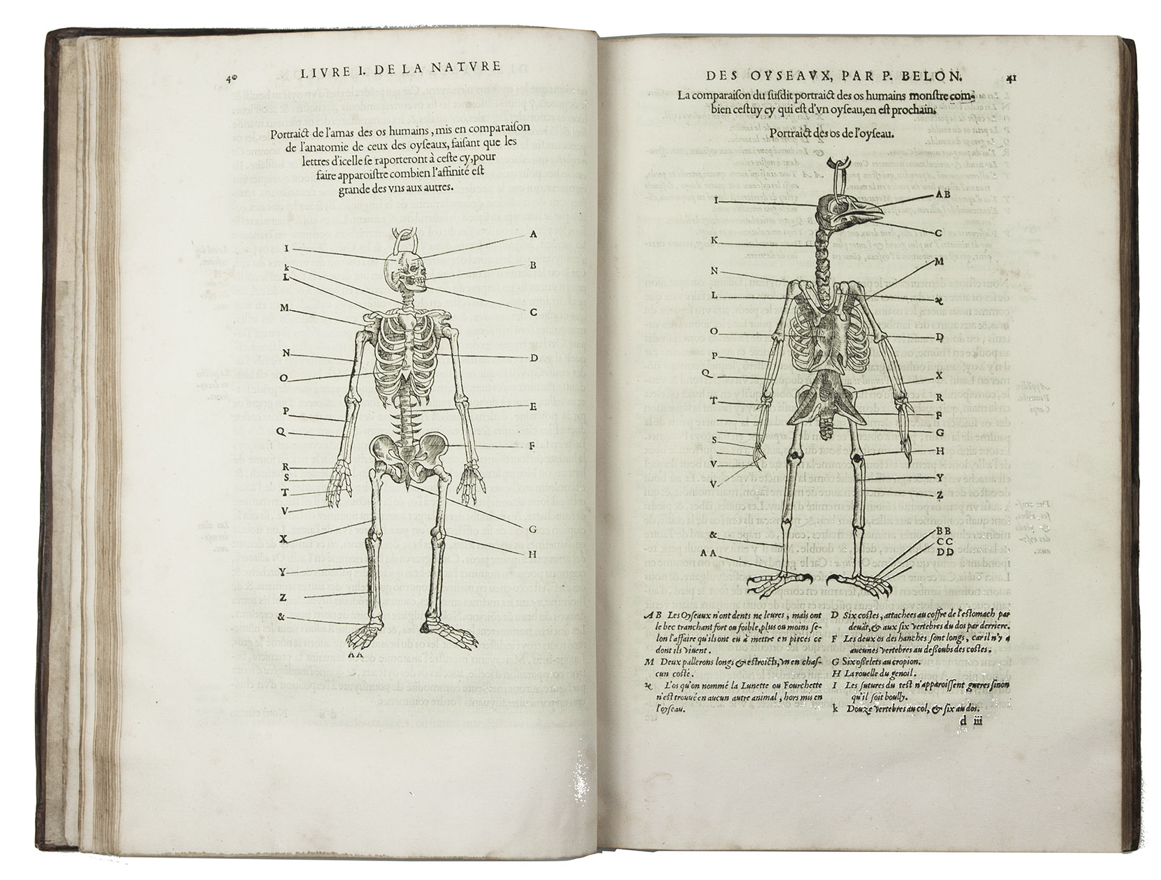 The author was a pioneer of comparative anatomy, illustrating and describing the homologies of human and avian skeletons (he could not have imagined that this would one day lead to Dawin's idea that they were actually relatives), and re-grouping birds according to their anatomy. Many of the woodcuts were taken from actual specimens. In his preface Belon acknowledges the painter Pierre Goudet or Gourdel(le), whose skills he has used most extensively, so he must have drawn the birds illustrated, though the woodblocks were cut by various artists.