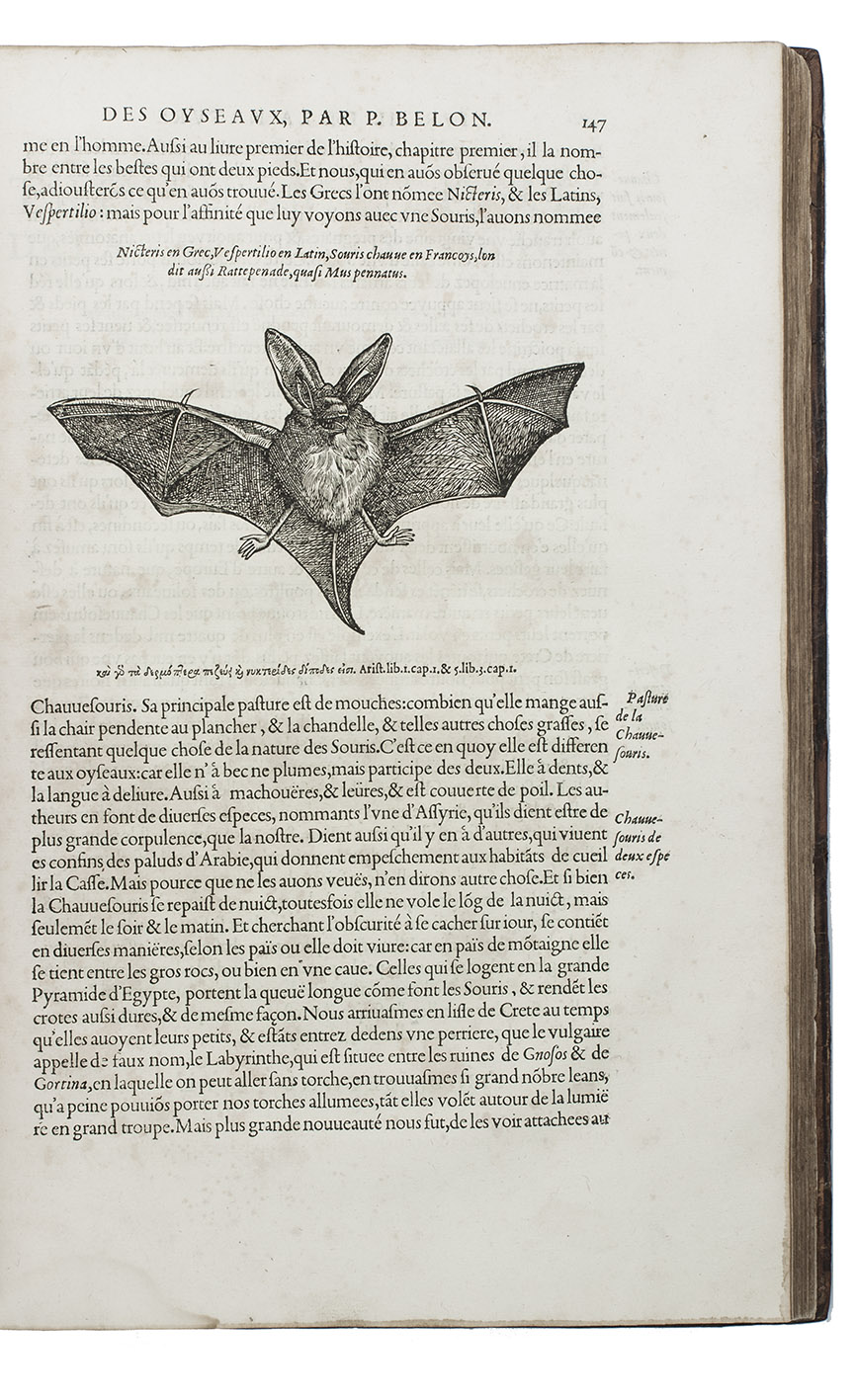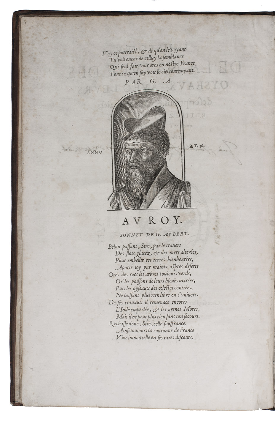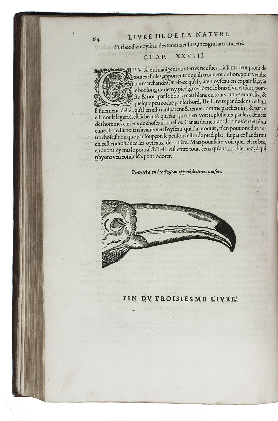 Paris, Guillaume Cavellat (colophon: printed by Benoit Prévost), 1555. 7 parts in 1 volume. Folio. With a woodcut portrait on the back of the title page (apparently of the dedicatee King Henri II, though copied in other books as a portrait of the author), large woodcuts of the skeletons of a man and a bird on pp. 40-41, plus 158 woodcuts (157 birds, 1 bat) in the text. Contemporary blind- and gold-tooled calf (rebacked, with the original backstrip laid down). [28], 381, [1], [2 blank] pp.
