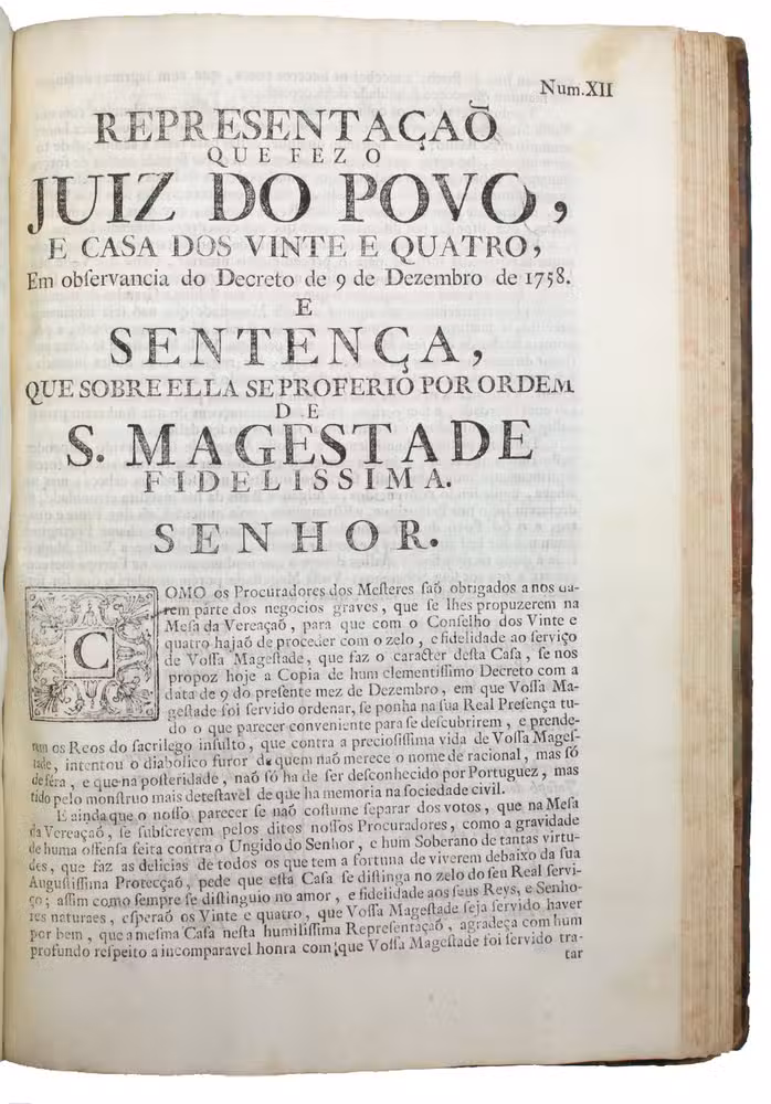 This copy is of particular interest, as a manuscript addition in an elegant contemporary hand has been added to the verso of the title page for document XII, the sentencing of the Távoras, and presents a copy of the speech made by the Judge of the People to the king: "O Juiz do Povo tem a honra de pedir a N.Ex.a ponha na Real prezença de S. Mag. que oseu justifismo Edital foi lido pelo fiel Povo de Lisboa com muitas lágrimas, que todo elle pede justiça contra humatentado de que não há exemplo nage delidade Portuguese, e que para avingar espera com impaciência as Reas ordens de S. Mag; pois todo elle dezeja anciozamente derramar até a última gota de sangue, pela glória e serviço do Mesmo". Recorded just below is the reply of the King: "Reposta de S. Mag.e. Cu não esperava menos de fidelidade dos meus fiéis Vassalos a quem heide corresponder como bom Rey e Pay".
