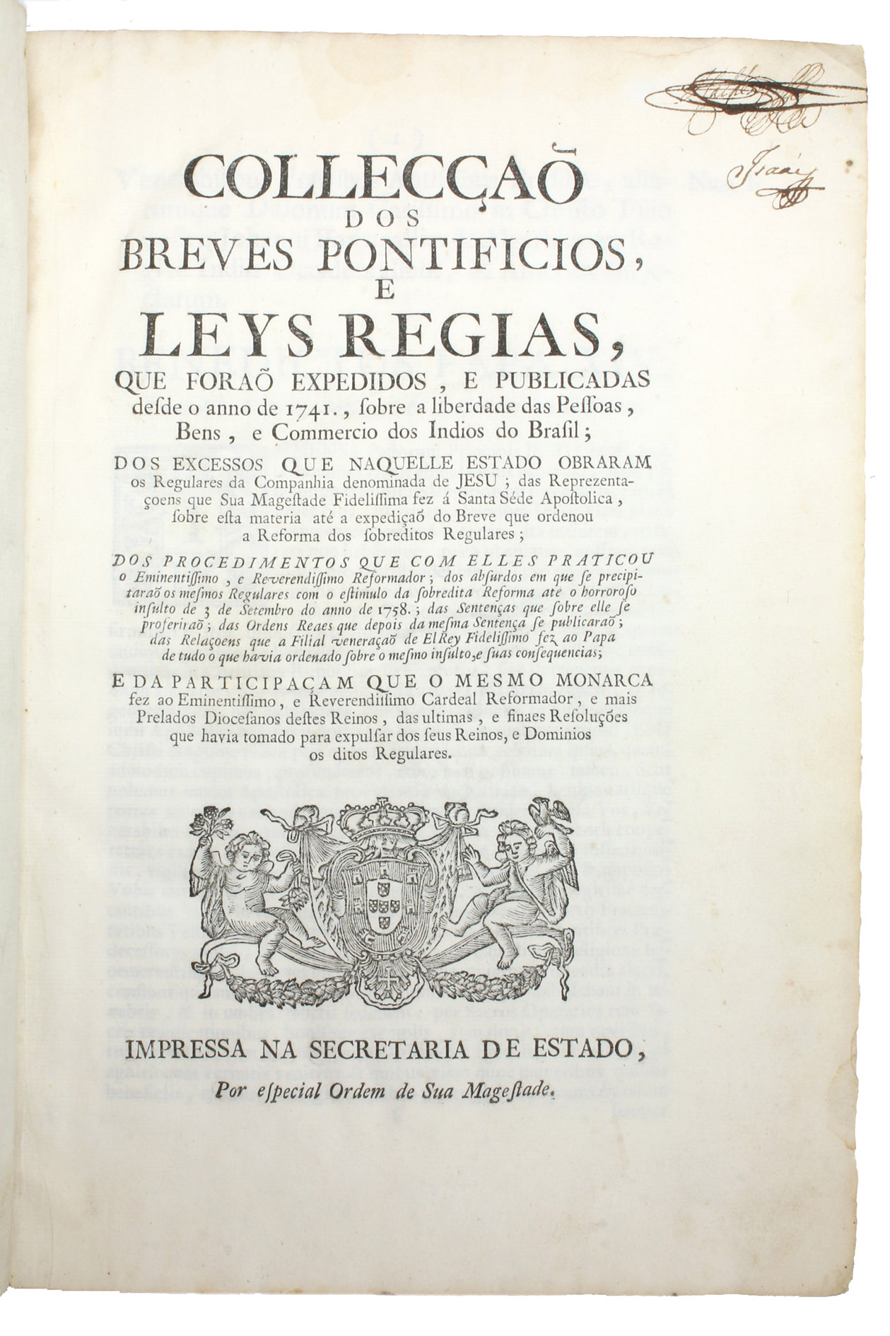 Collecção dos breves Pontificios e leys regias, que forao expedidos, e publicadas desde o anno de 1741, sobre a liberdade das pessoas, bens e commercio dos Indios do Brasil ...