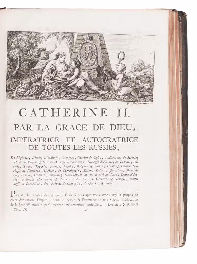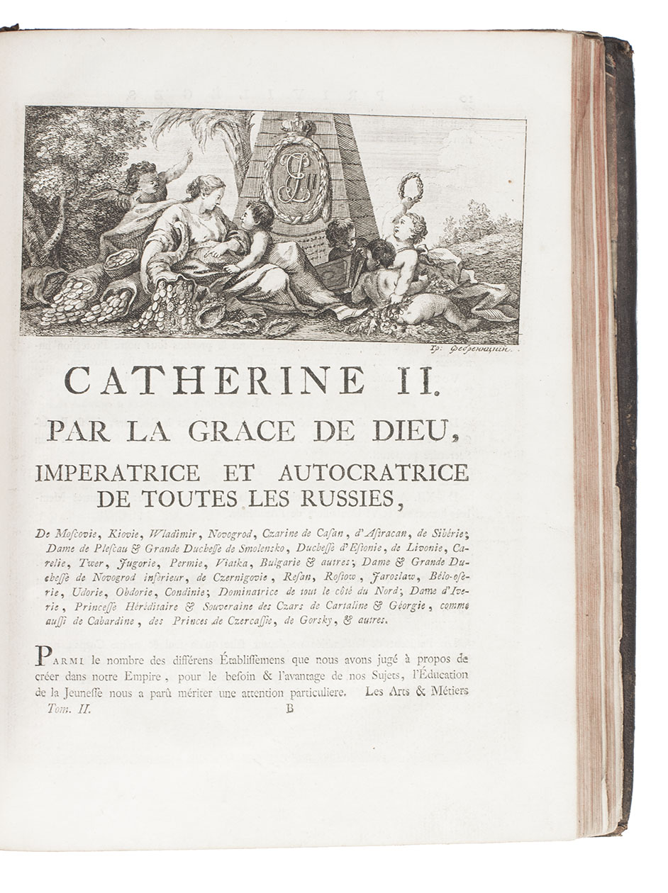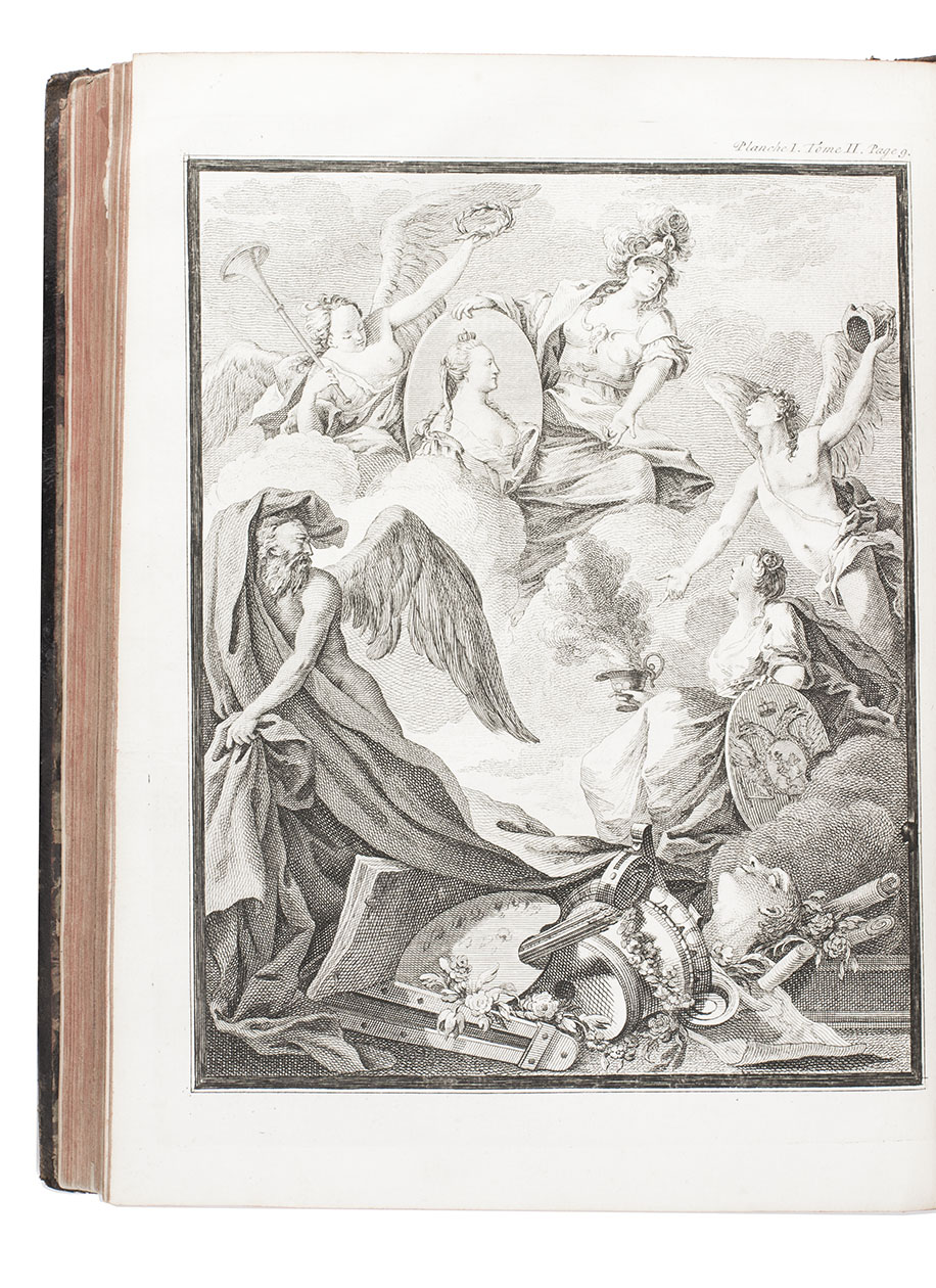 Amsterdam, Marc-Michel Rey, 1775. 2 volumes bound as 1. 4to. With 2 engraved allegorical frontispieces, engraved allegorical plate, 3 large folding engraved plans, 4 folding tables, and 64 large engraved head-pieces, tail-pieces and allegorical engravings in text, including the coat of arms, medal and seal of Catherine the Great of Russia. Contemporary tree calf, rebacked with gold-tooled spine. VI, [2], 160, 42, [2]; 160 pp.