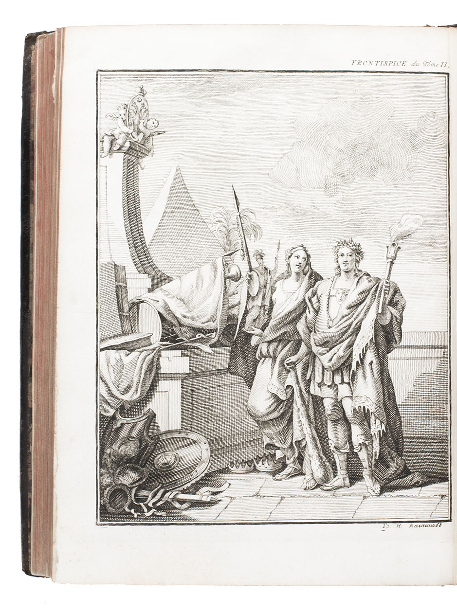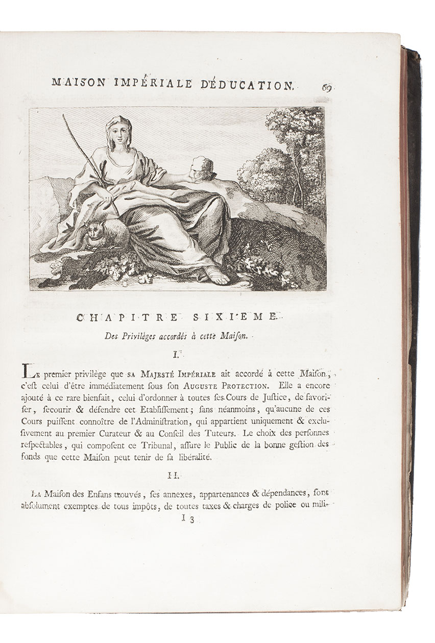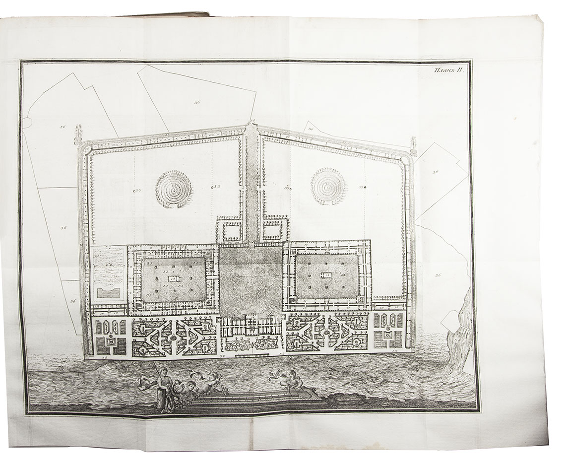 Amsterdam, Marc-Michel Rey, 1775. 2 volumes bound as 1. 4to. With 2 engraved allegorical frontispieces, engraved allegorical plate, 3 large folding engraved plans, 4 folding tables, and 64 large engraved head-pieces, tail-pieces and allegorical engravings in text, including the coat of arms, medal and seal of Catherine the Great of Russia. Contemporary tree calf, rebacked with gold-tooled spine. VI, [2], 160, 42, [2]; 160 pp.