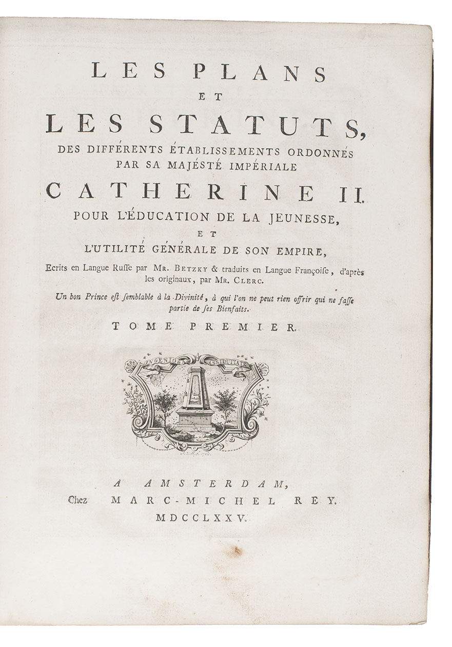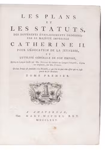 Les plans et les statuts, des différents établissements ordonnés par sa Majésté Impériale Catherine II. pour l'education de la jeunesse, et l'utilité générale de son Empire.