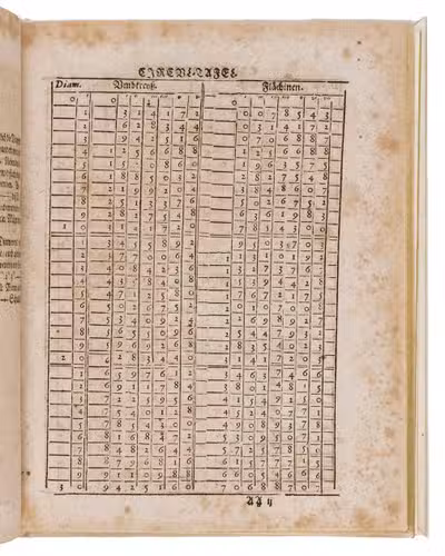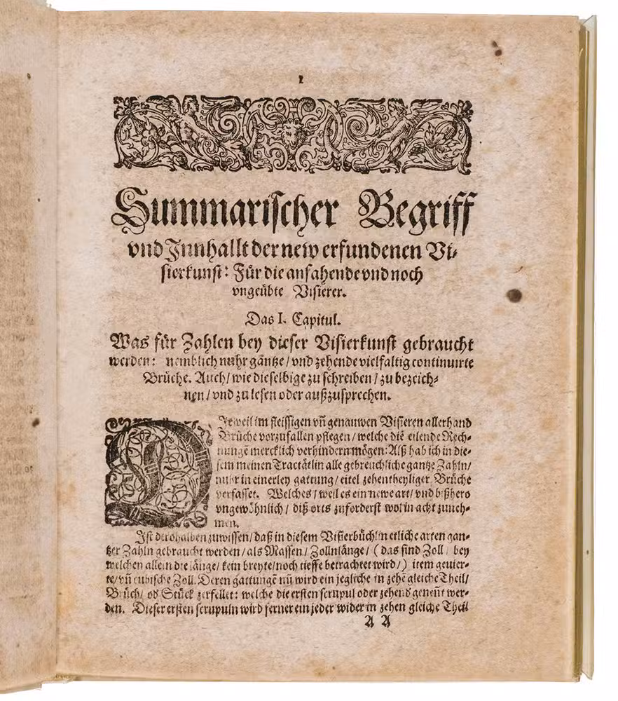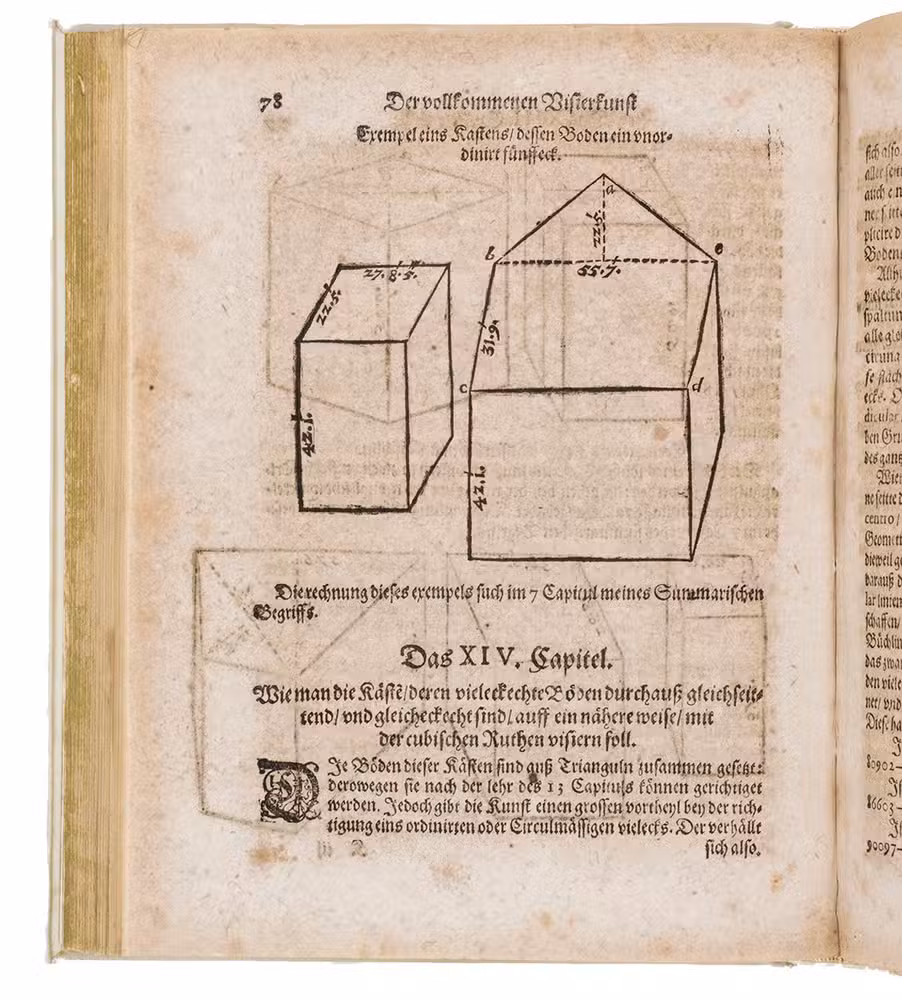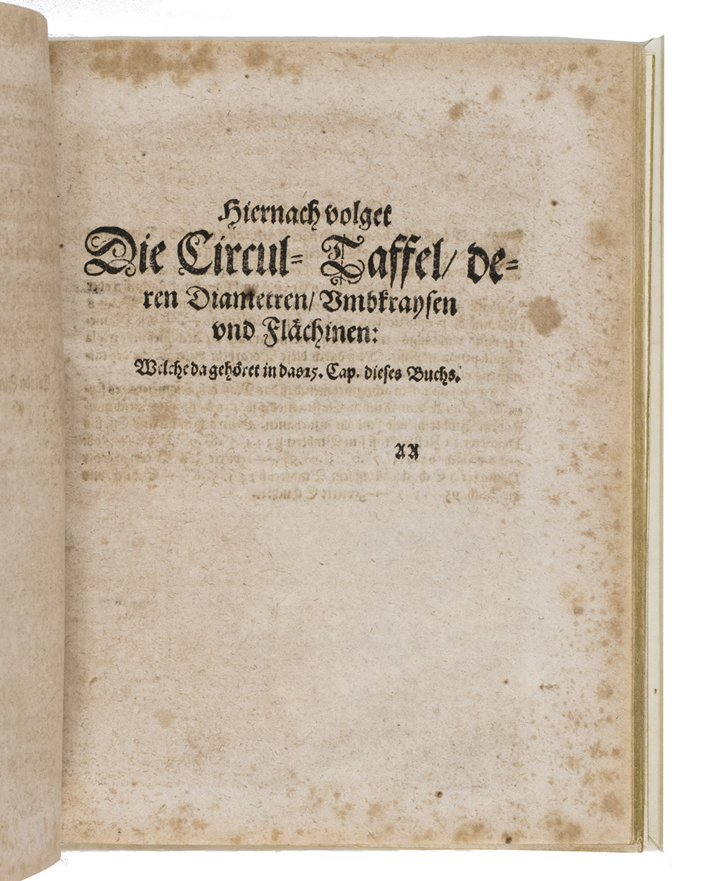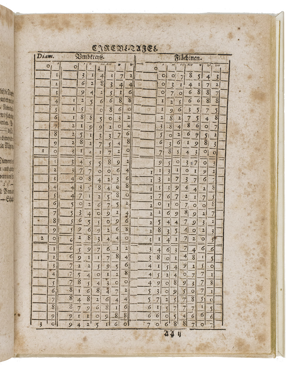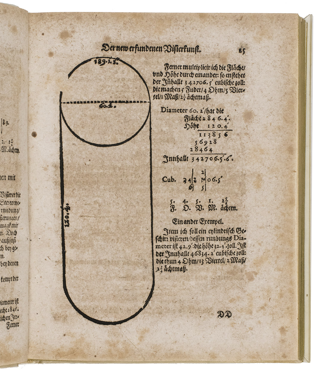 First German edition of an important treatise on solid geometry by the Frankfurt physician and mathematician Johann Hartmann Beyer (1563-1625). It includes calculations of exact or approximate volumes of solid figures such as glasses, buckets and barrels (which Beyer treated as 2 truncated cones put together). The author published a work on decimals, Logistica decimalis, and is sometimes (wrongly) credited with the invention of the decimal fraction. He corresponded with Ludolf van Ceulen and Johannes Kepler: the latter refers to Beyer in his Nova stereometria (1615).