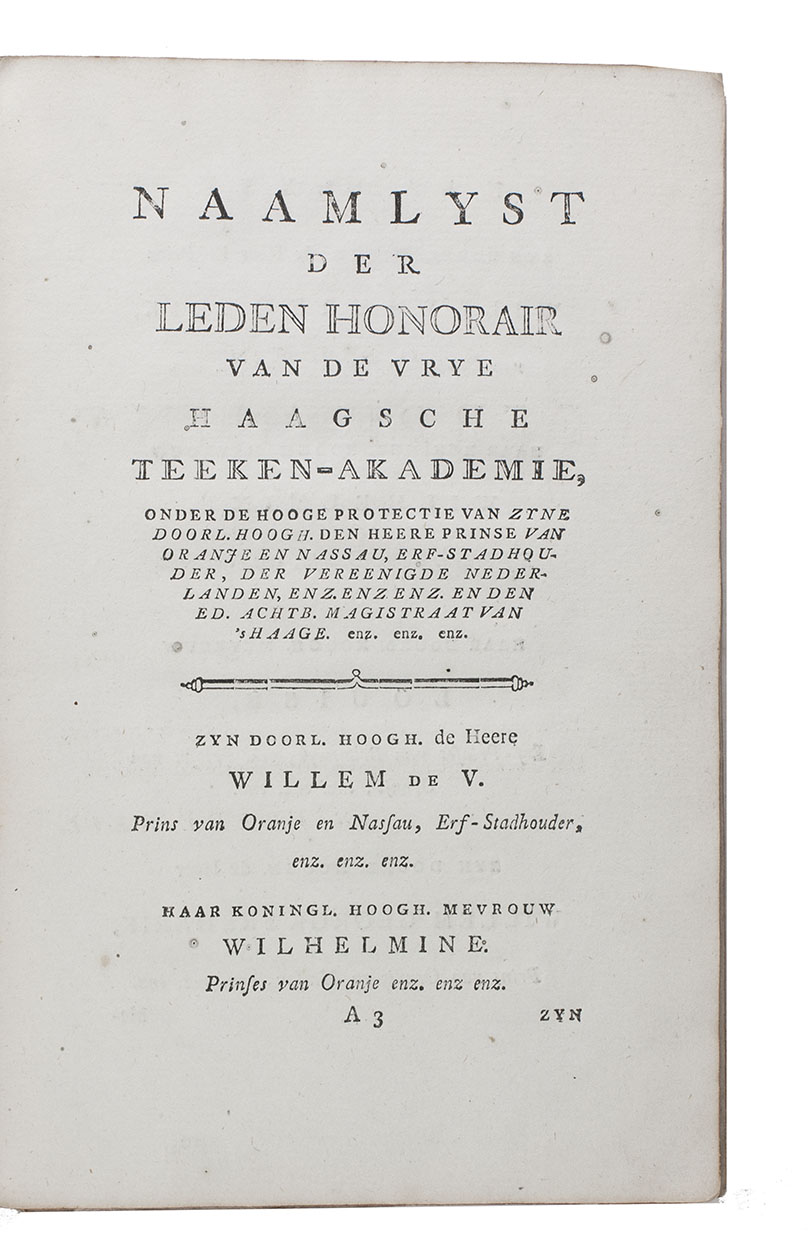 Set of 4 published lectures held on the occasion of the annual award ceremonies at the Vrije Haagsche Teeken-Akademie (the Academy of Art in The Hague). The theme of each lecture is the importance and use of the art of drawing and painting, especially Dutch painting at the end of the 18th and the beginning of the 19th century. All the booklets start with a "naamlyst", a list of names of the members of the Academy.