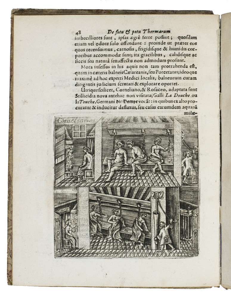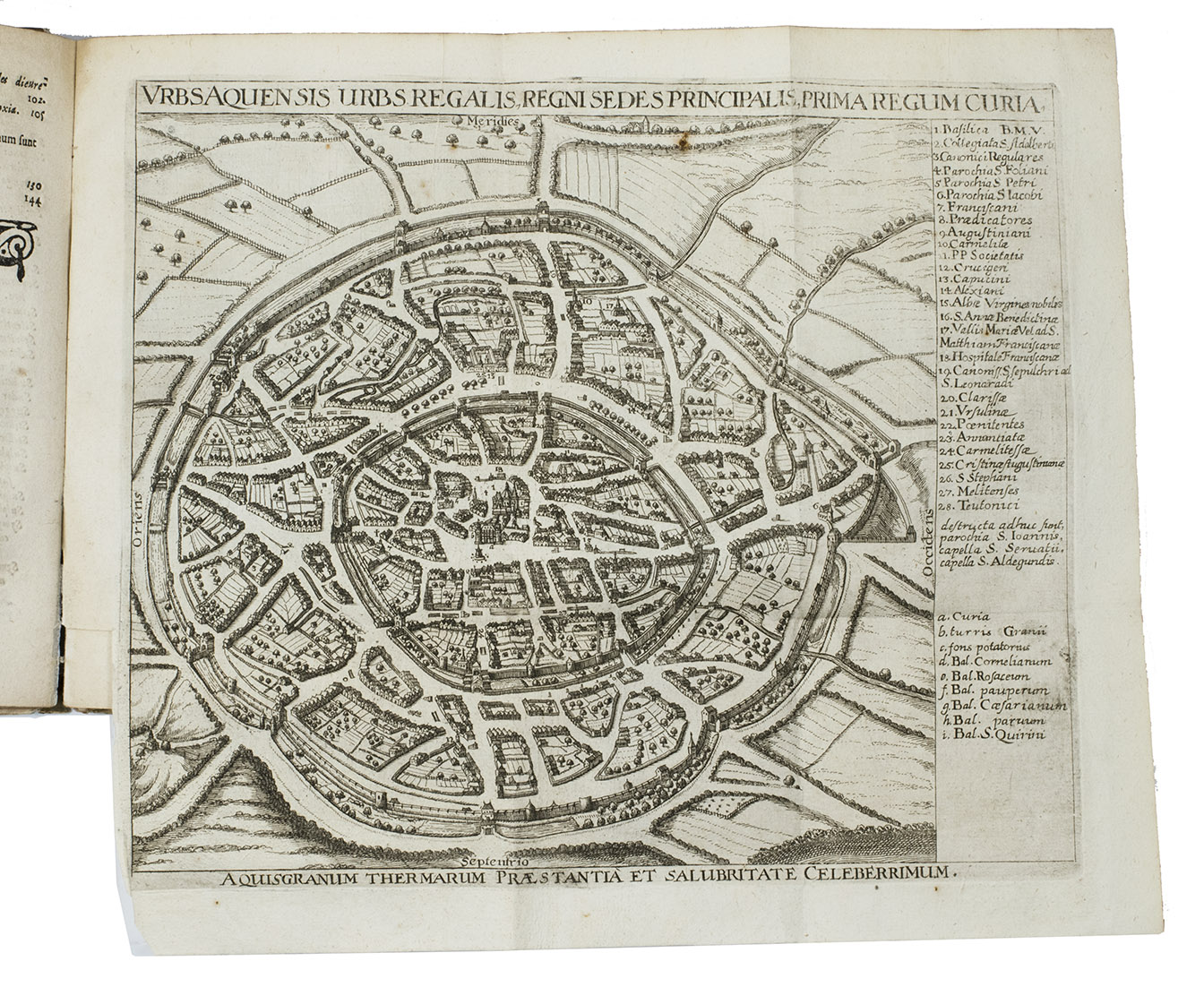 Aachen, Johann Heinrich Clemens, 1688. 4to. With an engraved frontispiece with letterpress imprint and built-up border, Aachen coat of arms pasted on back of frontispiece, engraved coats of arms of 4 dedicatees on back of title-page, full-page engraved portrait of the author, folding engraved plan of Aachen (22.5 x 27 cm), folding engraved view of Burtscheid (11.5 x 24 cm) and 16 smaller engravings in text, depicting scenes and buildings relating to the springs. Contemporary flower-decorated paper over boards, red sprinkled edges. [32], 160, [1], [1 blank] pp.