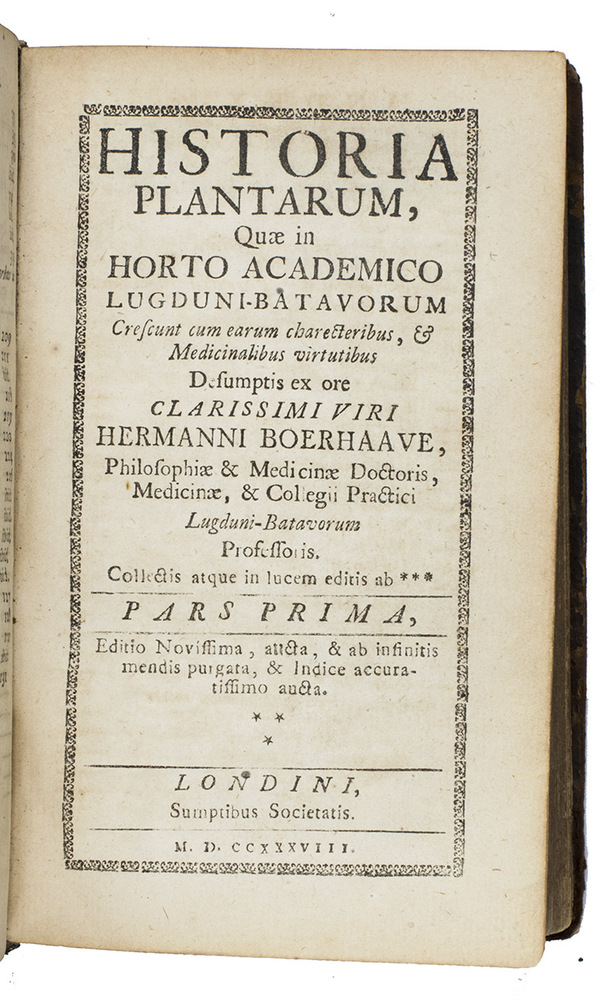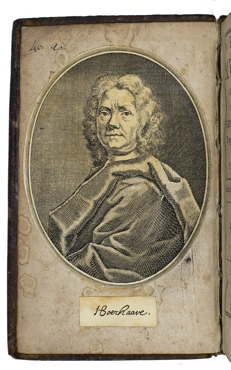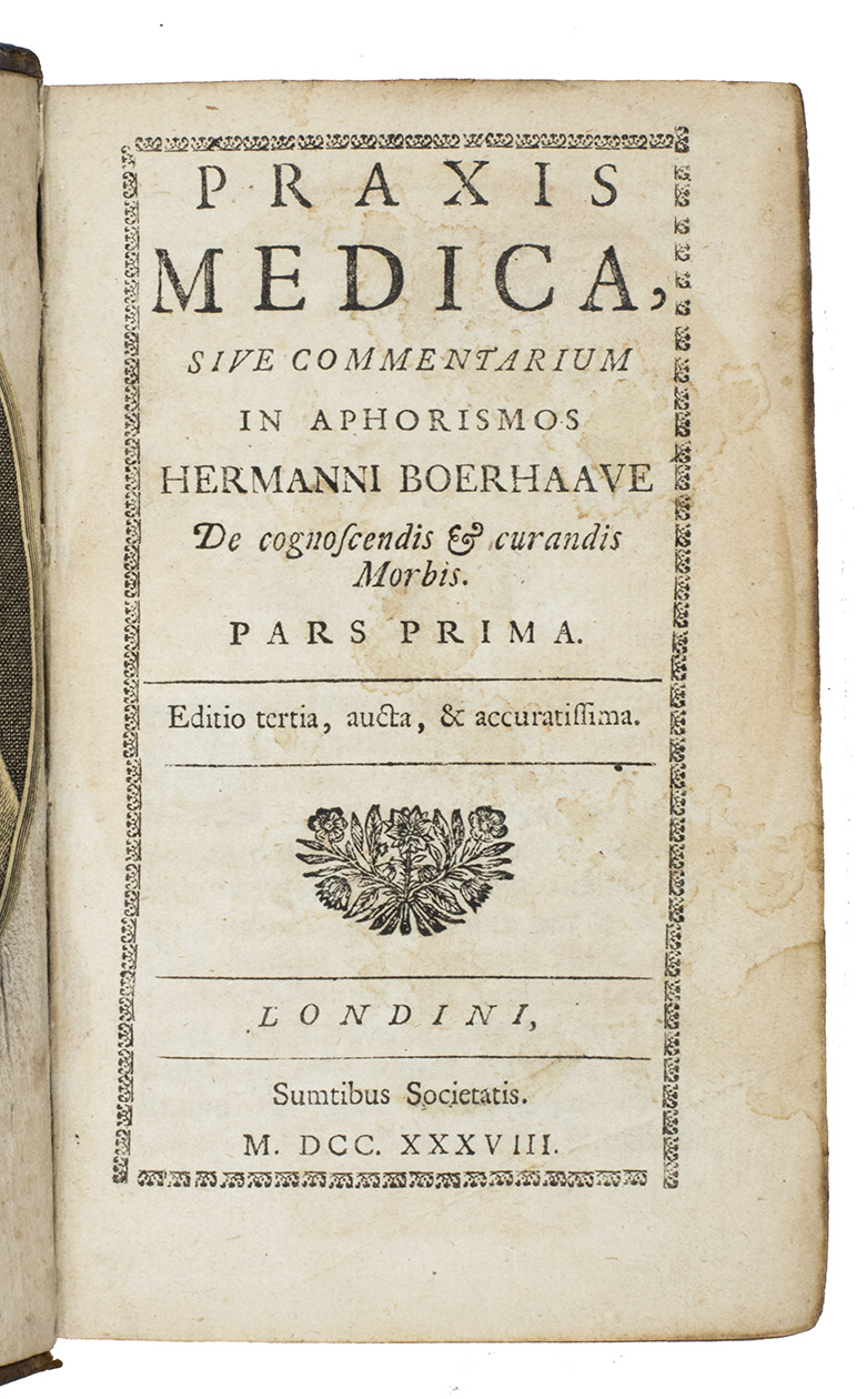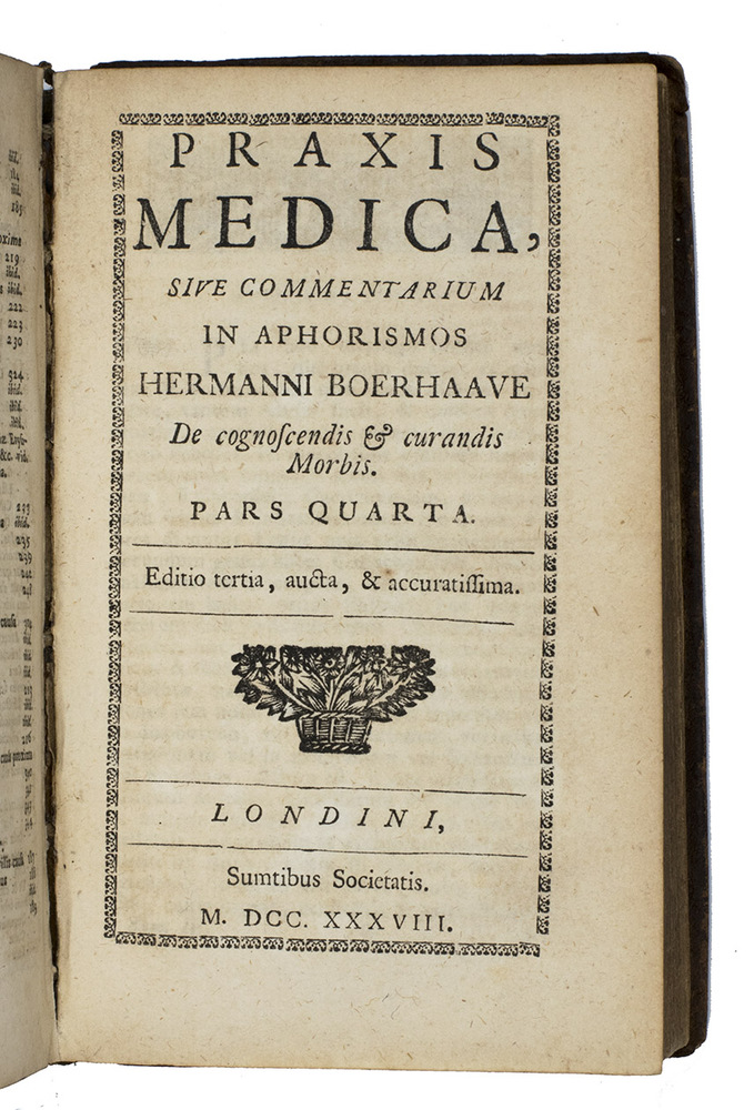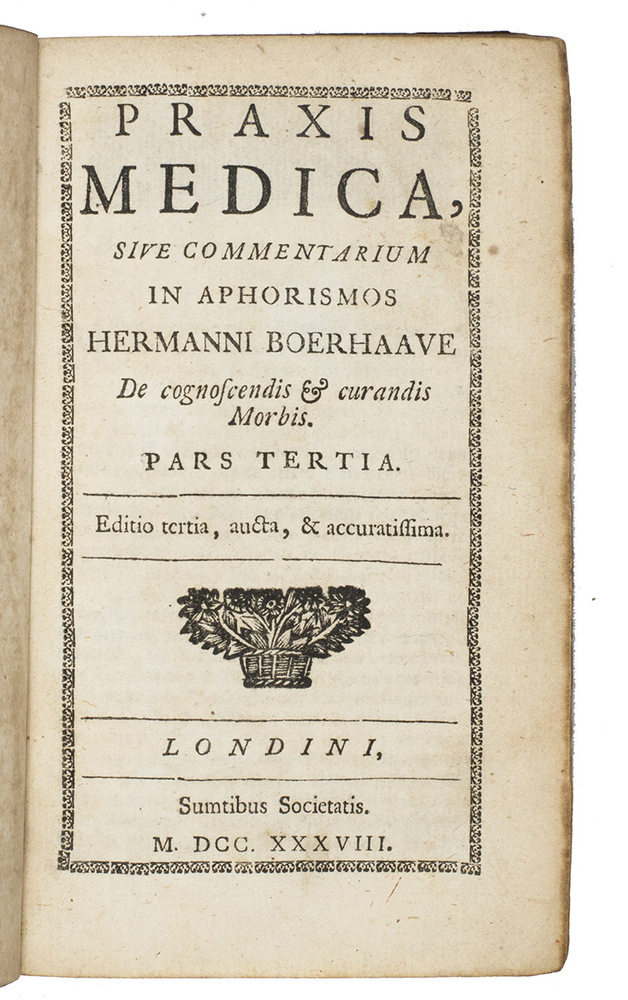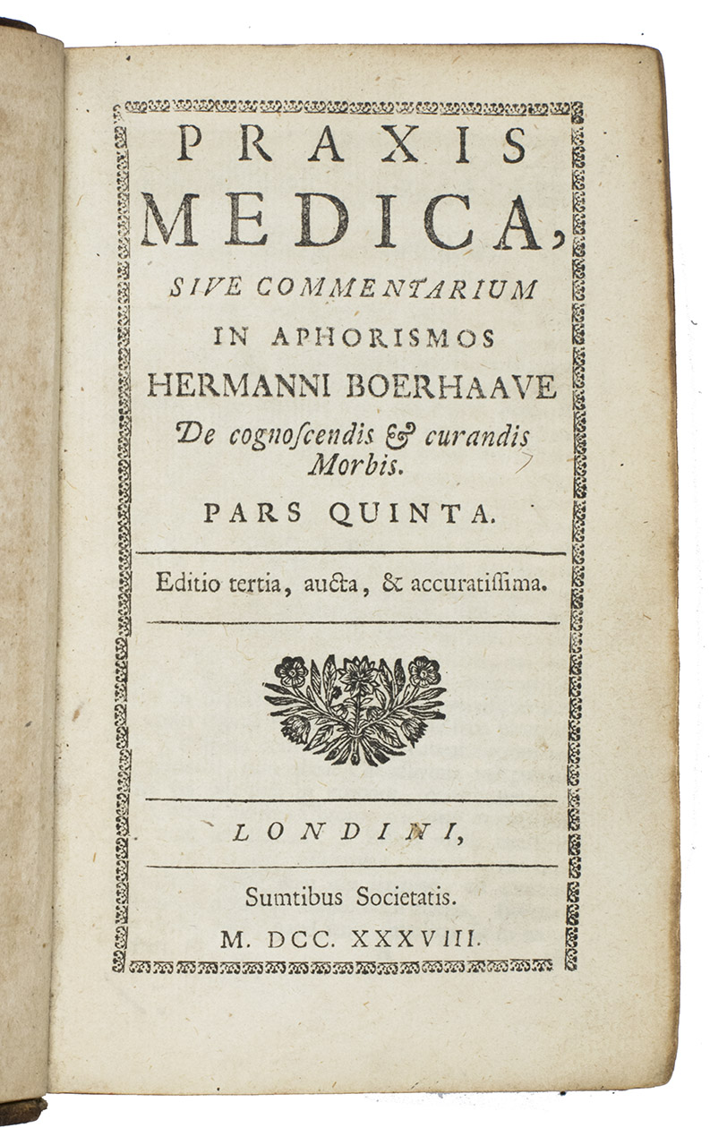 Praxis medica, sive commentarium in aphorismos Hermanni Boerhaave de cognoscendoid & curandis morbis. Pars 1-5. Editio tertia, aucta, & accuratissima.London [= Amsterdam?], sumtibus societatis, 1738. 5 volumes bound as 3. Each title-page with a woodcut vignette and a border built up from typographic ornaments. With an engraved oval portrait of Boerhaave as added as frontispiece, pasted to the first fly-leaf.