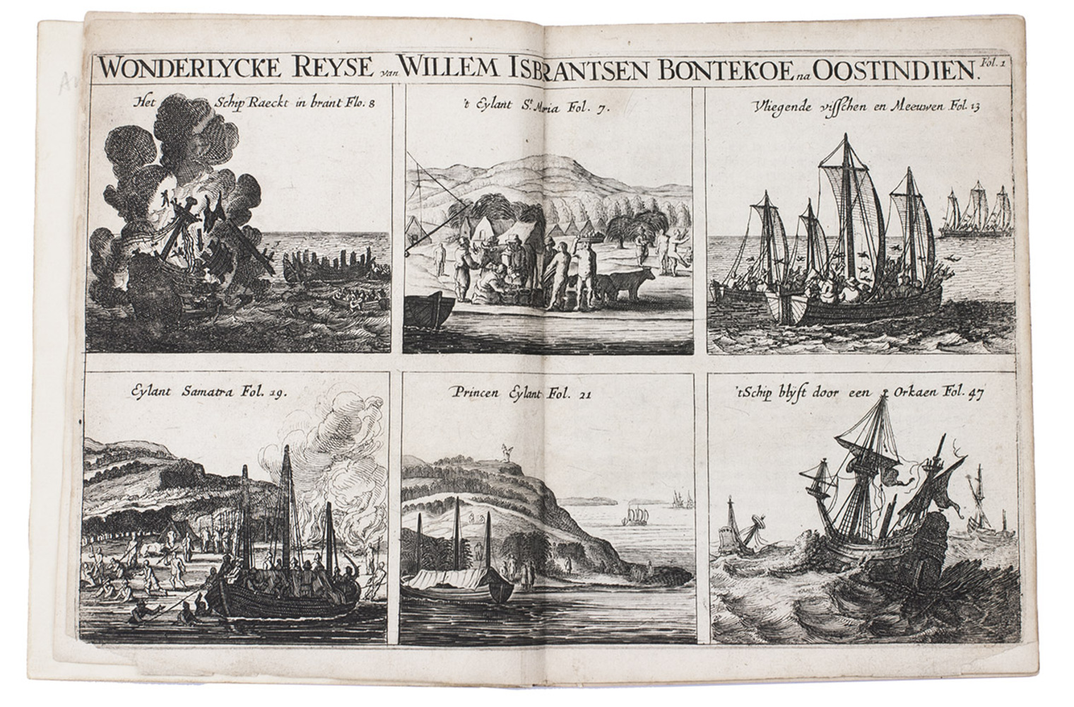 Amsterdam, Joost Hartgers, 1648. 2 parts in 1 volume. 4to. With a double-page engraved plate with 6 views of the ship at fire and in a storm, the islands St. Mary, Samatra and Princes Eyland, and an image of flying fishes. Modern marbled wrappers. [4], 76 pp.