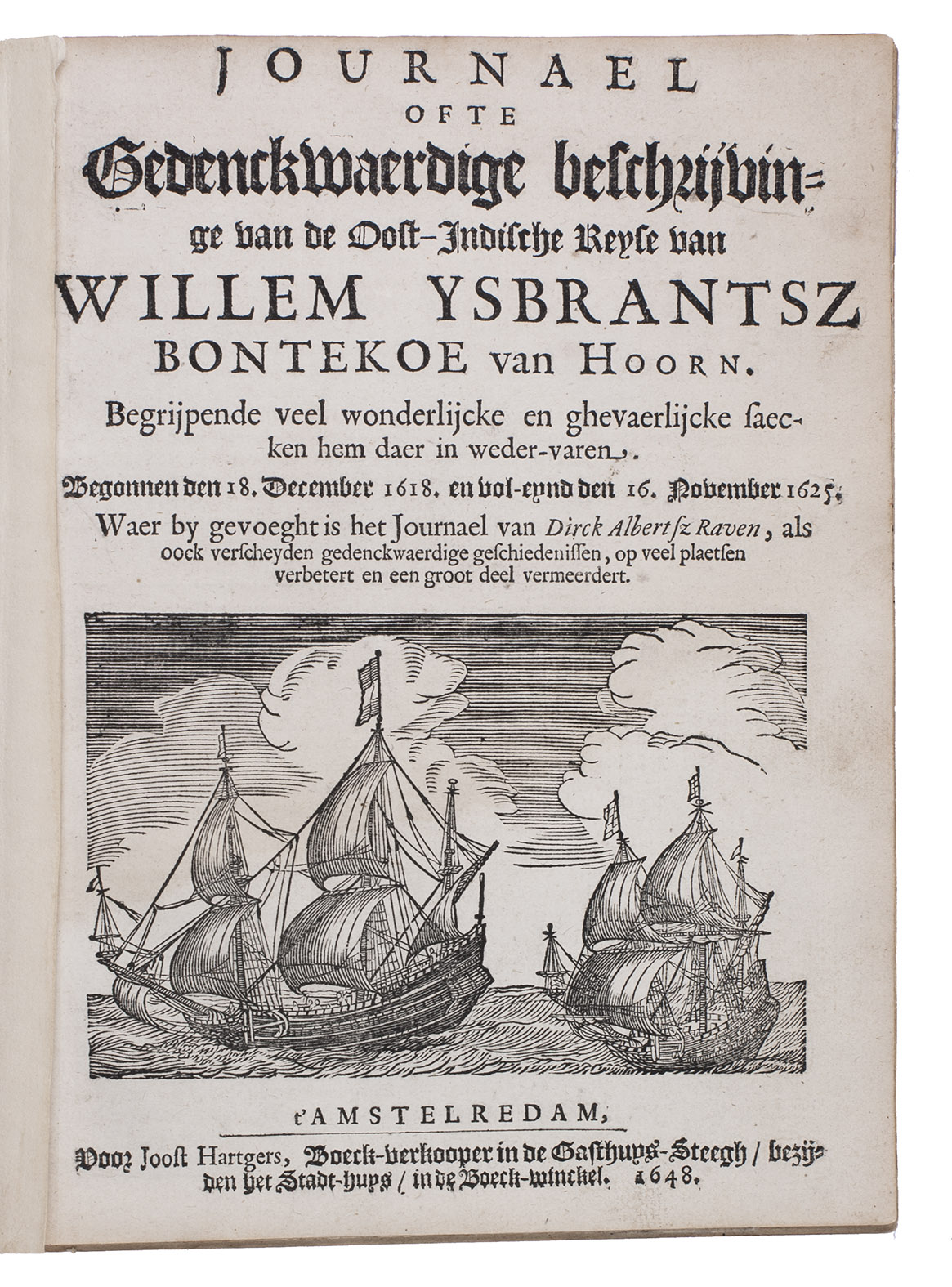 One of the most compelling and entertaining travel accounts of Dutch literature, in one of the earliest and most important editions, the first to be published by Hartgers. Bontekoe details his eventful 8-year voyage to the East Indies. The vivid description of his ship accidently exploding in the Sunda Strait, killing almost a third of the crew, no doubt made a huge impression on his readers. Bontekoe returned in 1625, but his travelogue was not published until 1646. It was an immediate success and went through numerous editions. From the beginning Raven's short account of a voyage to Greenland, during which he too suffered shipwreck, was added to Bontekoe's voyage.