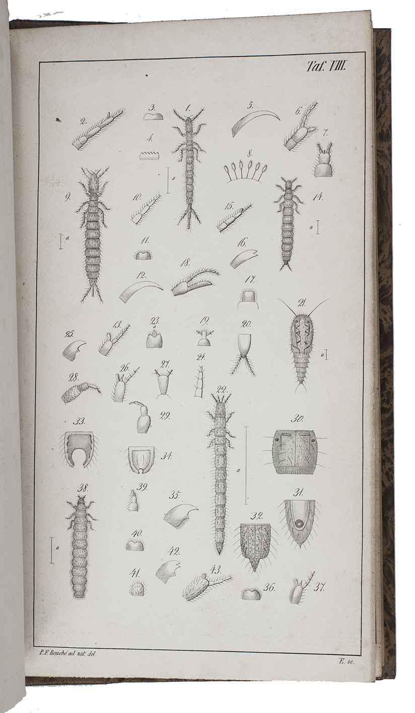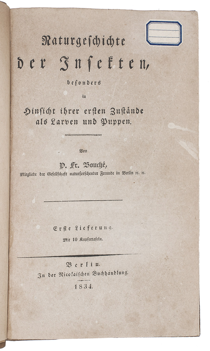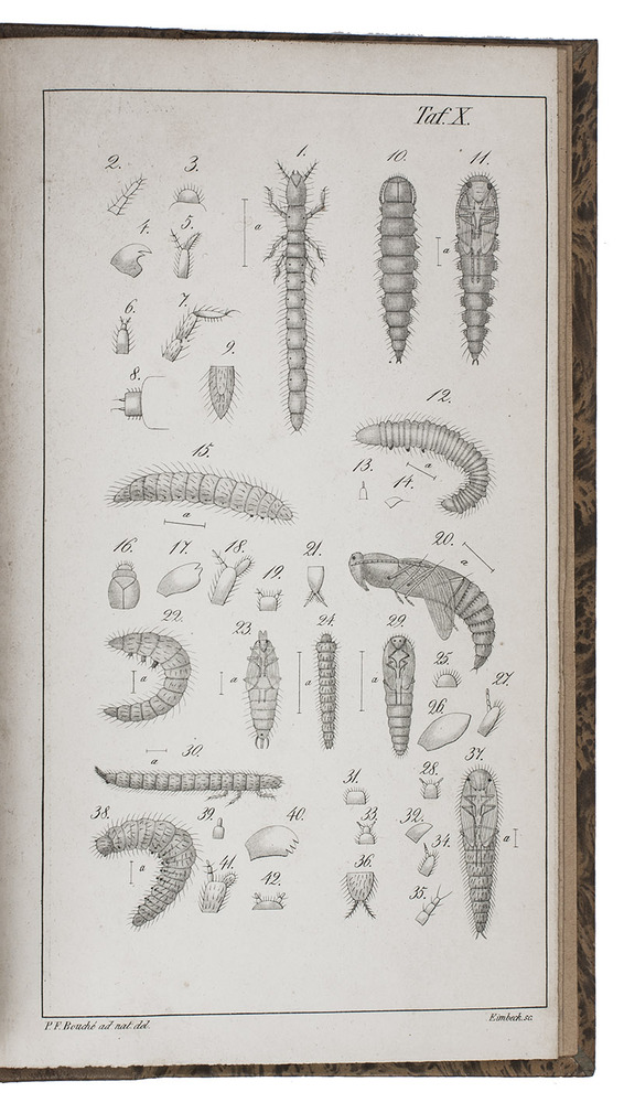 First edition of a study on larvae and pupae by the German entomologist and botanist Peter Friedrich Bouché (1784-1856), who was the institutional gardener at the Botanical Garden at Schöneberg. It includes many different insects, describing the appearance of their larvae and pupae and the process of their metamorphoses, also depicted on the lithographed plates. The title-page mentions this work to be the first instalment, but no subsequent instalments were published.