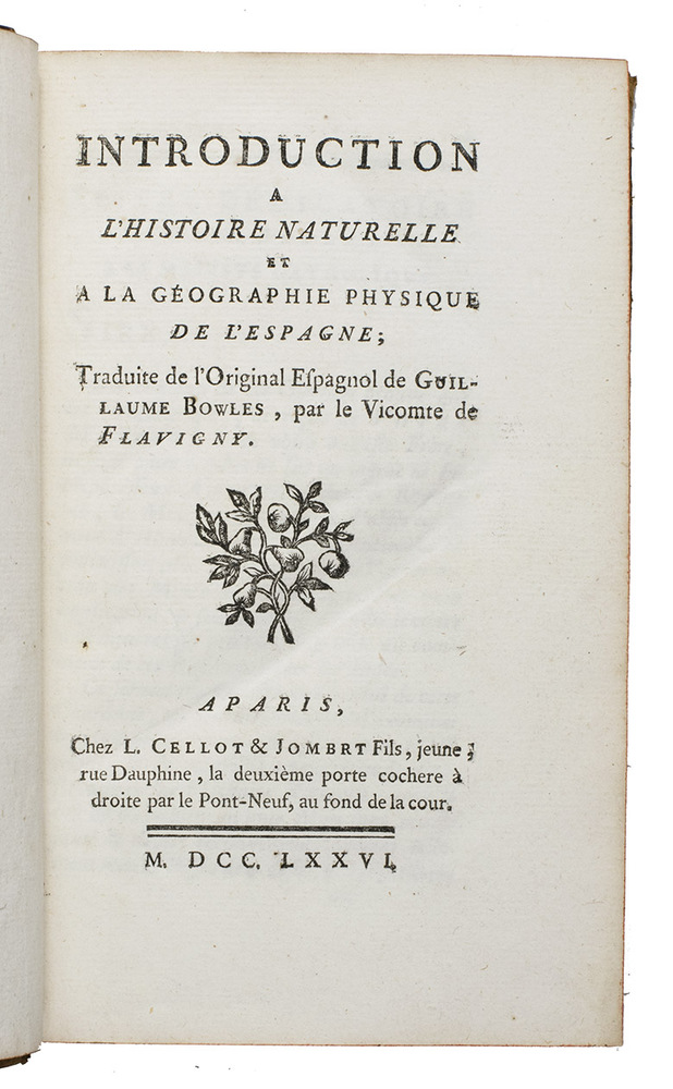 Introduction à l'histoire naturelle et à la géographie physique de l' Espagne; traduit de l'original espagnol de Guillaume Bowles, par le vicomte de Flavigny.