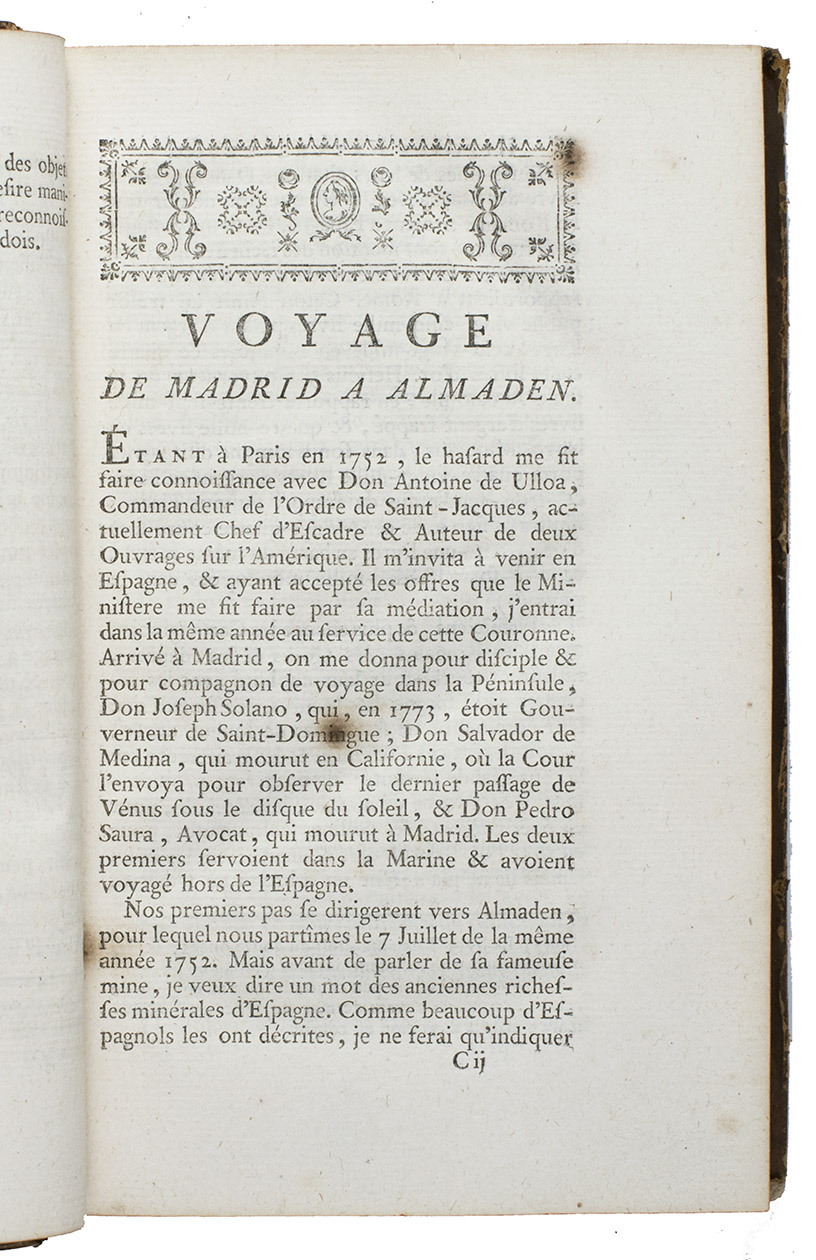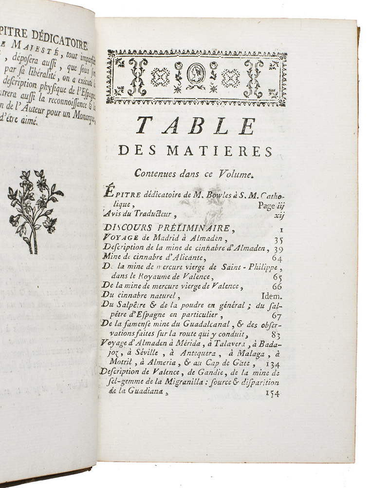 Very rare first edition of the French translation of a work on the natural history and geography of Spain and Spanish America by William Bowles. A large part is devoted to mining and the geological resources of Spain and its colonies. Bowles (1705-1780) was born in Cork, England, but travelled to Spain and was appointed superintendent of the Spanish mines. Bowles' main work Introduction... is considered valuable as it is the first work of its kind.