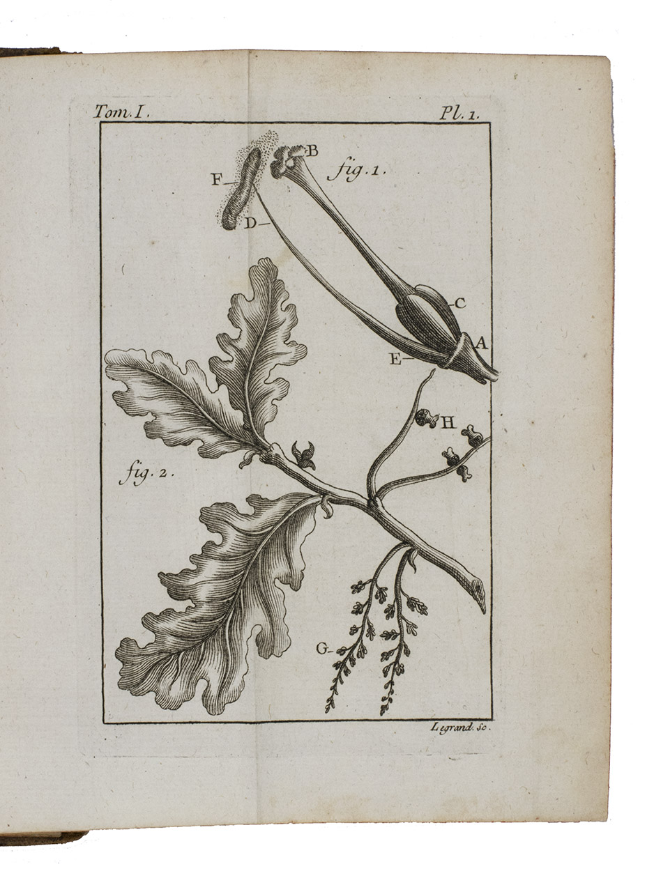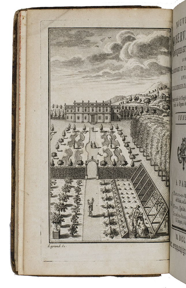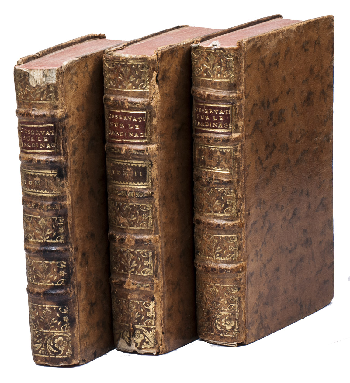 Paris, Pierre-Aug. Paulus du Mesnil, Jean-Luc Nyon, & Siméon-Prosper Hardy (colophons: printing offices of Moreau (vol. II) and Aug. Mart. Lottin (vol. III)), 1756. 3 volumes. 12mo. Engraved frontispiece depicting the gardens of a country estate, and 12 numbered folding engraved plates by Pierre-François Legrand, showing all kinds of flowers, garden lay-outs, insects etc., including 3 very interesting plates of a greenhouse (plan, interior and exterior views) in vol. 3 Contemporary mottled tanned sheepskin. frontispiece plus XXXVI, 358, [2]: [4 blank?], [5], X-XVI, 510, [2 blank]; [2], 12, "442"[=440] pp.