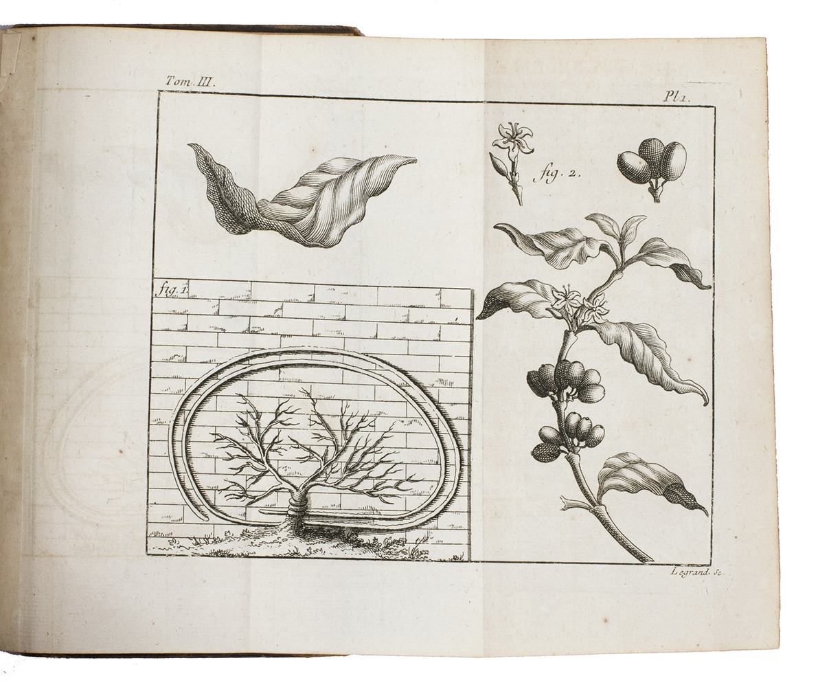 Spines damaged (mostly at the heads and feet, but with the loss of the headbands), hinges and board edges worn; some minor foxing and with a crease in the half-title of vol. III, but still in good condition. Oxford companion to gardens, p. 70; Pritzel 1076; cf. Hünersdorff, Coffee: a bibliography, pp. 174-175.