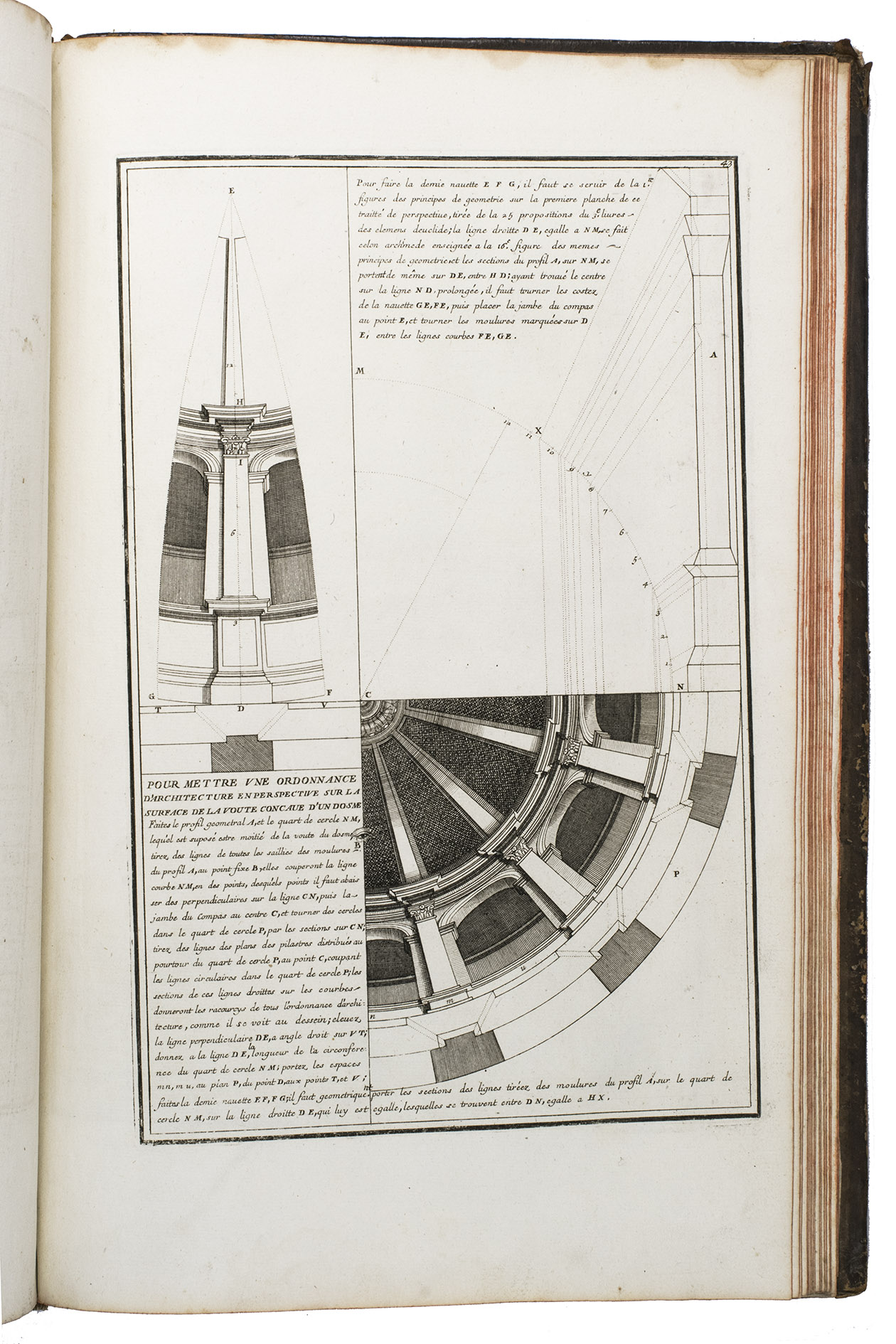 Enlarged edition of an extensive pictorial course in practical perspective for use of artists, architects and professional draughtsmen, with 60 large and beautifully engraved plates. The course starts with the principles of geometry, and then delves into columns, arches, vaulted ceilings, staircases, perspective for the theatre, and military perspective, including fortifications. It was created by architect and cartographer Louis Bretez (d. 1737), who is well known for designing the famous "plan de Turgot", a splendid bird's eye view of Paris. La perspective pratique de l'architecture is his book and was first published in 1706. The present edition is the second, which has been enlarged with five additional plates.
